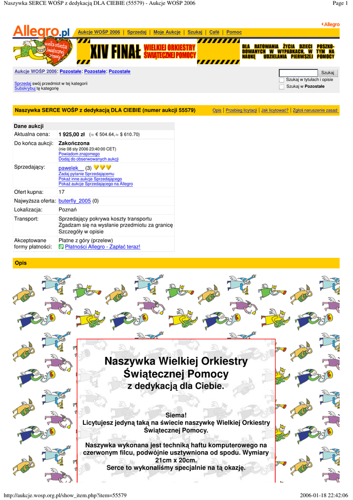 Naszywka SERCE WOŚP z dedykacją DLA CIEBIE (55579) - Aukcje WOŚP 2006 Page 1 Aukcje WOŚP 2006 | Sprzedaj | Moje Aukcje | Szukaj | Café | Pomoc Aukcje WOŚP 2006: Pozostałe: Pozostałe: Pozostałe Szukaj Szukaj w tytułach i opisie Sprzedaj swój przedmiot w tej kategorii Subskrybuj tę kategorię Szukaj w Pozostałe Naszywka SERCE WOŚP z dedykacją DLA CIEBIE (numer aukcji 55579) Dane aukcji Aktualna cena: Opis | Przebieg licytacji | Jak licytować? | Zgłoś naruszenie zasad 1 925,00 zł (≈ € 504.64,≈ $ 610.70) Do końca aukcji: Zakończona (nie 08 sty 2006 23:40:00 CET) Powiadom znajomego Dodaj do obserwowanych aukcji Sprzedający: pawelek__ (3) Zadaj pytanie Sprzedającemu Pokaż inne aukcje Sprzedającego Pokaż aukcje Sprzedającego na Allegro Ofert kupna: 17 Najwyższa oferta: buterfly_2005 (0) Lokalizacja: Poznań Transport: Sprzedający pokrywa koszty transportu Zgadzam się na wysłanie przedmiotu za granicę Szczegóły w opisie Akceptowane formy płatności: Płatne z góry (przelew) Płatności Allegro - Zapłać teraz! Opis Naszywka Wielkiej Orkiestry Świątecznej Pomocy z dedykacją dla Ciebie. Siema! Licytujesz jedyną taką na świecie naszywkę Wielkiej Orkiestry Świątecznej Pomocy. Naszywka wykonana jest techniką haftu komputerowego na czerwonym filcu, podwójnie usztywniona od spodu. Wymiary 21cm x 20cm. Serce to wykonaliśmy specjalnie na tą okazję. http://aukcje.wosp.org.pl/show_item.php?item=55579 2006-01-18 22:42:06 Naszywka SERCE WOŚP z dedykacją DLA CIEBIE (55579) - Aukcje WOŚP 2006 Page 2 Ta naszywka to 50 000 uderzeń igły maszyny haftującej, mamy nadzieję, że za uzyskaną dzięki Wam sumę nie jedno poszkodowane serce uderzać będzie znacznie dłużej. Dedykacja dla Ciebie? Jeżeli cena naszywki osiągnie 500 zł, zobowiązujemy się do wyhaftowania na niej dodatkowo podziękowań, może to być np. Twoje imię, nazwisko, nazwa firmy lub jej prosty logotyp itp. Taki produkt to doskonała pamiątka dla Ciebie lub Twojej firmy. Odpowiednio oprawiony (np. w antyramę) będzie pięknym elementem dekoracyjnym. Po zakończeniu licytacji system aukcyjny WOŚP wyśle do zwycięzcy numer konta, na który należy wpłacić wylicytowaną sumę. Po zaksięgowaniu wpłaty przez Wielką Orkiestrę Świątecznej Pomocy wysyłam naszywkę listem poleconym na mój koszt. Uwaga! Ważna informacja od WOŚP dla osób licytujących powyżej 1000zł: Informujemy, iż każdy z Uczestników Aukcji Allegro – WOŚP, u którego suma oferowanej kwoty w aukcjach trwających oraz zakończonych zwycięstwem, ale nie sfinalizowanych (brak potwierdzenia wpłaty) przekroczy ustaloną przez Fundację Wielkiej Orkiestry Świątecznej Pomocy kwotę progową 1000 zł, zostanie poproszony o autoryzację środków na specjalnej stronie Płatności Allegro. Więcej informacji tutaj. Zapraszam do licytacji Paweł Kontakt ze mną: [email protected] Numer GG: 1733122 Tel: 507343213 Pozdrawiamy Naszywki.com.pl Kliknij na duże zdjęcie, aby zobaczyć w wysokiej rozdzielczości. Pokaż obrazek w nowym oknie http://aukcje.wosp.org.pl/show_item.php?item=55579 2006-01-18 22:42:06 Naszywka SERCE WOŚP z dedykacją DLA CIEBIE (55579) - Aukcje WOŚP 2006 Page 3 Dodano 2006-01-05 21:35 Hej Hej, przed nami jeszcze tylko trzy dni licytacji!! Aukcję widziało już ponad 1000 osób, mamy już 11 licytujących i o wiele więcej osób obserwujących aukcję! Nie pozwólmy zatrzymać się wartości serduszka w miejscu. Serce jest już warte ponad 100zł, jest to 100zł, które będzie przekazane dla ratowania życia dzieci poszkodowanych w wypadkach, a pieniędzy potrzeba jeszcze dużo. Zalicytuj, nikt na tym nie straci!!! Przypominam, zwycięzca wpłaca wylicytowaną sumę bezpośrednio na konto Orkiestry! Nie ma tu żadnych pośredników, ani żadnych możliwości aby pieniądze trafiły w niepowołane ręce. Naszywkę wysyłam na mój koszt listem poleconym! Niech setki metrów nici zamieni się w wartości ponad materialne! Nie znalazłeś na aukcjach WOŚP niczego dla siebie? Poszukaj dokładnie, każda tutaj aukcja oferuje wygranie radości. Zapraszam Dodano 2006-01-07 23:03 Witajcie Jeszcze tylko 24 godziny aukcji i tylko kilka godzin do rozpoczęcia Wielkiego Finału Orkiestry. Dzieki wszystkim licytującym, ale to chyba nie koniec Waszej aktywności??? :):) Zapraszam wszystkich do licytacji ! Przypominam.. 2go takiego Serduszka nie ma.. i nie będzie! Siema Paweł p.s Zapraszam również do obejrzenia innych moich aukcji, Znajdziesz tam między innymi: - Jeden Grosz w rewelacyjnej cenie tylko 5zł - jeszcze tylko 24 godziny! Adres aukcji: http://aukcje.wosp.org.pl/show_ item.php?item=57760 Dodano 2006-01-08 23:08 Hej.. 30 minut do konca, chyba najważniejszy moment dla każdej internetowej licytacji.. Dzięki wszystkim którzy licytują i ciągle gorąco zapraszam wszystkich innych odwiedzających tą aukcje! Zapewniam, że WARTO! Nie wierzysz? Zobacz jak serduszko wygląda w WYSOKIEJ ROZDZIELCZOŚCI, kliknij na większe zdjęcie, które znajduje się nad tym tekstem i SPRAWDŹ. Paweł Historia licytacji Użytkownik Kwota Data buterfly_2005 (0) 1925.00 nie 08 sty 2006 23:28:14 CET kulek35 (0) 1900.00 nie 08 sty 2006 23:38:49 CET Bogdan69_2004 (0) 1400.00 nie 08 sty 2006 23:33:16 CET nietoska (0) 500.00 nie 08 sty 2006 22:38:18 CET HASEE (0) 400.00 nie 08 sty 2006 19:52:31 CET curodent (0) 380.00 sob 07 sty 2006 23:14:35 CET Suchy9876 (0) 360.00 nie 08 sty 2006 11:13:47 CET adrianasza (0) 255.00 sob 07 sty 2006 18:38:19 CET kaja5555 (1) 161.00 czw 05 sty 2006 23:15:11 CET Sekator 2865 (0) 106.00 sob 31 gru 2005 00:51:39 CET Oliwa (0) 101.00 wto 27 gru 2005 22:18:21 CET mikolaj__ (0) 70.00 wto 27 gru 2005 13:19:57 CET Olina62 (0) 60.00 pon 26 gru 2005 23:37:23 CET zyg_muncik (0) 11.50 pon 26 gru 2005 16:16:45 CET johnsonik (0) 11.00 pon 26 gru 2005 13:41:38 CET http://aukcje.wosp.org.pl/show_item.php?item=55579 2006-01-18 22:42:06 Naszywka SERCE WOŚP z dedykacją DLA CIEBIE (55579)