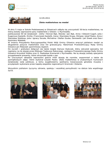 Miasto Żywiec 34-300 Żywiec, Rynek 2 33-475-42-00, 33-475-42-01 12.05.2011 Złote małżeństwa na medal W dniu 5 maja w Szkole Podstawowej w Gilowicach odbyła się uroczystość 50-lecia małżeństwa, na którą zostały zaproszone pary małżeńskie z Gilowic i z Rychwałdu. Jubileuszowe 50 lat świętowali : Zofia i Henryk Bąk, Wanda i Jan Bąk, Anna i Edward Cygoń, Julia i Eugeniusz Kastelik, Emilia i Franciszek Kastelik, Irena i Stanisław Krupa, Olimpia i Józef Pasko, Anna i Stanisław Stokłosa, Julia i Ignacy Socała, Michalina i Stefan Szuba, Genowefa i Jan Siwek oraz Ewa i Kazimierz Walatek. W imieniu Prezydenta Rzeczypospolitej Polski Wójt Gminy Gilowice wręczył jubilatom medal za długoletnie pożycie małżeńskie oraz list gratulacyjny. Natomiast Przewodniczący Rady Gminy Gilowice Jan Małysiak upominkowy dyplom. Do życzeń i gratulacji dołączyli się także ksiądz Dariusz Dybczak, który odczytał specjalny list napisany na tę okazję przez Biskupa Tadeusza Rakoczego, zastępca Przewodniczącego Rady Gminy Gilowice Krzysztof Hubka oraz O. Radosław Kramarski z Rychwałdu. Na tę okazję zostały specjalnie przygotowane prezenty, które otrzymała każda z par. Po uroczystym obiedzie zaproszeni goście mieli okazję do rozmów, wspomnień a także do pamiątkowych zdjęć, które wykonał Leszek Pasko. Złote małżeństwa w znakomitych humorach świętowały swój jubileusz, a temu wyjątkowemu spotkaniu towarzyszyła góralska muzyka i przyśpiewki wykonane przez kapelę zespołów regionalnych Gronicek i Dolanie. Wszystkim jubilatom życzymy zdrowia, spokoju i wszelkiej pomyślności na dalsze lata wspólnego życia. Strona 1/1 Powered by TCPDF (www.tcpdf.org)