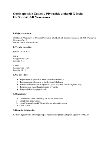 Ogólnopolskie Zawody Pływackie z okazji X-lecia UKS SKALAR Warszawa 1.Miejsce zawodów: OSiR m.st. Warszawy w Ursusie Pływalnia SKALAR ul. Sosnkowskiego 3 02-495 Warszawa Liczba torów: 6 Pomiar czasu: elektroniczny 2. Termin zawodów: Sobota 10.10.2015r I blok Rozgrzewka 8.30 Zawody 9.15 II blok Rozgrzewka 15.30 Zawody 16.15 3. Cel zawodów: Popularyzacja pływania wśród dzieci i młodzieży Popularyzacja pływania w środowisku lokalnym Upowszechnianie zdrowego trybu życia oraz idei rywalizacji fair play Promowanie zasad bezpiecznego pływania integracja klubów pływackich 4. Organizator: Uczniowski Klub Sportowy SKALAR Warszawa Urząd Dzielnicy Ursus Urząd Marszałkowski Województwa Mazowieckiego OSiR Ursus 5. Komisja Sędziowska: Komisję Sędziowska sprawuje zespół wyznaczony przez Kolegium Sędziów WMOZP 6. Uczestnictwo: W zawodach mogą uczestniczyć wszystkie kluby PZP - zawodnicy posiadający aktualne badania lekarskie i objęci ubezpieczeniem NNW. Za aktualne badania lekarskie odpowiadają kierownicy/trenerzy ekip. - kategorie wiekowe 2006 2005 2004 2002 – 2001 2000 i starsi - każdy zawodnik ma prawo startu w dowolnej ilości konkurencji i sztafecie mieszanej - udział w zawodach jest jednoznaczny wyrażeniem zgody organizatorom na przetwarzanie danych osobowych i wizerunku w zakresie promocji i relacji z imprez 7. Program zawodów I blok Rozgrzewka 8.30 Zawody 9.15 Dystans 50 metrów 100 metrów 50 metrów 100 metrów 50 metrów 100 metrów 50 metrów 100 metrów 100 metrów 6 x 50 metrów Styl Dowolny dziewcząt i chłopców Dowolny dziewcząt i chłopców Klasyczny dziewcząt i chłopców Klasyczny dziewcząt i chłopców Grzbietowy dziewcząt i chłopców Grzbietowy dziewcząt i chłopców Motylkowy dziewcząt i chłopców Motylkowy dziewcząt i chłopców Zmienny dziewcząt i chłopców Sztafeta mieszana styl dowolny po jednym zawodniku i zawodniczce z każdej kategorii wiekowej roczniki 2006 2005/ 2004 2006 2005/2004 2006 2005/2004 2006 2005/2004 2006/2005/200 4 II blok Rozgrzewka 15.30 Zawody 16.15 Dystans 100 metrów 100 metrów 100 metrów 100 metrów 200 metrów 8x50 metrów Styl Dowolny dziewcząt i chłopców Klasyczny dziewcząt i chłopców Grzbietowy dziewcząt i chłopców Motylkowy dziewcząt i chłopców Zmienny dziewcząt i chłopców Sztafeta mieszana styl dowolny po dwóch zawodników i dwie zawodniczki z każdej kategorii wiekowej Roczniki 2002/2001/2000 i starsi 2002/2001/2000 i starsi 2002/2001/2000 i starsi 2002/2001/2000 i starsi 2002/2001/2000 i starsi 8. Przepisy techniczno – organizacyjne Zawody zostaną rozegrane seriami na czas Zawodnicy będą rozstawieni na podstawie czasów w seriach od najwolniejszej do najszybszej Zawody zostaną przeprowadzone zgodnie z przepisami PZP Każdy klub może wystawić jedna drużynę sztafetową w konkursie W wyścigach sztafetowych w razie braku starszego rocznika dopuszcza się start zawodnika młodszego Dekoracja za poszczególne konkurencje będą przeprowadzone w trakcie zawodów Rzeczy wartościowe opiekunowie i zawodnicy zobowiązani są zabezpieczyć we własnym zakresie, należy również pamiętać o prawidłowym zamknięciu szafek Pomiar czasu elektroniczny W sprawach nie objętych regulaminem decyduje Sędzia Główny w porozumieniu z Organizatorem 9. Zgłoszenia Wszystkie zgłoszenia na zawody należy wypełnić w programie Entry Edytor i wysłać na adres e-mail : [email protected] Zgłoszenia proszę nadsyłać do 07.10.2015r Lista zgłoszonych zawodników ukaże się w dniu 08.10.2015r. Po opublikowaniu w internecie listy zgłoszonych zawodników, zmiany mogą być wykonywane wyłącznie pocztą elektroniczna do dnia 09.10.2015r do godziny 16.00 i dotyczyć mogą wycofania zawodnika z konkurencji. Za zawodników nie wykreślonych w terminie będzie pobierana opłata startowa 10. Nagrody Najlepszych sześciu zawodników w poszczególnych kategoriach wiekowych , w każdej konkurencji otrzymuje medale od 1-3 miejsca , dyplomy od 1-6 miejsca oraz upominki Dla najlepszych sześciu zawodników w poszczególnych kategoriach wiekowych w punktacji Fina( za dwa najlepsze wyniki w punktacji ) nagrody rzeczowe. Najlepsze trzy sztafety w poszczególnych kategoriach wiekowych ( sztafeta mieszana) otrzymają Puchar Prezesa UKS SKALAR ,Tort i nagrody rzeczowe. Podczas zawodów odbędzie się losowanie atrakcyjnych nagród rzeczowych (tj rowery, tablety) ZAPRASZAMY SERDECZNIE DO UDZIAŁU W ZAWODACH Z OKAZJI 10LECIA UKS SKALAR w Ursusie 11.Opłata startowa i zasady finansowania - opłata startowa wynosi 15zł od startu- płatna w biurze zawodów lub przelewem na konto ing śląski 3610 5019 2410 0000 9135 0569 28 Opłata będzie pobierana za wszystkich zawodników zgłoszonych z poszczególnych klubów. Zawodnicy którzy nie będą wycofani w przewidzianym terminie nie będą zwolnieni z opłat. -Koszty organizacyjne pokrywa organizator -Koszty uczestnictwa pokrywają kluby 12.Informacja dodatkowa Istnieje możliwość rezerwacji noclegu oraz wyżywienia osoba koordynująca Artur Przywara tel 889- 861 -200 e-mail [email protected]