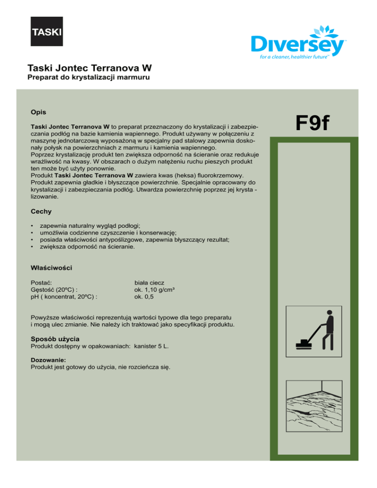 Taski Jontec Terranova W Preparat do krystalizacji marmuru Opis Taski Jontec Terranova W to preparat przeznaczony do krystalizacji i zabezpieczania podłóg na bazie kamienia wapiennego. Produkt używany w połączeniu z maszynę jednotarczową wyposażoną w specjalny pad stalowy zapewnia doskonały połysk na powierzchniach z marmuru i kamienia wapiennego. Poprzez krystalizację produkt ten zwiększa odporność na ścieranie oraz redukuje wrażliwość na kwasy. W obszarach o dużym natężeniu ruchu pieszych produkt ten może być użyty ponownie. Produkt Taski Jontec Terranova W zawiera kwas (heksa) fluorokrzemowy. Produkt zapewnia gładkie i błyszczące powierzchnie. Specjalnie opracowany do krystalizacji i zabezpieczania podłóg. Utwardza powierzchnię poprzez jej krysta lizowanie. Cechy • • • • zapewnia naturalny wygląd podłogi; umożliwia codzienne czyszczenie i konserwację; posiada właściwości antypoślizgowe, zapewnia błyszczący rezultat; zwiększa odporność na ścieranie. Właściwości Postać: Gęstość (20ºC) : pH ( koncentrat, 20ºC) : biała ciecz ok. 1,10 g/cm³ ok. 0,5 Powyższe właściwości reprezentują wartości typowe dla tego preparatu i mogą ulec zmianie. Nie należy ich traktować jako specyfikacji produktu. Sposób użycia Produkt dostępny w opakowaniach: kanister 5 L. Dozowanie: Produkt jest gotowy do użycia, nie rozcieńcza się. F9f Taski Jontec Terranova W Sposób użycia - cdn. Produkt należy stosować tylko na czyste i suche powierzchnie (wolne od różnego rodzaju zabrudzeń, wosków, past czyszczących, olei i tłuszczy). Produkt należy dobrze wstrząsnąć przed użyciem. Napełnić urządzenie spryskujące produktem i nanieść na daną podłogę (2 – 3 spryśnięcia / m2 ). Nie należy nanosić na więcej niż 2 m² na raz. Wcierać produkt w podłogę okrężnymi ruchami za pomocą maszyny jednotarczowej z odpowiednim padem (stalowowym) do czasu całkowitego wchłonięcia się produktu. W celu pozyskania większego połysku, czynność należy powtórzyć. Po zakończeniu procesu podłogę należy spłukać wodą, aż do osiągnięcia neutralnego pH. Dla osiągnięcia większego połysku podłogę należy wypolerować przy użyciu maszyny jednotarczowej. Uwaga Preparat należy tylko stosować na podłogach kamienno- wapiennych takich jak: marmur, trawertyn, lastryko. Uwaga Preparat przeznaczony do profesjonalnego stosowania. Dokładny sposób użycia preparatu, dostosowany do Państwa potrzeb określi nasz przedstawiciel handlowy. Postępowanie z odpadami Zapobiegać przedostawaniu się nierozcieńczonego produktu do ścieków, wód powierzchniowych i wód gruntowych. Chronić przed zanieczyszczeniem ujęcia wody pitnej. Produkt zużyć w całości. Niewielkie ilości niewykorzystanego produktu rozcieńczyć wodą do stężenia najwyżej 1%, odprowadzać do kanalizacji. Większe ilości przekazywać do utylizacji specjalistycznej firmie. Opróżnione opakowania przepłukać dwukrotnie wodą i przeznaczyć do recyklingu. Okres trwałości 24 miesiące od daty produkcji (data produkcji na opakowaniu). Warunki przechowywania Magazynować wyłącznie w oryginalnych, szczelnych opakowaniach. Nie przechowywać w temperaturze poniżej 6 ºC i w wysokich temperaturach. Kompletne informacje odnośnie środków ostrożności wymaganych przy pracy z preparatem znajdują się w karcie charakterystyki preparatu niebezpiecznego. Środki ostrożności i pierwsza pomoc Dodatkowe informacje odnośnie środków ostrożności wymaganych przy pracy z preparatem Taski Jontec Terranova W, ubocznych skutków stosowannia, zasad udzielania pierwszej pomocy, bezpiecznego postępowania z odpadami produktu i opakowaniem znajdują się w karcie charakterystyki. Diversey Polska Sp. z o.o. ul. Fabryczna 5 00-446 Warszawa Tel.: 22 328 10 00 Fax: 22 328 10 01 www.diversey.com © Copyright 2011 Diversey 2