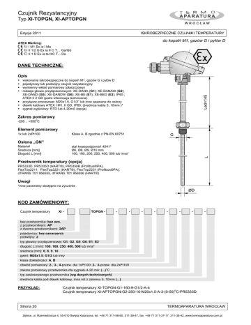 Czujnik Rezystancyjny Typ XI-TOPGN, XI-APTOPGN Edycja 2011 ISKROBEZPIECZNE CZUJNIKI TEMPERATURY do kopalń M1, gazów G i pyłów D ATEX Marking: I M1 Ex ia I Ma II 1/2 G Ex ia II C T… Ga/Gb II 1 D Ex ia ta IIIC T... Da DANE TECHNICZNE: Opis wykonanie iskrobezpieczne do kopalń M1, gazów G i pyłów D pojedynczy lub podwójny czujnik rezystancyjny wymienny wkład pomiarowy (płaszczowy) rodzaje głowic przyłączeniowych: XE-DANA (G1); XE-DANAW (G2); XE-DAND (G5); XE-DANDW (G6); XE-BE (E1); XE-BED (E2); IP65 ; ATEX II 2 GD (patrz informacja techniczna) przyłącze procesowe: M20x1.5, G1/2” lub inne spawane do osłony dławik kablowy ATEX I M1, II GD, IP65; (średnica kabla 5..10mm )* sygnał wyjściowy: RTD lub 4-20mA (opcja) Zakres pomiarowy o -200 .. +550 C Element pomiarowy 1x lub 2xPt100 Klasa A, B zgodnie z PN-EN 60751 Osłona „GN” Materiał Średnica [mm] Długość L [mm] stal kwasoodporna1.4541* Ø6, Ø8, Ø9, Ø10 mm 100, 160, 200, 250, 400, 500 lub inna* Przetwornik temperatury (opcja) PR5333D, PR5335D (HART®), PR5350B (Profibus®PA), FlexTop2211, FlexTop2221 (HART®), FlexTop2231 (Profibus®PA), dTRANS T01 956555, dTRANS T01 956556 (HART®) Uwagi *inne parametry dostępne na życzenie KOD ZAMÓWIENIOWY: Czujnik temperatury XI - TOPGN - - - - - - - - - bez przetwornika: bez ozn. z przetwornikiem: AP z dwoma przetwornikami: 2AP pojedynczy: bez oznaczenia podwójny: 2 typ głowicy przyłączeniowej: G1, G2, G5, G6, E1, E2 długość L [mm]: 100, 160, 250, 400, 500 lub inna* średnica [mm]: 6, 8, 9, 10 gwint: M20x1.5; G1/2 lub inny klasa dokładności: A, B obwód pomiarowy: 2-, 3-, 4-przew. dla 1xPt100; 2-, 3-przew. dla 2xPt100 o zakres pomiarowy przetwornika dla sygnału 4-20 mA: (...) C typ zastosowanego przetwornika (wg danych technicznych) średnica kabla pod dławik kablowy, inna niż z zakresu 5..10mm (...) PRZYKŁAD: Strona 20 Czujnik temperatury XI-TOPGN-G1-160-9-G1/2-A-4 Czujnik temperatury XI-APTOPGN-G2-250-10-M20x1.5-A-3-(0-50)oC-PR5333D TERMOAPARATURA WROCŁAW Zębice, ul. Rzemieślnicza 4, 55-010 Święta Katarzyna, tel. +48 71 311-58-60, 311-38-47, fax. +48 71 311-37-17, 311-38-42, www.termoaparatura.com.pl