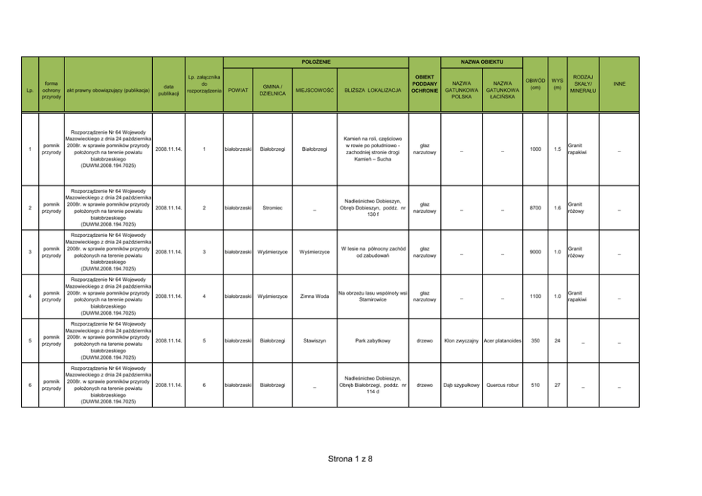 POŁOŻENIE Lp. załącznika do rozporządzenia 1 Rozporządzenie Nr 64 Wojewody Mazowieckiego z dnia 24 października pomnik 2008r. w sprawie pomników przyrody 2008.11.14. położonych na terenie powiatu przyrody białobrzeskiego (DUWM.2008.194.7025) forma ochrony przyrody RODZAJ SKAŁY/ MINERAŁU OBWÓD (cm) WYS (m) _ 1000 1.5 Granit rapakiwi _ _ _ 8700 1.6 Granit różowy _ głaz narzutowy _ _ 9000 1.0 Granit różowy _ Na obrzeżu lasu wspólnoty wsi Stamirowice głaz narzutowy _ _ 1100 1.0 Granit rapakiwi _ Stawiszyn Park zabytkowy drzewo Klon zwyczajny Acer platanoides 350 24 _ _ _ Nadleśnictwo Dobieszyn, Obręb Białobrzegi, poddz. nr 114 d drzewo Dąb szypułkowy Quercus robur 510 27 _ _ NAZWA GATUNKOWA ŁACIŃSKA głaz narzutowy _ Nadleśnictwo Dobieszyn, Obręb Dobieszyn, poddz. nr 130 f głaz narzutowy Wyśmierzyce W lesie na północny zachód od zabudowań Wyśmierzyce Zimna Woda białobrzeski Białobrzegi białobrzeski Białobrzegi POWIAT MIEJSCOWOŚĆ BLIŻSZA LOKALIZACJA 1 białobrzeski Białobrzegi Białobrzegi Kamień na roli, częściowo w rowie po południowo zachodniej stronie drogi Kamień – Sucha 2 Rozporządzenie Nr 64 Wojewody Mazowieckiego z dnia 24 października pomnik 2008r. w sprawie pomników przyrody 2008.11.14. położonych na terenie powiatu przyrody białobrzeskiego (DUWM.2008.194.7025) 2 białobrzeski Stromiec _ 3 Rozporządzenie Nr 64 Wojewody Mazowieckiego z dnia 24 października 2008r. w sprawie pomników przyrody pomnik 2008.11.14. przyrody położonych na terenie powiatu białobrzeskiego (DUWM.2008.194.7025) 3 białobrzeski Wyśmierzyce 4 Rozporządzenie Nr 64 Wojewody Mazowieckiego z dnia 24 października pomnik 2008r. w sprawie pomników przyrody 2008.11.14. przyrody położonych na terenie powiatu białobrzeskiego (DUWM.2008.194.7025) 4 białobrzeski 5 Rozporządzenie Nr 64 Wojewody Mazowieckiego z dnia 24 października pomnik 2008r. w sprawie pomników przyrody 2008.11.14. przyrody położonych na terenie powiatu białobrzeskiego (DUWM.2008.194.7025) 5 6 Rozporządzenie Nr 64 Wojewody Mazowieckiego z dnia 24 października pomnik 2008r. w sprawie pomników przyrody 2008.11.14. przyrody położonych na terenie powiatu białobrzeskiego (DUWM.2008.194.7025) 6 akt prawny obowiązujący (publikacja) OBIEKT PODDANY OCHRONIE NAZWA GATUNKOWA POLSKA GMINA / DZIELNICA Lp. data publikacji NAZWA OBIEKTU Strona 1 z 8 INNE POŁOŻENIE Lp. załącznika do rozporządzenia 7 Rozporządzenie Nr 64 Wojewody Mazowieckiego z dnia 24 października pomnik 2008r. w sprawie pomników przyrody 2008.11.14. położonych na terenie powiatu przyrody białobrzeskiego (DUWM.2008.194.7025) forma ochrony przyrody OBWÓD (cm) WYS (m) RODZAJ SKAŁY/ MINERAŁU INNE Quercus robur 620 25 _ _ Dąb szypułkowy Quercus robur 325 24 _ _ drzewo Dąb szypułkowy Quercus robur 460 24 _ _ Park zabytkowy drzewo Dąb szypułkowy Quercus robur 310 24 _ _ Sucha Szlachecka Park zabytkowy drzewo Dąb szypułkowy Quercus robur 380 24 _ _ Białobrzegi Sucha Szlachecka Park zabytkowy drzewo Jesion wyniosły Fraxinus excelsior 470 26 _ _ Białobrzegi Sucha Szlachecka Park zabytkowy drzewo Dąb szypułkowy Quercus robur 340 26 _ _ NAZWA GATUNKOWA ŁACIŃSKA drzewo Dąb szypułkowy Nadleśnictwo Dobieszyn, Obręb Białobrzegi, poddz. nr 124 f drzewo Sucha Szlachecka Park zabytkowy Białobrzegi Sucha Szlachecka białobrzeski Białobrzegi 12 białobrzeski 13 białobrzeski POWIAT MIEJSCOWOŚĆ BLIŻSZA LOKALIZACJA 7 białobrzeski Białobrzegi _ Nadleśnictwo Dobieszyn, Obręb Białobrzegi, poddz. nr 75 h 8 Rozporządzenie Nr 64 Wojewody Mazowieckiego z dnia 24 października pomnik 2008r. w sprawie pomników przyrody 2008.11.14. przyrody położonych na terenie powiatu białobrzeskiego (DUWM.2008.194.7025) 8 białobrzeski Białobrzegi _ 9 Rozporządzenie Nr 64 Wojewody Mazowieckiego z dnia 24 października 2008r. w sprawie pomników przyrody pomnik 2008.11.14. przyrody położonych na terenie powiatu białobrzeskiego (DUWM.2008.194.7025) 9 białobrzeski Białobrzegi 10 Rozporządzenie Nr 64 Wojewody Mazowieckiego z dnia 24 października pomnik 2008r. w sprawie pomników przyrody 2008.11.14. przyrody położonych na terenie powiatu białobrzeskiego (DUWM.2008.194.7025) 10 białobrzeski 11 Rozporządzenie Nr 64 Wojewody Mazowieckiego z dnia 24 października pomnik 2008r. w sprawie pomników przyrody 2008.11.14. przyrody położonych na terenie powiatu białobrzeskiego (DUWM.2008.194.7025) 11 12 Rozporządzenie Nr 64 Wojewody Mazowieckiego z dnia 24 października pomnik 2008r. w sprawie pomników przyrody 2008.11.14. przyrody położonych na terenie powiatu białobrzeskiego (DUWM.2008.194.7025) 13 Rozporządzenie Nr 64 Wojewody Mazowieckiego z dnia 24 października pomnik 2008r. w sprawie pomników przyrody 2008.11.14. przyrody położonych na terenie powiatu białobrzeskiego (DUWM.2008.194.7025) akt prawny obowiązujący (publikacja) OBIEKT PODDANY OCHRONIE NAZWA GATUNKOWA POLSKA GMINA / DZIELNICA Lp. data publikacji NAZWA OBIEKTU Strona 2 z 8 POŁOŻENIE Lp. załącznika do rozporządzenia NAZWA OBIEKTU POWIAT GMINA / DZIELNICA MIEJSCOWOŚĆ BLIŻSZA LOKALIZACJA OBIEKT PODDANY OCHRONIE RODZAJ SKAŁY/ MINERAŁU INNE 14 Rozporządzenie Nr 64 Wojewody Mazowieckiego z dnia 24 października pomnik 2008r. w sprawie pomników przyrody 2008.11.14. położonych na terenie powiatu przyrody białobrzeskiego (DUWM.2008.194.7025) 14 białobrzeski Białobrzegi Sucha Szlachecka Park zabytkowy drzewo Dąb szypułkowy Quercus robur 340 26 _ _ 15 Rozporządzenie Nr 64 Wojewody Mazowieckiego z dnia 24 października pomnik 2008r. w sprawie pomników przyrody 2008.11.14. przyrody położonych na terenie powiatu białobrzeskiego (DUWM.2008.194.7025) 15 białobrzeski Białobrzegi Sucha Szlachecka Park zabytkowy drzewo Dąb szypułkowy Quercus robur 475 23 _ _ 16 Rozporządzenie Nr 64 Wojewody Mazowieckiego z dnia 24 października 2008r. w sprawie pomników przyrody pomnik 2008.11.14. przyrody położonych na terenie powiatu bi