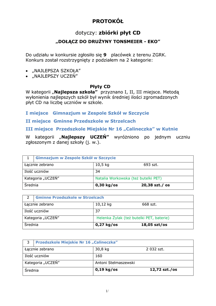 PROTOKÓŁ dotyczy: zbiórki płyt CD „DOŁĄCZ DO DRUŻYNY TONSMEIER - EKO” Do udziału w konkursie zgłosiło się 9 placówek z terenu ZGRK. Konkurs został rozstrzygnięty z podziałem na 2 kategorie: „NAJLEPSZA SZKOŁA” „NAJLEPSZY UCZEŃ” Płyty CD W kategorii „Najlepsza szkoła” przyznano I, II, III miejsce. Metodą wyłonienia najlepszych szkół był wynik średniej ilości zgromadzonych płyt CD na liczbę uczniów w szkole. I miejsce Gimnazjum w Zespole Szkół w Szczycie II miejsce Gminne Przedszkole w Strzelcach III miejsce Przedszkole Miejskie Nr 16 „Calineczka” w Kutnie W kategorii „Najlepszy UCZEŃ” zgłoszonym z danej szkoły (j. w.). 1 wyróżniono po jednym Gimnazjum w Zespole Szkół w Szczycie Łącznie zebrano 10,5 kg Ilość uczniów 34 Kategoria „UCZEŃ” Natalia Workowska (też butelki PET) Średnia 0,30 kg/os 2 693 szt. 20,38 szt./ os Gminne Przedszkole w Strzelcach Łącznie zebrano 10,12 kg Ilość uczniów 37 Kategoria „UCZEŃ” Średnia 3 uczniu 668 szt. Helenka Żylak (też butelki PET, baterie) 0,27 kg/os 18,05 szt/os Przedszkole Miejskie Nr 16 „Calineczka” Łącznie zebrano 30,8 kg Ilość uczniów 160 Kategoria „UCZEŃ” Antoni Stelmaszewski Średnia 0,19 kg/os 1/ 3 2 032 szt. 12,72 szt./os 4 Szkoła Podstawowa im. Mieczysławy Butler w Ostrowach Łącznie zebrano 17,40kg Ilość uczniów 190 Kategoria „UCZEŃ” Średnia 5 1 148 szt. Mateusz Flaszak, Oliwia Żak, Przemysław Szadkowski, Zuzanna Felner 0,09 kg/os 6,04 szt./os Przedszkole Miejskie Nr 15 „Bajka” w Kutnie Łącznie zebrano 12 kg Ilość uczniów 171 Kategoria „UCZEŃ” Miłosz Prokopiak (też baterie) Średnia 0,07 kg/os 6 792 szt. 4,63 szt./os Przedszkole Miejskie nr 5 „Stokrotka” w Kutnie Łącznie zebrano 7 kg Ilość uczniów 90 Kategoria „UCZEŃ” Aleksandra Pietruszka Średnia 0, 07kg/os 7 462 szt. Szkoła Podstawowa we Wroczynach Łącznie zebrano 3 kg Ilość uczniów 39 Kategoria „UCZEŃ” Jakub Jankiewicz Średnia 0, 07 kg/os. 8 5,13kg/os 198 szt. 5,07 szt./os Gimnazjum w Krzyżanowie Łącznie zebrano 4,09 kg Ilość uczniów 61 Kategoria „UCZEŃ” Klaudia Miszczak Średnia 0,06 kg/os 2/ 3 270 szt. 4,42 szt./os 9 Szkoła Podstawowa w Sługach Łącznie zebrano 4,27 kg Ilość uczniów 64 Kategoria „UCZEŃ” Michalina Woźniak Średnia 0,06 kg/os 281szt. 4,40 szt./os Dnia 16 grudnia 2016 r. w Kutnowskim Domu Kultury odbyło się uroczyste wręczenie nagród laureatom konkursu. Zbiórka objęła ok. 846 uczniów. Ogółem uczniowie zebrali około 99 kg płyt CD. Zakładając, że na 1kg przypada 60 sztuk płyt CD, to daje łącznie 5 940 szt. W przeliczeniu na ucznia ~7 sztuk lub 0,11 kg. 3/ 3