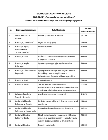 NARODOWE CENTRUM KULTURY PROGRAM „Promocja języka polskiego” Wykaz wniosków o dotacje rozpatrzonych pozytywnie Lp. Nazwa Wnioskodawcy Tytuł Projektu Kwota dofinansowania 1 Centrum Kultury Izabelin Polskie przysłowia w kadrze 13 110 2 Fundacja „5medium” Wgraj się w ojczysty 15 060 3 Fundacja Agaty Steczkowskiej „9 Fenomenów” Miłość w poezji 45 000 4 Fundacja Furu BAŚNIOSŁOWIE – interaktywne spotkanie z językiem polskim 40 000 5 Fundacja Języka Polskiego Język urzędowy przyjazny obywatelom 60 000 6 Fundacja Laboratorium Reportażu Język polski w relacjach o dziejach Bazaru Różyckiego. Warsztaty i konkurs Laboratorium Reportażu i liceów praskich 40 000 7 Fundacja Smok Czysty Ojczysty 23 020 8 Fundacja Voifia Sumasumarów – opracowanie i przeprowadzenie gry edukacyjnej on-line dla młodzieży szkolnej powiatu białostockiego 27 280 9 Gdańska Fundacja Terapii i Rozwoju Akademia tworzenia opowieści 31 065 10 Gminna Biblioteka Publiczna w Górnie Mnie ta mowa od innych droższa – nasz język codzienny 15 000 11 Gminna Biblioteka Publiczna w Koszarawie Mowa i godka pod Lachowym Groniem 13 500 12 Gminny Ośrodek Kultury w Besku Niech młodzi wiedzą i to poznają „iż Polacy nie gęsi, iż swój język mają” – popularyzacja wiedzy o języku polskim w gminie Besko 20 000 13 Gminny Ośrodek Poznaj i podaj dalej 10 000 Kultury w Tarnowie Opolskim 14 Malborskie Centrum Kultury i Edukacji Malborska Strażnica Słowa 30 000 15 Miejska Biblioteka Publiczna w Jaśle U-mówmy się na… polski 21 375 16 Miejsko-Gminny Ośrodek Kultury w Mordach Polszczyzna – mój skarb 15 300 17 Polskie Towarzystwo Turystyczno – Krajoznawcze Oddział w Mińsku Maz. Mów śmiało 20 000 18 Polski Związek Głuchych Koło Terenowe w Siedlcach Język polski-w zasięgu ręki 15 270 19 Powiatowa i Miejska Biblioteka Publiczna „Biblioteka pod Atlantami” w Wałbrzychu Szoruj język 17 600 20 Pro Futuro Stowarzyszenie na Rzecz Inicjatyw Lokalnych Polski. Lubię to! 12 000 21 Regionalny Ośrodek Kultury w Katowicach XV Ogólnopolski Konkurs Krasomówczy im. Wojciecha Korfantego 24 620 22 Służewski Dom Kultury Poezja miejska - Rap 30 000 23 Stowarzyszenie Autorów Filmowych Głosy 75 000 24 Stowarzyszenie Dziennikarzy i Dokumentalistów „Koncentrat” Wspólny mianownik 40 000 25 Stowarzyszenie im. Stanisława Brzozowskiego Zeszyt gier 25 000 26 Stowarzyszenie kobiety.lodz.pl Latające Babcie 30 000 27 Stowarzyszenie mieszkańców wsi Okrajnik i okolic Polszczyzna. Język NIE-obcy 14 000 28 Stowarzyszenie Ojczyzny Polszczyzny Konkurs Ojczyzny Polszczyzny dla szkół ponadgimnazjalnych 50 000 29 Stowarzyszenie „Pracownia Etnograficzna” im. Witolda Dynowskiego Wokabularz- elementarz językowy 17 000 30 Stowarzyszenie Twórców „Contur” Fantastyczna polszczyzna - 30 lat „Fantastyki” 40 000 31 Śródmiejskie Forum Kultury w Łodzi Puls Języka 50 000 32 Wszyscy Razem Dla Rozwoju i Integracji Barwy Języka Polskiego 45 000 33 Video Studio Gdańsk Fundacja Filmów i Programów Katolickich Realizacja i emisja cyklicznej audycji telewizyjnej pod tytułem roboczym: „Pokaż język czyli debata o stanie polszczyzny na Pomorzu” 74 800 RAZEM: 1 000 000