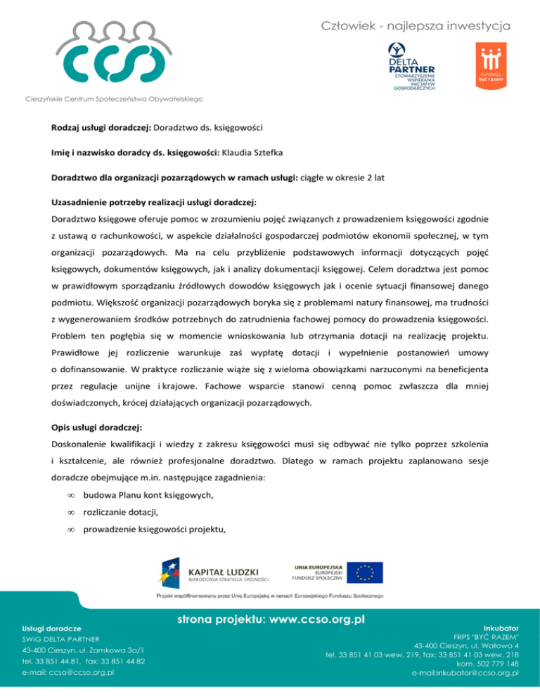 Rodzaj usługi doradczej: Doradztwo ds. księgowości Imię i nazwisko doradcy ds. księgowości: Klaudia Sztefka Doradztwo dla organizacji pozarządowych w ramach usługi: ciągłe w okresie 2 lat Uzasadnienie potrzeby realizacji usługi doradczej: Doradztwo księgowe oferuje pomoc w zrozumieniu pojęć związanych z prowadzeniem księgowości zgodnie z ustawą o rachunkowości, w aspekcie działalności gospodarczej podmiotów ekonomii społecznej, w tym organizacji pozarządowych. Ma na celu przybliżenie podstawowych informacji dotyczących pojęć księgowych, dokumentów księgowych, jak i analizy dokumentacji księgowej. Celem doradztwa jest pomoc w prawidłowym sporządzaniu źródłowych dowodów księgowych jak i ocenie sytuacji finansowej danego podmiotu. Większość organizacji pozarządowych boryka się z problemami natury finansowej, ma trudności z wygenerowaniem środków potrzebnych do zatrudnienia fachowej pomocy do prowadzenia księgowości. Problem ten pogłębia się w momencie wnioskowania lub otrzymania dotacji na realizację projektu. Prawidłowe jej rozliczenie warunkuje zaś wypłatę dotacji i wypełnienie postanowień umowy o dofinansowanie. W praktyce rozliczanie wiąże się z wieloma obowiązkami narzuconymi na beneficjenta przez regulacje unijne i krajowe. Fachowe wsparcie stanowi cenną pomoc zwłaszcza dla mniej doświadczonych, krócej działających organizacji pozarządowych. Opis usługi doradczej: Doskonalenie kwalifikacji i wiedzy z zakresu księgowości musi się odbywać nie tylko poprzez szkolenia i kształcenie, ale również profesjonalne doradztwo. Dlatego w ramach projektu zaplanowano sesje doradcze obejmujące m.in. następujące zagadnienia: • budowa Planu kont księgowych, • rozliczanie dotacji, • prowadzenie księgowości projektu, • podatek od towarów i usług, • rozliczanie z ZUS, • formy zatrudniania pracowników, • rozliczanie wynagrodzeń, w tym także osób zatrudnianych w projektach, • działalność statutowa a gospodarcza w organizacjach pozarządowych, • dokumenty i dowody księgowe. Warunki świadczenia usługi doradczej: Przewidziane doradztwo w tym zakresie przybierze głownie formę warsztatów kształtujących praktyczne umiejętności ich uczestników. W szczególności omawiane doradztwo świadczone będzie w sposób indywidualny (najczęściej w formie wizyt doradcy w siedzibie organizacji – zwłaszcza w odniesieniu do NGO spoza Cieszyna – po wcześniejszym umówieniu się poprzez przydzielonego Opiekuna Organizacji). Zostanie w ten sposób zachowana poufność danych finansowych. Jednakże w przypadku zebrania się grupy przedstawicieli NGO-sów zainteresowanych tym samym zagadnieniem, np. rozliczaniem dotacji z funduszy unijnych, istniała będzie możliwość przeprowadzenia doradztwa w szerszym gronie. Stosowane będą m.in. następujące metody: • indywidualna rozmowa, • praca w małych grupach, warsztaty, dyskusja. W projekcie nacisk kładziony będzie na indywidualne podejście do każdej organizacji biorącej w nim udział, dlatego usługi doradcze każdorazowo dostosowane zostaną do typu działania danej NGO (np. organizacja prowadząca działalność gospodarczą). Efekty skorzystania z doradztwa: Celem doradztwa jest pomoc funkcjonującym, jak i nowopowstającym organizacjom pozarządowym w prowadzeniu księgowości i sprawozdawczości finansowej. Doradztwo umożliwi wskazanie i rozwiązywanie głównych problemów związanych z księgową obsługą stowarzyszeń czy fundacji i to od strony praktycznej, nie ograniczając się jedynie do teorii, co jest szczególnie pożądane przez organizacje. Zostaną rozwiane wątpliwości korzystających z tego rodzaju doradztwa co do prawidłowego prowadzenia księgowości, prowadzenia przez organizację rachunkowości, przygotowania planu kont, polityki rachunkowości w NGO, podatkowo-księgowych aspektów działalności gospodarczej NGO oraz w zakresie szeroko rozumianych finansów i podatków.