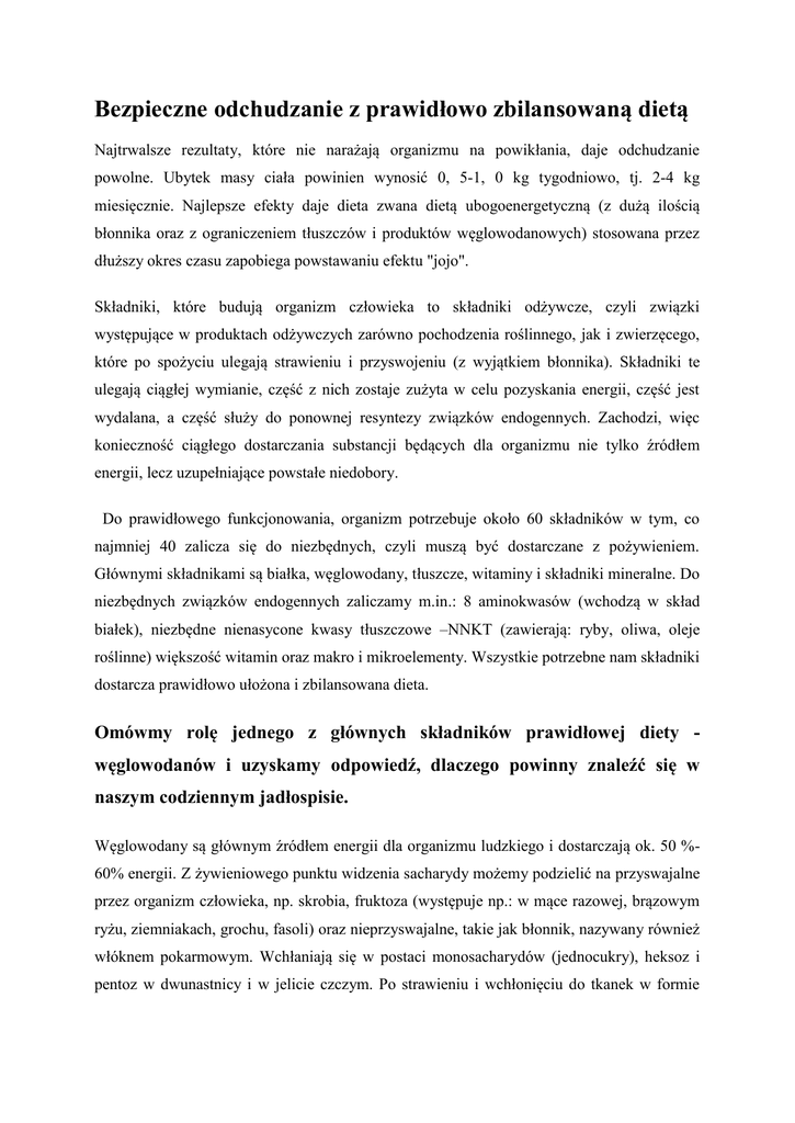 Bezpieczne odchudzanie z prawidłowo zbilansowaną dietą Najtrwalsze rezultaty, które nie narażają organizmu na powikłania, daje odchudzanie powolne. Ubytek masy ciała powinien wynosić 0, 5-1, 0 kg tygodniowo, tj. 2-4 kg miesięcznie. Najlepsze efekty daje dieta zwana dietą ubogoenergetyczną (z dużą ilością błonnika oraz z ograniczeniem tłuszczów i produktów węglowodanowych) stosowana przez dłuższy okres czasu zapobiega powstawaniu efektu "jojo". Składniki, które budują organizm człowieka to składniki odżywcze, czyli związki występujące w produktach odżywczych zarówno pochodzenia roślinnego, jak i zwierzęcego, które po spożyciu ulegają strawieniu i przyswojeniu (z wyjątkiem błonnika). Składniki te ulegają ciągłej wymianie, część z nich zostaje zużyta w celu pozyskania energii, część jest wydalana, a część służy do ponownej resyntezy związków endogennych. Zachodzi, więc konieczność ciągłego dostarczania substancji będących dla organizmu nie tylko źródłem energii, lecz uzupełniające powstałe niedobory. Do prawidłowego funkcjonowania, organizm potrzebuje około 60 składników w tym, co najmniej 40 zalicza się do niezbędnych, czyli muszą być dostarczane z pożywieniem. Głównymi składnikami są białka, węglowodany, tłuszcze, witaminy i składniki mineralne. Do niezbędnych związków endogennych zaliczamy m.in.: 8 aminokwasów (wchodzą w skład białek), niezbędne nienasycone kwasy tłuszczowe –NNKT (zawierają: ryby, oliwa, oleje roślinne) większość witamin oraz makro i mikroelementy. Wszystkie potrzebne nam składniki dostarcza prawidłowo ułożona i zbilansowana dieta. Omówmy rolę jednego z głównych składników prawidłowej diety węglowodanów i uzyskamy odpowiedź, dlaczego powinny znaleźć się w naszym codziennym jadłospisie. Węglowodany są głównym źródłem energii dla organizmu ludzkiego i dostarczają ok. 50 %60% energii. Z żywieniowego punktu widzenia sacharydy możemy podzielić na przyswajalne przez organizm człowieka, np. skrobia, fruktoza (występuje np.: w mące razowej, brązowym ryżu, ziemniakach, grochu, fasoli) oraz nieprzyswajalne, takie jak błonnik, nazywany również włóknem pokarmowym. Wchłaniają się w postaci monosacharydów (jednocukry), heksoz i pentoz w dwunastnicy i w jelicie czczym. Po strawieniu i wchłonięciu do tkanek w formie glukozy są utleniane do CO², dając energię, która jest wykorzystywana w miarę potrzeb organizmu. Wchłonięte monosacharydy transportowane są głównie do wątroby. Tylko glukoza jest bezpośrednio wykorzystywana w procesach spalania, pozostałe jednocukry muszą najpierw zostać przekształcone do glukozy. Organizm jednak nie posiada dużych możliwości magazynowania węglowodanów przyswajalnych. Zapasy glukozy występują w niewielkich ilościach w surowicy krwi, a głównie w postaci glikogenu w wątrobie, mięśniach i zapas ten wystarcza zaledwie na 12 godzin przy zapotrzebowaniu energetycznym 2800 kcal. W prawidłowo funkcjonującym organizmie musi być utrzymany stały poziom glukozy we krwi, dlatego węglowodany muszą być dostarczane z pożywieniem w miarę równomiernie w ciągu dnia. W przypadku niedostatecznej ich ilości w pożywieniu dochodzi do niecałkowitego spalania kwasów tłuszczowych i powstania ciał ketonowych, które zakwaszają nam organizm. Dlatego słuszne jest powiedzenie, że „tłuszcze spalają się w ogniu węglowodanów”. Glukoza jest wyłącznym źródłem energii mózgu, krwinek czerwonych oraz komórek części rdzennej nerek. Przy nie dostatecznej ilości węglowodanów w pożywieniu organizm syntetyzuje glukozę z białek, w ten sposób pozbywamy się masy mięśniowej, zamiast nagromadzonej tkanki tłuszczowej. Aby chronić białko przed spalaniem, utratą kationów głównie sodu i zapobiec odwodnieniu, musimy dostarczyć odpowiednią ilość węglowodanów i tłuszczów. Zaburzenia przemiany materii mogą być spowodowane niedoborem lub zaburzeniem funkcji enzymów, co powoduje upośledzenie trawienia, wchłaniania lub jest przyczyną nietolerancji substratów, które są nadmiernie gromadzone w wyniku bloków metabolicznych. Zaburzenia te są dziedziczne lub wynikają z błędów żywieniowych. W związku z powyższym nie należy przesadzać w spożywaniu węglowodanów, nadmierna ich podaż w codziennej diecie powoduje tworzenie materiału zapasowego. Szczególnie sacharoza, czyli cukier i słodycze, są przekształcane w tłuszcze i w tej postaci odkładają się w organizmie człowieka, prowadząc do rozwoju nadmiernej masy ciała: otyłości czy cukrzycy. Opracowała: Agnieszka Pierwoła Poradnia Dietetyczna Dietuss www.dietuss.pl Literatura dostępna u autora.