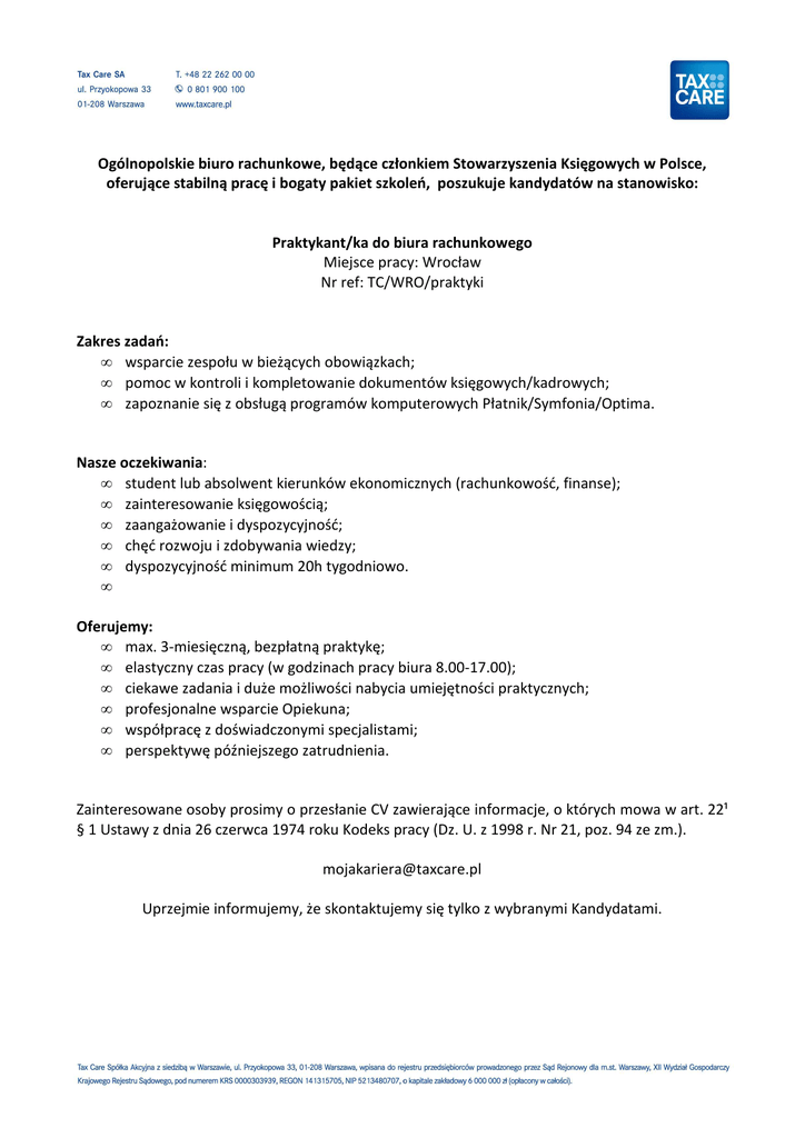Ogólnopolskie biuro rachunkowe, będące członkiem Stowarzyszenia Księgowych w Polsce, oferujące stabilną pracę i bogaty pakiet szkoleń, poszukuje kandydatów na stanowisko: Praktykant/ka do biura rachunkowego Miejsce pracy: Wrocław Nr ref: TC/WRO/praktyki Zakres zadań: • wsparcie zespołu w bieżących obowiązkach; • pomoc w kontroli i kompletowanie dokumentów księgowych/kadrowych; • zapoznanie się z obsługą programów komputerowych Płatnik/Symfonia/Optima. Nasze oczekiwania: • student lub absolwent kierunków ekonomicznych (rachunkowość, finanse); • zainteresowanie księgowością; • zaangażowanie i dyspozycyjność; • chęć rozwoju i zdobywania wiedzy; • dyspozycyjność minimum 20h tygodniowo. • Oferujemy: • max. 3-miesięczną, bezpłatną praktykę; • elastyczny czas pracy (w godzinach pracy biura 8.00-17.00); • ciekawe zadania i duże możliwości nabycia umiejętności praktycznych; • profesjonalne wsparcie Opiekuna; • współpracę z doświadczonymi specjalistami; • perspektywę późniejszego zatrudnienia. Zainteresowane osoby prosimy o przesłanie CV zawierające informacje, o których mowa w art. 22¹ § 1 Ustawy z dnia 26 czerwca 1974 roku Kodeks pracy (Dz. U. z 1998 r. Nr 21, poz. 94 ze zm.). [email protected] Uprzejmie informujemy, że skontaktujemy się tylko z wybranymi Kandydatami.