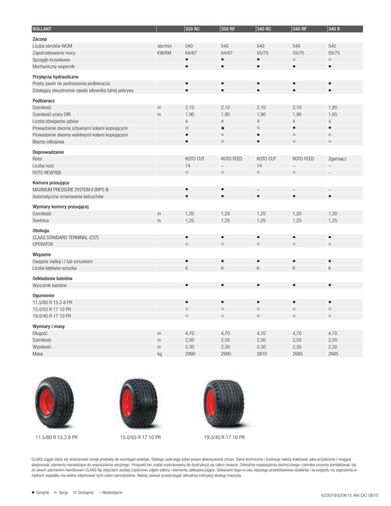 ROLLANT 350 RC 350 RF 340 RC 340 RF 340 R 540 64/87 540 64/87 540 55/75 540 55/75 540 55/75 ● ● ● ○ ○ ● ● ● ● ● ● ● ● ● ● ● ● ● ● ● 2,10 1,90 4 ○ 2,10 1,90 4 ● 2,10 1,90 4 2,10 1,90 4 1,85 1,65 4 ○ ● ● ● ○ ● ○ ○ ● ○ ● ○ ○ Doprowadzanie Rotor Liczba noży ROTO REVERSE ROTO CUT 14 ROTO FEED – ROTO CUT 14 ROTO FEED – ○ ○ ○ ○ Zgarniacz – – Komora prasująca MAXIMUM PRESSURE SYSTEM II (MPS II) Automatyczne smarowanie łańcuchów ● ● – – – ● ● ● ● ● 1,20 1,25 1,20 1,25 1,20 1,25 1,20 1,25 1,20 1,25 ● ● ● ● ● ○ ○ ○ ○ ○ Zaczep Liczba obrotów WOM Zapotrzebowanie mocy Sprzęgło krzywkowe Mechaniczny wspornik obr/min KW/KM Przyłącza hydrauliczne Prosty zawór do podnoszenia podbieracza Działający dwustronnie zawóe siłownika tylnej pokrywy Podbieracz Szerokość Szerokość pracy DIN Liczba dźwigarów zębów Prowadzenie dwoma sztywnymi kołami kopiującymi Prowadzenie dwoma wahliwymi kołami kopiującymi Blacha odbojowa Wymiary komory prasującej Szerokość Średnica m m m m Obsługa CLAAS STANDARD TERMINAL (CST) OPERATOR Wiązanie Owijanie siatką i / lub sznurkiem Liczba kłębków sznurka ● ● ● ● ● 6 6 6 6 6 Odkładanie balotów Wyrzutnik balotów ● ● ● ● ● ● ● ● ● ● ○ ○ ○ ○ ○ ○ ○ ○ ○ ○ 4,70 2,50 2,30 2990 4,70 2,50 2,30 2990 4,70 2,50 2,30 2810 4,70 2,50 2,30 2685 4,70 2,50 2,30 2685 Ogumienie 11.5/80 R 15.3 8 PR 15.0/55 R 17 10 PR 19.0/45 R 17 10 PR Wymiary i masy Długość Szerokość Wysokość Masa 11.5/80 R 15.3 8 PR m m m kg 15.0/55 R 17 10 PR 19.0/45 R 17 10 PR CLAAS ciągle stara się dostosować swoje produkty do wymagań praktyki. Dlatego zastrzega sobie prawo dokonywania zmian. Dane techniczne i ilustracje należy traktować jako przybliżone i mogące obejmować elementy nienależące do wyposażenia seryjnego. Prospekt ten został wydrukowany do dystrybucji na całym świecie. Odnośnie wyposażenia technicznego i cennika prosimy kontaktować się ze swoim partnerem handlowym CLAAS Na zdjęciach zostały częściowo zdjęte osłony i elementy zabezpieczające. Dokonano tego w celu lepszego przedstawienia działania i ze względu na zagrożenia w żadnym wypadku nie wolno zdejmować tych osłon samodzielnie. Należy zawsze przestrzegać aktualnej instrukcji obsługi maszyny. ●Seryjnie○Opcja□Dostępne–Niedostępne 623019320615 AN DC 0815