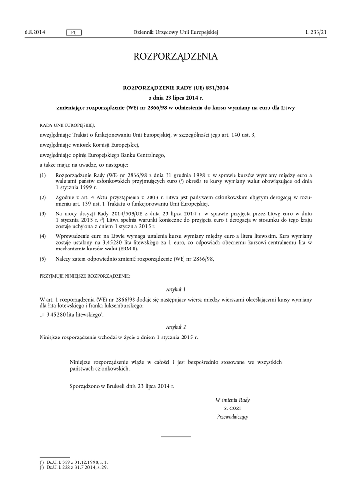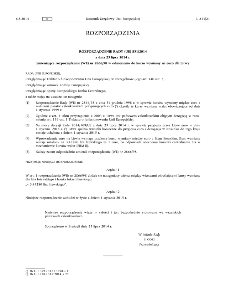 6.8.2014 Dziennik Urzędowy Unii Europejskiej PL L 233/21 ROZPORZĄDZENIA ROZPORZĄDZENIE RADY (UE) 851/2014 z dnia 23 lipca 2014 r. zmieniające rozporządzenie (WE) nr 2866/98 w odniesieniu do kursu wymiany na euro dla Litwy RADA UNII EUROPEJSKIEJ, uwzględniając Traktat o funkcjonowaniu Unii Europejskiej, w szczególności jego art. 140 ust. 3, uwzględniając wniosek Komisji Europejskiej, uwzględniając opinię Europejskiego Banku Centralnego, a także mając na uwadze, co następuje: (1) Rozporządzenie Rady (WE) nr 2866/98 z dnia 31 grudnia 1998 r. w sprawie kursów wymiany między euro a walutami państw członkowskich przyjmujących euro (1) określa te kursy wymiany walut obowiązujące od dnia 1 stycznia 1999 r. (2) Zgodnie z art. 4 Aktu przystąpienia z 2003 r. Litwa jest państwem członkowskim objętym derogacją w rozu mieniu art. 139 ust. 1 Traktatu o funkcjonowaniu Unii Europejskiej. (3) Na mocy decyzji Rady 2014/509/UE z dnia 23 lipca 2014 r. w sprawie przyjęcia przez Litwę euro w dniu 1 stycznia 2015 r. (2) Litwa spełnia warunki konieczne do przyjęcia euro i derogacja w stosunku do tego kraju zostaje uchylona z dniem 1 stycznia 2015 r. (4) Wprowadzenie euro na Litwie wymaga ustalenia kursu wymiany między euro a litem litewskim. Kurs wymiany zostaje ustalony na 3,45280 lita litewskiego za 1 euro, co odpowiada obecnemu kursowi centralnemu lita w mechanizmie kursów walut (ERM II). (5) Należy zatem odpowiednio zmienić rozporządzenie (WE) nr 2866/98, PRZYJMUJE NINIEJSZE ROZPORZĄDZENIE: Artykuł 1 W art. 1 rozporządzenia (WE) nr 2866/98 dodaje się następujący wiersz między wierszami określającymi kursy wymiany dla łata łotewskiego i franka luksemburskiego: „= 3,45280 lita litewskiego”. Artykuł 2 Niniejsze rozporządzenie wchodzi w życie z dniem 1 stycznia 2015 r. Niniejsze rozporządzenie wiąże w całości i jest bezpośrednio stosowane we wszystkich państwach członkowskich. Sporządzono w Brukseli dnia 23 lipca 2014 r. W imieniu Rady S. GOZI Przewodniczący (1) Dz.U. L 359 z 31.12.1998, s. 1. (2) Dz.U. L 228 z 31.7.2014, s. 29.