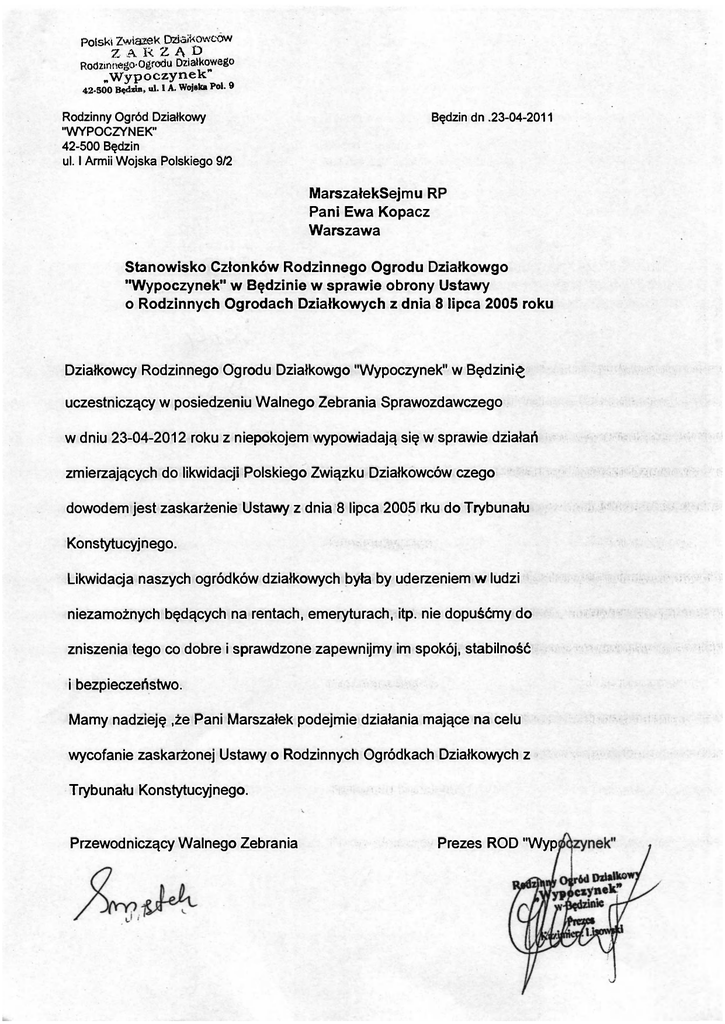 Poiski Związek D z i k o w c ó w Z A R Z A D Rodzintsego-Ogrodu Działkowego „Wypoczynek" 42-500 Będiin, ul. 1 A. Wojska Pol. 9 Rodzinny Ogród Działkowy "WYPOCZYNEK" 42-500 Będzin ul. I Armii Wojska Polskiego 9/2 Będzin dn .23-04-2011 MarszałekSejmu RP Pani Ewa Kopacz Warszawa Stanowisko Członków Rodzinnego Ogrodu Działkowgo "Wypoczynek" w Będzinie w sprawie obrony Ustawy o Rodzinnych Ogrodach Działkowych z dnia 8 lipca 2005 roku Działkowcy Rodzinnego Ogrodu Działkowgo "Wypoczynek" w Będzini^ uczestniczący w posiedzeniu Walnego Zebrania Sprawozdawczego w dniu 23-04-2012 roku z niepokojem wypowiadają się w sprawie działań zmierzających do likwidacji Polskiego Związku Działkowców czego dowodem jest zaskarżenie Ustawy z dnia 8 lipca 2005 rku do Trybunału Konstytucyjnego. Likwidacja naszych ogródków działkowych była by uderzeniem w ludzi niezamożnych będących na rentach, emeryturach, itp. nie dopuśćmy do zniszenia tego co dobre i sprawdzone zapewnijmy im spokój, stabilność i bezpieczeństwo. Mamy nadzieję ,że Pani Marszałek podejmie działania mające na celu wycofanie zaskarżonej Ustawy o Rodzinnych Ogródkach Działkowych z Trybunału Konstytucyjnego. Przewodniczący Walnego Zebrania Prezes ROD "Wyp