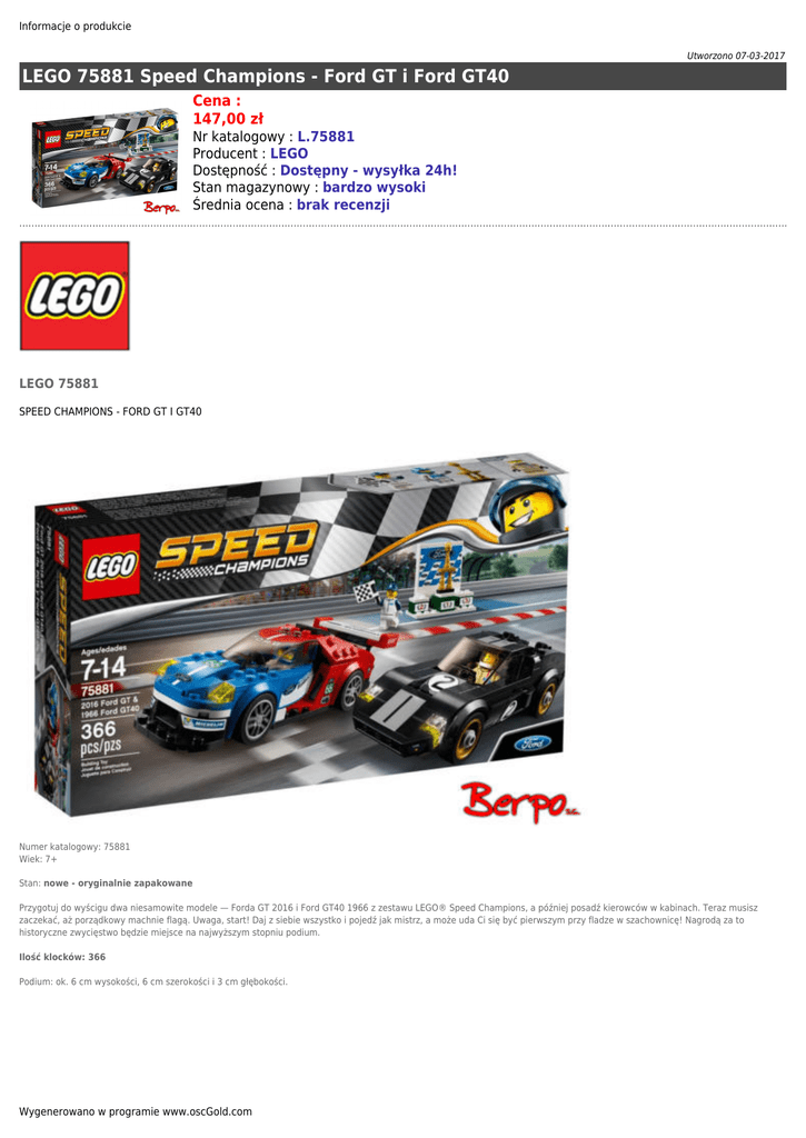 Informacje o produkcie Utworzono 07-03-2017 LEGO 75881 Speed Champions - Ford GT i Ford GT40 Cena : 147,00 zł Nr katalogowy : L.75881 Producent : LEGO Dostępność : Dostępny - wysyłka 24h! Stan magazynowy : bardzo wysoki Średnia ocena : brak recenzji LEGO 75881 SPEED CHAMPIONS - FORD GT I GT40 Numer katalogowy: 75881 Wiek: 7+ Stan: nowe - oryginalnie zapakowane Przygotuj do wyścigu dwa niesamowite modele — Forda GT 2016 i Ford GT40 1966 z zestawu LEGO® Speed Champions, a później posadź kierowców w kabinach. Teraz musisz zaczekać, aż porządkowy machnie flagą. Uwaga, start! Daj z siebie wszystko i pojedź jak mistrz, a może uda Ci się być pierwszym przy fladze w szachownicę! Nagrodą za to historyczne zwycięstwo będzie miejsce na najwyższym stopniu podium. Ilość klocków: 366 Podium: ok. 6 cm wysokości, 6 cm szerokości i 3 cm głębokości. Wygenerowano w programie www.oscGold.com Informacje o produkcie Wygenerowano w programie www.oscGold.com Dostępność w salonach: Ilość: Sklep - Złotniki: 13 Sklep - zlikwidowany: 0 Sklep - Szczepankowo: 2 Dostępne opcje LEGO 75881 Speed Champions - Ford GT i Ford GT40 » Wiek: 5 - 7 lat, 8 - 11 lat, 12 lat i więcej.
