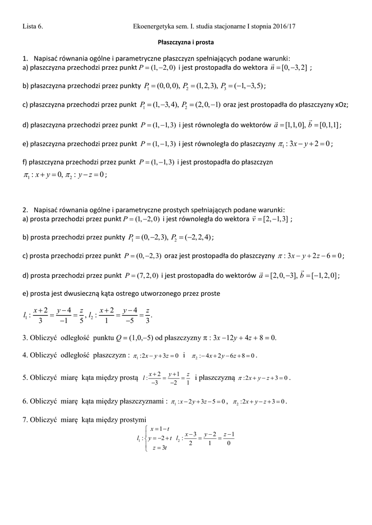 Lista 6. Ekoenergetyka sem. I. studia stacjonarne I stopnia 2016/17 Płaszczyzna i prosta 1. Napisać równania ogólne i parametryczne płaszczyzn spełniających podane warunki: a) płaszczyzna przechodzi przez punkt P (1, 2, 0) i jest prostopadła do wektora n [0, 3, 2] ; b) płaszczyzna przechodzi przez punkty P1 (0,0,0), P2 (1, 2,3), P3 (1, 3,5) ; c) płaszczyzna przechodzi przez punkt P1 (1, 3, 4), P2 (2,0, 1) oraz jest prostopadła do płaszczyzny xOz; d) płaszczyzna przechodzi przez punkt P (1, 1,3) i jest równoległa do wektorów a [1,1, 0], b [0,1,1] ; e) płaszczyzna przechodzi przez punkt P (1, 1,3) i jest równoległa do płaszczyzny 1 : 3x y 2 0 ; f) płaszczyzna przechodzi przez punkt P (1, 1,3) i jest prostopadła do płaszczyzn 1 : x y 0, 2 : y z 0 ; 2. Napisać równania ogólne i parametryczne prostych spełniających podane warunki: a) prosta przechodzi przez punkt P (1, 2, 0) i jest równoległa do wektora v [2, 1,3] ; b) prosta przechodzi przez punkty P1 (0, 2,3), P2 (2, 2, 4) ; c) prosta przechodzi przez punkt P (0, 2,3) oraz jest prostopadła do płaszczyzny : 3 x y 2 z 6 0 ; d) prosta przechodzi przez punkt P (7, 2, 0) i jest prostopadła do wektorów a [2, 0, 3], b [1, 2, 0] ; e) prosta jest dwusieczną kąta ostrego utworzonego przez proste l1 : x2 y4 z x2 y4 z , l2 : . 3 1 5 1 5 3 3. Obliczyć odległość punktu Q (1,0,5) od płaszczyzny : 3x 12y 4z 8 0. 4. Obliczyć odległość płaszczyzn : 1 :2x y 3z 0 i 2 : 4x 2 y 6z 8 0 . 5. Obliczyć miarę kąta między prostą l : x 2 y 1 z i płaszczyzną :2 x y z 3 0 . 3 2 1 6. Obliczyć miarę kąta między płaszczyznami : 1 : x 2 y 3z 5 0 , 2 :2x y z 3 0 . 7. Obliczyć miarę kąta między prostymi x 1 t x 3 y 2 z 1 l1 : y 2 t l2 : 2 1 0 z 3t