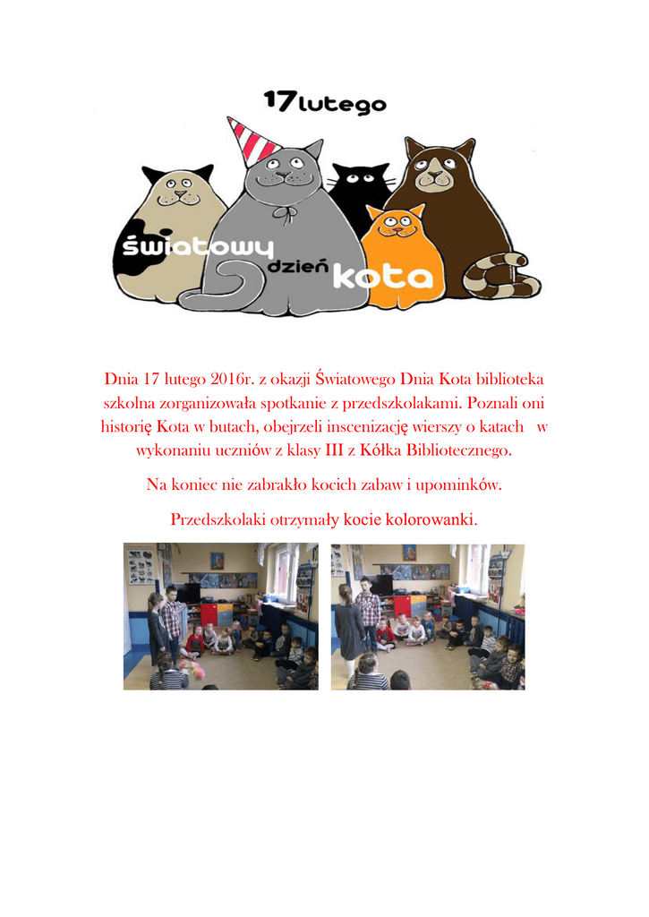 Dnia 17 lutego 2016r. z okazji Światowego Dnia Kota biblioteka szkolna zorganizowała spotkanie z przedszkolakami. Poznali oni historię Kota w butach, obejrzeli inscenizację wierszy o katach w wykonaniu uczniów z klasy III z Kółka Bibliotecznego. Na koniec nie zabrakło kocich zabaw i upominków. Przedszkolaki otrzymały kocie kolorowanki.