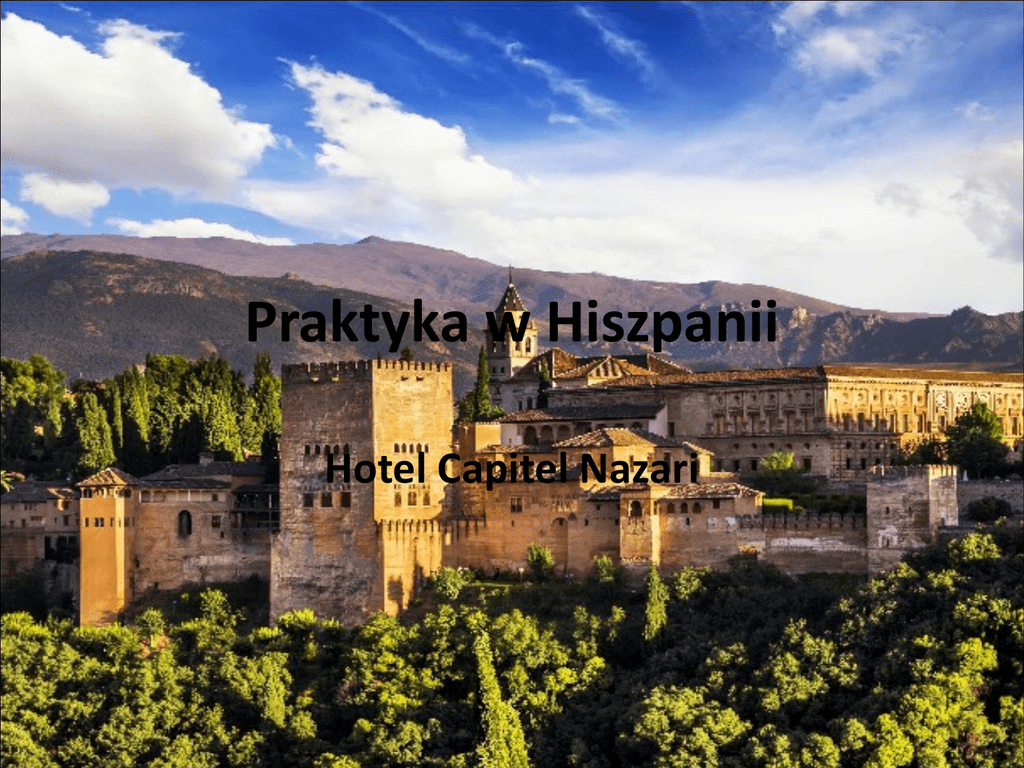 Praktyka w Hiszpanii Hotel Capitel Nazari Moje praktyki odbywały się w Hotelu Casa del Capitel Nazari, znajdującym się blisko centrum miasta w sąsiedztwie dzielnicy Albazin w Granadzie. Jest to przepiękny hotel z elementami i ozdobami z XVI wieku. Z hotelu goście mają okazję oglądać mury zamku Alhambra. Do moich głównych zadań należało: • Obsługa Sali konsumenckiej w której serwowane były śniadania (bufet), • Sprzątanie hotelu, • Hausekeeping, • Obsługa gości przy recepcji Obsługa Sali konsumenckiej Lista potraw znajdujących się w bufecie Sprzątanie hotelu Hausekeeping Widok z tarasu z pokoju gościa Recepcja Pracownicy hotelu Hotel ma wiele nagród za jakość świadczonych usług. Został odrestaurowany w 2012 roku roku z zachowaniem zabytkowej architektury z XVI wieku. Był to najlepszy czas i najlepsi ludzie Dziękuję za uwagę Prezentację przygotowała Kamila Stacewicz klasa II B