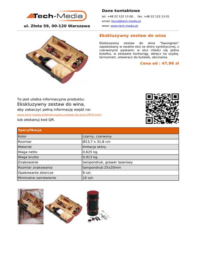 Dane kontaktowe tel. +48 22 122 13 00 , fax. +48 22 122 13 01 email: [email protected] ul. Złota 59, 00-120 Warszawa www: www.tech-media.pl Ekskluzywny zestaw do wina Ekskluzywny zestaw do wina "Sauvignon" zapakowany w owalne etui ze skóry syntetycznej, z czerwonymi paskami; w etui mieści się jedna butelka, w zestawie korkociąg, obręcz na szyjkę, termometr, otwieracz do butelek, obcinarka. Cena od : 47,98 zł To jest ulotka informacyjna produktu: Ekskluzywny zestaw do wina , aby zobaczyć pełną informację wejdź na: www.tech-media.pl/ekskluzywny,zestaw,do,wina,0974.html lub zeskanuj kod QR. Specyfikacja Kolor czarny, czerwony Rozmiar Ø13,7 x 31,8 cm Materiał Imitacja skóry Waga netto 0,625 kg. Waga brutto 0,913 kg. Znakowanie tampondruk, grawer laserowy Rozmiar znakowania tampondruk:25x20mm Opakowanie zbiorcze 8 szt. Minimalne zamówienie 10 szt.
