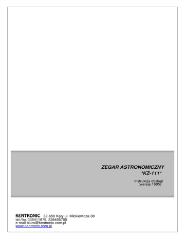 ZEGAR ASTRONOMICZNY *KZ-111* Instrukcja obsługi (wersja 1605) KENTRONIC 32-650 Kęty ul. Mickiewicza 38 tel./fax 338411879, 338455700 e-mail [email protected] www.kentronic.com.pl SPIS TREŚCI 1. 2. 3. 3.1. 3.2. 4. 4.1. 4.2. 4.3. 4.4. 4.5. 4.6. 4.7. 5. 6. 7. 8. 9. 10. 11. 12. CHARAKTERYSTYKA OGÓLNA ................................................................................................................................ 2 TRYBY PRACY ZEGARA ........................................................................................................................................... 3 TRYB PODSTAWOWY – PRACA AUTOMATYCZNA ................................................................................................. 3 ODCZYT CZASU BIEŻĄCEGO I DATY ................................................................................................................... 3 ODCZYT CZASÓW WSCHODU I ZACHODU SŁOŃCA .......................................................................................... 4 USTAWIANIE PARAMETRÓW PRACY..................................................................................................................... 4 USTAWIANIE CZASU BIEŻĄCEGO....................................................................................................................... 4 USTAWIANIE BIEŻĄCEJ DATY ............................................................................................................................ 5 USTAWIANIE PRZESUNIĘCIA CZASÓW WSCHODU I ZACHODU SŁOŃCA .......................................................... 5 USTAWIANIE CZASÓW WYŁĄCZENIA NOCNEGO .............................................................................................. 6 USTAWIANIE DŁUGOŚCI I SZEROKOŚCI GEOGRAFICZNEJ ................................................................................. 6 USTAWIANIE CZASU LETNIEGO/ZIMOWEGO.................................................................................................... 7 USTAWIANIE STREFY CZASOWEJ....................................................................................................................... 7 RĘCZNE STEROWANIE KANAŁEM WYJŚCIOWYM .................................................................................................. 7 RESET – WPROWADZANIE PARAMETRÓW DOMYŚLNYCH ................................................................................... 8 PANEL CZOŁOWY - SYMBOLE ................................................................................................................................ 8 DISPLAY - SYMBOLE............................................................................................................................................... 8 DANE TECHNICZNE .............................................................................................................................................. 10 UKŁAD WYPROWADZEŃ ..................................................................................................................................... 10 DEKLARACJA ZGODNOŚCI ................................................................................................................................... 11 KARTA GWARANCYJNA ....................................................................................................................................... 12 1. CHARAKTERYSTYKA OGÓLNA 1 kanał wyjściowy sterowany czasami wschodu i zachodu słońca czasy wschodu i zachodu słońca wyliczane dla miejsc geograficznych znajdujących się w obszarze Long = -60o…+60o i Lat = -60o…+60o funkcja ręcznego sterowania kanałem wyjściowym "czas letni" lub "czas zimowy" wybierany ręcznie lub automatycznie automatyczne wyznaczanie dnia tygodnia z aktualnej daty wybór jednej z europejskich stref czasowych (UTC + 0…4h) przesuwanie czasu wschodu słońca w zakresie -59…+59 min i zachodu słońca w zakresie -59…+59 min możliwość wyłączenia kanału wyjściowego w godzinach nocnych możliwość pracy w szerokim zakresie temperatury otoczenia zabezpieczenie przed skutkami zaniku napięcia zasilającego (bezobsługowe źródło napięcia buforowego) czytelny wyświetlacz LED smukła obudowa (szerokość 2 modułów) do montażu na szynach 35mm możliwość zasilania napięciem 230VAC lub 12VAC/DC 2 2. TRYBY PRACY ZEGARA OPIS Zegar może pracować w 3 trybach: => tryb podstawowy - wyświetlania czasu (i przeglądania podstawowych parametrów) => tryb ustawiania parametrów pracy => tryb ręcznego sterowania kanałem wyjściowym UWAGI Zegar samoczynnie powraca z trybu ustawiania parametrów pracy do trybu podstawowego po upływie ok. 30 sekund od ostatniego naciśnięcia dowolnego przycisku. 3. TRYB PODSTAWOWY – PRACA AUTOMATYCZNA OPIS Urządzenie, na podstawie aktualnej daty oraz wprowadzonej pozycji geograficznej, oblicza astronomiczne czasy wschodu i zachodu słońca. Wyliczone wartości porównuje z bieżącym czasem i zgodnie z wynikiem komparacji odpowiednio ustawia stan kanału wyjściowego. W trybie podstawowym możliwy jest odczyt czasu bieżącego, bieżącej daty (dzień, miesiąc – rok), czasów wschodu i zachodu słońca oraz informacji o czasie letnim/zimowym. OBSŁUGA Do przeglądania parametrów pracy należy użyć przycisków , przełączając kolejno: data rok czas wschodu czas zachodu czas letni/zimowy czas bieżący( data…) Zegar samoczynnie powraca do wyświetlania czasu bieżącego po upływie ok. 30 sekund od ostatniego naciśnięcia przycisku. Powrót do wyświetlania czasu następuje także po naciśnięciu przycisku . UWAGI Aby urządzenie prawidłowo funkcjonowało, przy jego pierwszym uruchomieniu należy ustawić: => czas bieżący – pkt. 4.1 => datę bieżącą – pkt. 4.2 Ewentualnie należy ustawić/skorygować: => długość i szerokość geograficzną – pkt. 4.5 => strefę czasową – pkt. 4.7 => czas letni/zimowy – pkt. 4.6 => przesunięcia czasów wschodu i zachodu słońca – pkt. 4.3 =>