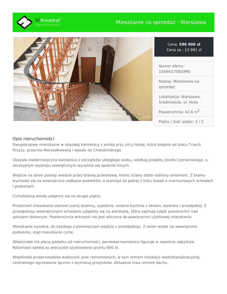 Mieszkanie na sprzedaż - Warszawa Cena: 596 000 zł Cena za : 13 991 zł Numer oferty: 15444/1708/OMS Rodzaj: Mieszkanie na sprzedaż Lokalizacja: Warszawa, Śródmieście, ul. Hoża Powierzchnia: 42.6 m2 Piętro / ilość pięter: 2 / 5 Opis nieruchomości Dwupokojowe mieszkanie w okazałej kamienicy z windą przy ulicy Hożej, która biegnie od placu Trzech Krzyży, przecina Marszałkowską i wpada do Chałubińskiego. Okazała modernistyczna kamienica z początków ubiegłego wieku, według projektu Józefa Czerwińskiego, o secesyjnym wystroju zewnętrznym wyróżnia się spośród innych. Wejście na teren posesji wiedzie przez bramę przelotową, której ściany zdobi roślinny ornament. Z bramy wychodzi się na wewnętrzne zadbane podwórko, a stamtąd do jednej z kilku klatek o marmurowych schodach i podestach. Cichobieżną windą udajemy się na drugie piętro. Przestrzeń mieszkania stanowi pokój dzienny, sypialnia, osobna kuchnia z oknem, łazienka i przedpokój. Z przedpokoju wewnętrznymi schodami udajemy się na antresolę, która zajmuję część powierzchni nad pokojem dziennym. Powierzchnia antresoli nie jest wliczona do powierzchni użytkowej mieszkania. Mieszkanie wysokie, do każdego z pomieszczeń wejście z przedpokoju. Z okien widok na wewnętrzne podwórko, stąd mieszkanie ciche. Właściciele nie płacą podatku od nieruchomości, ponieważ kamienica figuruje w rejestrze zabytków. Natomiast opłata za wieczyste użytkowanie gruntu 600 zł. Wspólnota przeprowadziła większość prac remontowych, w tym remont instalacji wodnokanalizacyjnej, centralnego ogrzewania łącznie z wymianą grzejników. Aktualnie trwa remont dachu. Zapraszam na prezentację. Kontakt w sprawie oferty M Kwadrat Nieruchomości Biuro nieruchomości 693 222 222 [email protected]