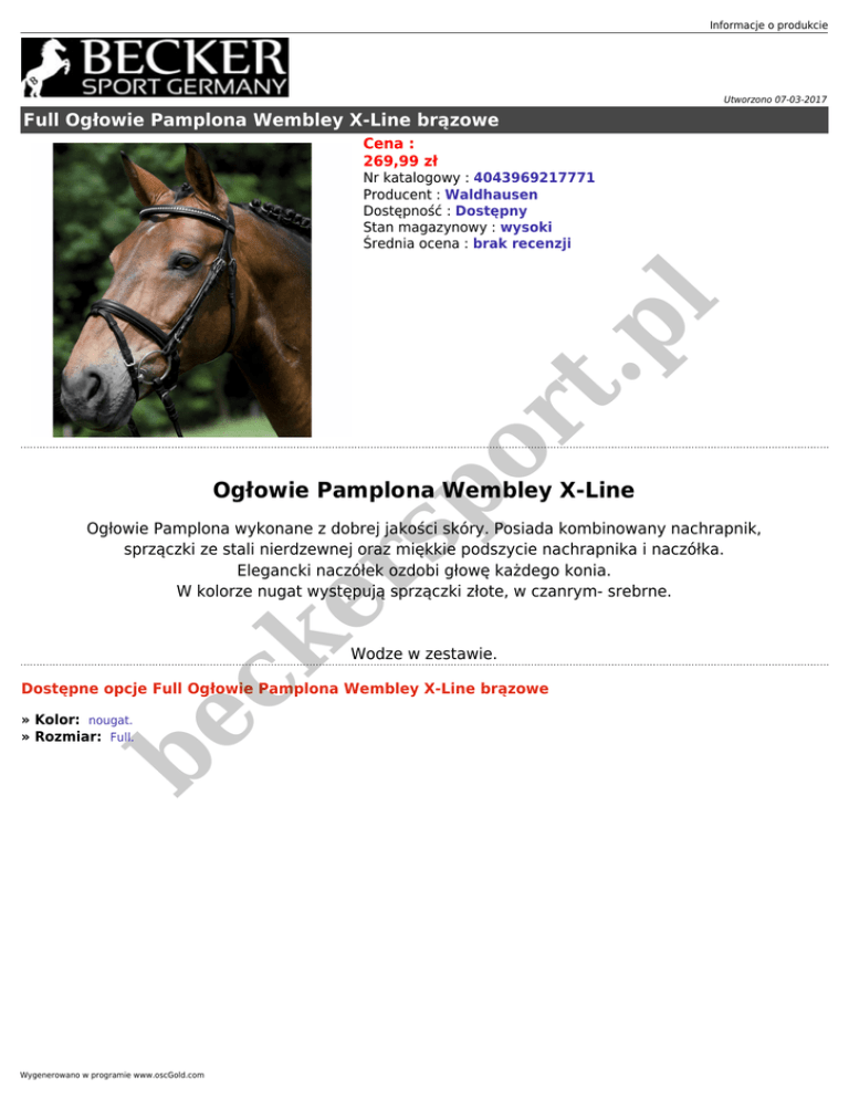 Informacje o produkcie Utworzono 07-03-2017 Full Ogłowie Pamplona Wembley X-Line brązowe Cena : 269,99 zł or t. pl Nr katalogowy : 4043969217771 Producent : Waldhausen Dostępność : Dostępny Stan magazynowy : wysoki Średnia ocena : brak recenzji rs p Ogłowie Pamplona Wembley X-Line ke Ogłowie Pamplona wykonane z dobrej jakości skóry. Posiada kombinowany nachrapnik, sprzączki ze stali nierdzewnej oraz miękkie podszycie nachrapnika i naczółka. Elegancki naczółek ozdobi głowę każdego konia. W kolorze nugat występują sprzączki złote, w czanrym- srebrne. be c Wodze w zestawie. Dostępne opcje Full Ogłowie Pamplona Wembley X-Line brązowe » Kolor: nougat. » Rozmiar: Full. Wygenerowano w programie www.oscGold.com