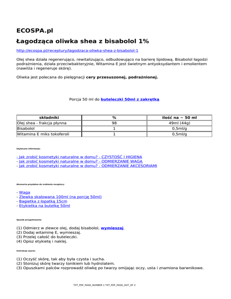 ECOSPA.pl Łagodząca oliwka shea z bisabolol 1% http://ecospa.pl/receptury/lagodzaca-oliwka-shea-z-bisabolol-1 Olej shea działa regenerująco, rewitalizująco, odbudowująco na barierę lipidową. Bisabolol łagodzi podrażnienia, działa przeciwbakteryjnie, Witamina E jest świetnym antyoksydantem i emolientem (nawilża i regeneruje skórę). Oliwka jest polecana do pielęgnacji cery przesuszonej, podrażnionej. Porcja 50 ml do buteleczki 50ml z zakrętką składniki % ilość na ~ 50 ml 98 49ml (44g) Bisabolol 1 0,5ml/g Witamina E miks tokoferoli 1 0,5ml/g Olej shea - frakcja płynna Użyteczne informacje: - Jak zrobić kosmetyki naturalne w domu? - CZYSTOŚĆ I HIGIENA - Jak zrobić kosmetyki naturalne w domu? - ODMIERZANIE WAGĄ - Jak zrobić kosmetyki naturalne w domu? - ODMIERZANIE AKCESORIAMI Akcesoria przydatne do zrobienia receptury: Waga Zlewka skalowana 100ml (na porcję 50ml) Bagietka z łopatką 15cm Etykietka na butelkę 50ml Sposób przygotowania: (1) (2) (3) (4) Odmierz w zlewce olej, dodaj bisabolol, wymieszaj. Dodaj witaminę E, wymieszaj. Przelej całość do buteleczki. Opisz etykietę i naklej. Instrukcja użycia: (1) Oczyść skórę, tak aby była czysta i sucha. (2) Stonizuj skórę twarzy tonikiem lub hydrolatem. (3) Opuszkami palców rozprowadź oliwkę po twarzy omijając oczy, usta i znamiona barwnikowe. TXT_PDF_PAGE_NUMBER 1 TXT_PDF_PAGE_OUT_OF 2 (3) Po upływie 10 minut nałóż swój ulubiony kosmetyk nawilżający. Może to być np. krem z bazy kremowej EKOLOGICZNEJ. Przechowywanie stosowanie termin przydatności w łazience na półce* codziennie 6 miesięcy * Oliwka składa się wyłącznie z lipidowych (tłustych) składników, nie jest wymagane przechowywanie w lodówce. TXT_PDF_PAGE_NUMBER 2 TXT_PDF_PAGE_OUT_OF 2