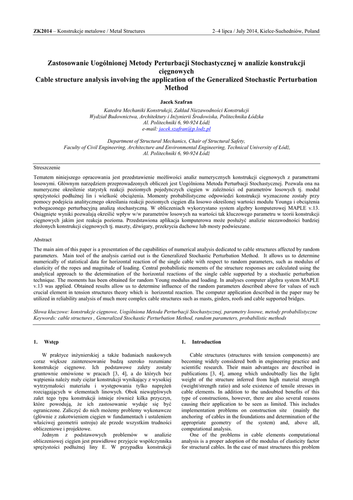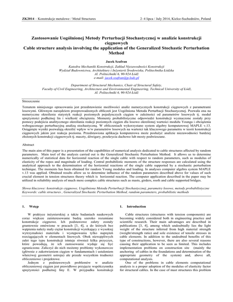 ZK2014 – Konstrukcje metalowe / Metal Structures 2–4 lipca / July 2014, Kielce-Suchedniów, Poland Zastosowanie Uogólnionej Metody Perturbacji Stochastycznej w analizie konstrukcji cięgnowych Cable structure analysis involving the application of the Generalized Stochastic Perturbation Method Jacek Szafran Katedra Mechaniki Konstrukcji, Zakład Niezawodności Konstrukcji Wydział Budownictwa, Architektury i Inżynierii Środowiska, Politechnika Łódzka Al. Politechniki 6, 90-924 Łódź e-mail: [email protected] Department of Structural Mechanics, Chair of Structural Safety, Faculty of Civil Engineering, Architecture and Environmental Engineering, Technical University of Łódź, Al. Politechniki 6, 90-924 Łódź Streszczenie Tematem niniejszego opracowania jest przedstawienie możliwości analiz numerycznych konstrukcji cięgnowych z parametrami losowymi. Głównym narzędziem przeprowadzonych obliczeń jest Uogólniona Metoda Perturbacji Stochastycznej. Pozwala ona na numeryczne określenie statystyk reakcji poziomych pojedynczych cięgien w zależności od parametrów losowych tj. moduł sprężystości podłużnej lin i wielkość obciążenia. Momenty probabilistyczne odpowiedzi konstrukcji wyznaczone zostały przy pomocy podejścia analitycznego określania reakcji poziomych cięgien dla losowo określonej wartości modułu Younga i obciążenia wzbogaconego perturbacyjną analizą stochastyczną. W obliczeniach wykorzystano system algebry komputerowej MAPLE v.13. Osiągnięte wyniki pozwalają określić wpływ w/w parametrów losowych na wartości tak kluczowego parametru w teorii konstrukcji cięgnowych jakim jest reakcja pozioma. Przedstawiona aplikacja komputerowa może posłużyć analizie niezawodności bardziej złożonych konstrukcji cięgnowych tj. maszty, dźwigary, przekrycia dachowe lub mosty podwieszane. Abstract The main aim of this paper is a presentation of the capabilities of numerical analysis dedicated to cable structures affected by random parameters. Main tool of the analysis carried out is the Generalized Stochastic Perturbation Method. It allows us to determine numerically of statistical data for horizontal reaction of the single cable with respect to random parameters, such as modulus of elasticity of the ropes and magnitude of loading. Central probabilistic moments of the structure responses are calculated using the analytical approach to the determination of the horizontal reactions of the single cable supported by a stochastic perturbation technique. The moments has been obtained for random Young modulus and loading. In analyses computer algebra system MAPLE v.13 was applied. Obtained results allow us to determine influence of the random parameters described above for values of such crucial element in tension structures theory which is horizontal reaction. The computer application described in the paper may be utilized in reliability analysis of much more complex cable structures such as masts, girders, roofs and cable supported bridges. Słowa kluczowe: konstrukcje cięgnowe, Uogólniona Metoda Perturbacji Stochastycznej, parametry losowe, metody probabilistyczne Keywords: cable structures , Generalized Stochastic Perturbation Method, random parameters, probabilistic methods 1. Wstęp W praktyce inżynierskiej a także badaniach naukowych coraz większe zainteresowanie budzą szeroko rozumiane konstrukcje cięgnowe. Ich podstawowe zalety zostały gruntownie omówione w pracach [3, 4], a do których bez wątpienia należy mały ciężar konstrukcji wynikający z wysokiej wytrzymałości materiału i występowania tylko naprężeń rozciągających w elementach linowych. Obok niewątpliwych zalet tego typu konstrukcji istnieje również kilka przyczyn, które powodują, że ich zastosowanie wydaje się być ograniczone. Zaliczyć do nich możemy problemy wykonawcze (głównie z zakotwieniem cięgien w fundamentach i ustaleniem właściwej geometrii ustroju) ale przede wszystkim trudności obliczeniowe i projektowe. Jednym z podstawowych problemów w analizie obliczeniowej cięgien jest prawidłowe przyjęcie współczynnika sprężystości podłużnej liny E. W przypadku konstrukcji 1. Introduction Cable structures (structures with tension components) are becoming widely considered both in engineering practice and scientific research. Their main advantages are described in publications [3, 4], among which undoubtedly lies the light weight of the structure inferred from high material strength (weight/strength ratio) and sole existence of tensile stresses in cable elements. In addition to the undoubted benefits of this type of constructions, however, there are also several reasons causing their application to be seen as limited. This includes implementation problems on construction site (mainly the anchoring of cables in the foundations and determination of the appropriate geometry of the system) and, above all, computational analysis. One of the problems in cable elements computational analysis is a proper adoption of the modulus of elasticity factor for structural cables. In the case of mast structures this problem ZK2014 – Konstrukcje metalowe / Metal Structures 2–4 lipca / July 2014, Kielce-Suchedniów, Poland masztowych problem ten został omówiony w pracy [5]. W przypadku lin nie poddanych wstępnemu przeciągnięciu (lub też gdy proces ten nie został wykonany w pełnym zakresie) wartości tego parametru mogą mieć duży rozrzut. Można zatem uznać, że również nośność takiego elementu rozciąganego będzie losowa. Inne przypadki losowości dla stalowych elementów rozciąganych określone zostały w pracy [1]. Fakt ten spowodował przyjęcie modułu sprężystości jako parametru losowego w późniejszej analizie obliczeniowej. Jednym z podstawowych przypadków obciążeniowych pojedynczych cięgien jest wiatr i oblodzenie. Obydwa te parametry z całą pewnością możemy uznać jako losowe. Znane są przypadki kiedy nagły wzros