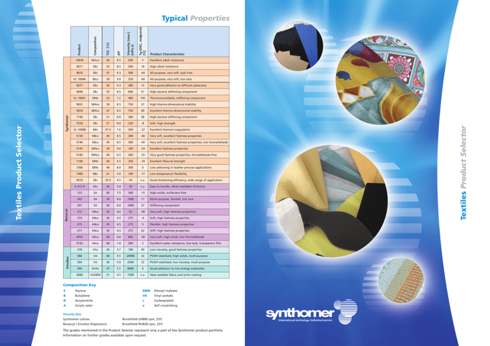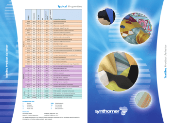 Excellent alkali resistance 500 18 High alkali resistance 300 -44 All-purpose, very soft, tack-free 9.0 250 -60 All-purpose, very soft, low tack 45 9.3 300 12 Very good adhesion to difficult substrates SBc 55 8.5 600 51 High styrene stiffening component VL 10601 SBNc 53 7.2 400 105 Thermomouldable, stiffening component 9022 SBNcx 50 8.5 750 27 High thermo-dimensional stability 9024 SBNcx 47 8.5 750 40 Excellent thermo-dimensional stability 7140 SBc 51 8.0 300 48 High styrene stiffening component 7250 SBc 51 8.0 220 -8 Soft, high strength VL 10988 NBc 47.5 7.6 200 -22 Excellent thermal coagulation 5130 NBcx 45 8.5 300 -40 Very soft, excellent fastness properties 5140 NBcx 45 8.5 300 -40 Very soft, excellent fastness properties, low formaldehyde 5147 SBNcx 39 9.0 100 -24 Excellent fastness properties 5185 SBNcx 44 8.5 300 -25 Very good fastness properties, formaldehyde-free 7100 SBNc 40 6.5 250 -10 Excellent flexural strength 7300 SBNc 46 8.0 300 0 7400 NBc 41 9.0 100 -17 Low temperature flexibility 9523 SBc 35.5 4.5 50 n.a. Good thickening efficiency, wide range of application A 412 R SAc 30 3.0 50 n.a. Easy to handle, alkali swellable thickener 123 SA 60 7.5 500 -15 High solids, surfactant-free 245 SA 50 8.0 1000 17 Multi-purpose, flexible, low tack 247 SA 50 8.0 1000 37 Stiffening component 272 ANcx 45 4.0 65 -30 Very soft, high fastness properties 274 ANcx 45 4.5 275 -4 Soft, high fastness properties 275 ANcx 45 4.5 275 5 Flexible, high fastness properties 277 ANcx 45 4.5 275 22 Stiff, high fastness properties 4955 ANcx 60 4.0 800 -28 Very soft, high solids, low formaldehyde 5732 SAcx 60 7.0 300 2 Excellent water resistance, low tack, transparent film 378 VAx 45 3.7 100 40 Low viscosity, good fastness properties 586 VA 60 4.5 24000 32 PVOH stabilised, high solids, multi-purpose 594 VA 50 5.0 2500 32 PVOH stabilised, low viscosity, multi-purpose 596 AVAx 47 5.5 8000 0 Good adhesion to low energy substrates 4300 VADBM 51 4.5 1500 n.a. 50 8.5 SBx 52 8.5 SBx 47 9.3 VL 10946 SBcx 50 9077 SBx 9090 Product SBAcx 10656 9071 9076 Low yellowing in leather precoat applications Heat sealable fabric and scrim coating Composition Key S Styrene DBM Dibutyl maleate B Butadiene VA Vinyl acetate N Acrylonitrile c Carboxylated A Acrylic ester x Self crosslinking Viscosity data Synthomer Latices: Brookfield LV@60 rpm, 230C Revacryl / Emultex Dispersions: Brookfield RV@20 rpm, 230C The grades mentioned in the Product Selector represent only a part of the Synthomer product portfolio. Information on further grades available upon request. Textiles Product Selector Tg (DSC, midpoint) [0C] 5 pH 500 TSC [%] Product Characteristics Composition Viscosity (max.) [mPa.s] Synthomer Revacryl Emultex Textiles Product Selector Typical Properties Emultex 4300 Emultex 596 Emultex 594 Emultex 586 Emultex 378 Vinylacetate Dispersions Synthomer A 412 R Revacryl 5732 Revacryl 4955 Revacryl 277 Revacryl 275 Revacryl 274 Revacryl 272 Revacryl 247 Revacryl 245 Revacryl 123 Acrylic Dispersions Synthomer 9523 Synthomer 7400 Synthomer 7300 Synthomer 7100 Synthomer 5185 Synthomer 5147 Synthomer 5140 Synthomer 5130 Synthomer VL 10988 Synthomer 7250 Synthomer 7140 Synthomer 9024 Sythomer 9022 Synthomer VL 10601 Synthomer 9090 Synthomer 9077 Synthomer VL 10946 Synthomer 9076 Synthomer 9071 Recommended Suitable Synthomer 10656 Key SBR / NBR Latices www.synthomer.com Highly Alkali Resistant Fabrics Highly Flexible Fabrics Medium Stiff Fabrics Stiff Fabrics Textiles Product Selector Stiff, Heat Mouldable Fabrics Very Flexible Scrims Medium Stiff Scrims Wallcoverings Glass Veils Heat Sealable Finishing Wipes Footwear Interlinings Waddings Fabric Stiffener Curtains Needlefelts / Nonwovens Flocking Adhesive Abrasive Base Support for Roofing Membranes Reinforcement Fabrics / Scrims Heat Sensitising Applications Print Paste Binder, Self-crosslinking Print Paste Binder Textile Coating Leather Finishing Synthetic Thickener This publication is for general information only and any other uses are prohibited. We accept no responsibility for loss which may arise from reliance on this information and you should contact us for advice on specific products and applications. © Synthomer Limited. March 2009. Synthomer Limited Synthomer GmbH Synthomer LLC Central Road, Templefields Harlow, Essex CM20 2BH Great Britain Tel +44 (0) 1279 436 211 Fax +44 (0) 1279 444 025 Gwinnerstrasse 19 D-60388 Frankfurt am Main Germany Tel +49 (0) 69 94179 0 Fax +49 (0) 69 94179 211 460 Village Park Drive Powell, Ohio 43065 USA Tel +1 614 847 1234 Fax +1 614 847 1222