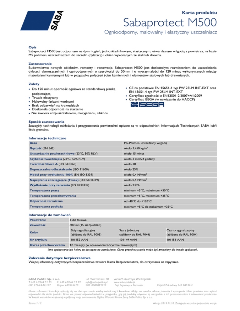 Karta produktu Sabaprotect M500 Ognioodporny, malowalny i elastyczny uszczelniacz Opis Sabaprotect M500 jest odpornym na dym i ogień, jednoskładnikowym, elastycznym, utwardzanym wilgocią z powietrza, na bazie MS polimeru uszczelniaczem do szczelin (dylatacji) i okien wykonanych ze stali lub drewna. Zastosowanie Budownictwo nowych obiektów, remonty i renowacje. Sabaprotect M500 jest doskonałym rozwiązaniem do uszczelniania dylatacji dymoszczelnych i ognioodpornych o szerokości do 50mm i o wytrzymałości do 120 minut wykonywanych między materiałami kamiennymi lub w przypadku połączeń ścian kamiennych i elementów stalowych lub drewnianych. Zalety Do 120 minut oporność ogniowa ze standardową pianką podpierającą Trwale elastyczny Malowalny farbami wodnymi Brak odbarwień na krawędziach Doskonała odporność na starzenie Nie zawiera rozpuszczalników, izocyjanianu, silikonu CE na podstawie EN 15651-1 typ PW 25LM INT-EXT oraz EN 15651-4 typ PW 25LM INT-EXT Certyfikat zgodności z EN13501-2:2007+A1:2009 Certyfikat ISEGA (w nawiązaniu do HACCP) Sposób zastosowania Szczegóły technologii nakładania i przygotowania powierzchni opisane są w odpowiednich Informacjach Technicznych SABA lub/i liście gruntów. Informacje techniczne Baza MS-Polimer, utwardzany wilgocią Gęstość (EN 542) około 1.450 kg/m3 Utwardzanie powierzchniowe (23ºC, 50% RLV) około 15 minut Szybkość twardnięcia (23ºC, 50% RLV) około 3 mm/24 godziny Twardość Shore A (EN ISO 868) około 30 Dopuszczalne odkształcenie (ISO 11600) około 25% Moduł przy wydłużeniu 100% (EN ISO 8339) około 0,4 N/mm2 Naprężenia rozciągające (Fmax) (EN ISO 8339) około 0,5 N/mm2 Wydłużenie przy zerwaniu (EN ISO8339) około 230% Temperatura pracy minimum +5°C, maksimum +30°C Temperatura przechowywania minimum +5°C, maksimum +25°C Odporność termiczna od -40C do +120C Temperatura podłoża minimum +5C do maksimum +35C Informacje do zamówień Pakowanie Tuba foliowa Zawartość 600 ml (15 szt./pudełko) Kolor Biały sygnalizacyjny (zbliżony do RAL 9003) Szary jedwabny (zbliżony do RAL 7044) Czarny sygnalizacyjny (zbliżony do RAL 9004) Nr artykułu 101152 AAN 101149 AAN 101151 AAN Okres przechowywania 12 miesięcy (w opakowaniu fabrycznie zamkniętym) Inne opakowania lub kolory są dostępne na zamówienie. Okres przechowywania może być zmieniony dla innych opakowań. Zalecenia dotyczące bezpieczeństwa Więcej informacji dotyczących bezpieczeństwa zawiera Karta Bezpieczeństwa, do otrzymania na zapytanie. SABA Polska Sp. z o.o. T:+48 61/664 51 25 NIP: 777-24-12-137 F: +48 61/664 51 29 Regon: 639665420 ul. Wrzesińska 70 [email protected] KRS: 0000019737 62-025 Kostrzyn Wielkopolski www.saba-polska.pl Sąd Rejonowy w Poznaniu Kapitał Zakładowy 248 900 PLN Nasze zalecenia i instrukcje opierają się na obecnym stanie wiedzy technicznej i know-how. Mając na uwadze własne potrzeby i wymagania, klient powinien sam wybrać odpowiedni dla siebie produkt. Firma nie ponosi odpowiedzialności w przypadku, gdy jej produkty używane są niezgodnie z ich przeznaczeniem i zaleceniami producenta. W kwestii warunków wzajemnej współpracy mają zastosowanie Ogólne Warunki Umów firmy SABA Polska Sp. z o.o. Strona 1 / 2 Wersja 2015.11.10, Zastępuje wszystkie poprzednie wersje. Karta produktu Sabaprotect M500 Ognioodporny, malowalny i elastyczny uszczelniacz Inne informacje 1. Dymoszczelność i ognioodporność Baza kamień-kamień kamień-drewno kamień-stal Minimalna grubość ściany Testowana szerokość szczeliny Wartość E ≥100 do 20mm do 120 minut ≥100 20 do 30 mm do 120 minut ≥100 30- do 50 mm do 120 minut ≥100 ∆ 10 x 10 mm do 120 minut ≥100 do 20mm do 120 minut ≥100 20 do 30 mm do 120 minut ≥100 30- do 50 mm do 120 minut ≥100 do 20mm do 60 minut ≥100 20 do 30 mm do 60 minut ≥100 30- do 50 mm do 60 minut W oparciu o piankę podpierającą z otwartymi komorami oraz proporcjach uszczelnienia [głębokość = (szerokość/3)+6mm] Więcej informacji dotyczących bezpieczeństwa zawiera Karta Bezpieczeństwa, do otrzymania na zapytanie. Sabaprotect M500 jest przebadany przez Laboratorium Bezpieczeństwa Pożarowego PEUTZ w Mook (Holandia) w oparciu o standardowe krzywe grzania zgodnie z wymaganiami procedury opisanej w EN 13501-2:2007+A1:2009 metodami zgodnymi z EN 1363-1:1999, EN 1363-2:1999 i EN 1366-4:2006+A1:2010. Szczegółowe informacje dotyczące klasyfikacji podane są w raporcie nr YA 1515-1-RA w j. holenderskim, nr YA 1515-4E-RA* w j. angielskim, wydanym 13 Sierpnia 2014; dostępne na życzenie. _________________________________________ *- Raport YA 1515-4E-RA z dnia 13 Sierpnia 2014 oryginalnie został opublikowany w języku angielskim i został przetłumaczony na język polski. SABA Polska Sp. z o.o. T:+48 61/664 51 25 NIP: 777-24-12-137 F: +48 61/664 51 29 Regon: 639665420 ul. Wrzesińska 70 [email protected] KRS: 0000019737 62-025 Kostrzyn Wielkopolski www.saba-polska.pl Sąd Rejonowy w Poznaniu Kapitał Zakładowy 248 900 PLN Nasze zalecenia i instrukcje opierają się na obecnym stanie wiedzy technicznej i know-how. Mając na uwadze własne potrzeby i wymagania, klient powinien sam wybrać odpowiedni dla siebie produkt. Firma nie ponosi odpowiedzialności w przypadku, gdy jej produkty używane są niezgodnie z ich przeznaczeniem i zaleceniami producenta. W kwestii warunków wzajemnej współpracy mają zastosowanie Ogólne Warunki Umów firmy SABA Polska Sp. z o.o. Strona 2 / 2 Wersja 2015.11.10, Zastępuje wszystkie poprzednie wersje.