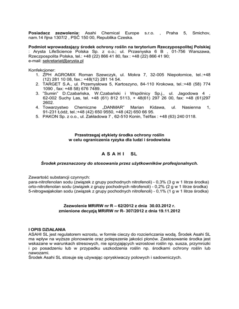 Posiadacz zezwolenia: Asahi Chemical Europe nam.14 řijna 1307/2 , PSČ 150 00, Republika Czeska. s.r.o. , Praha 5, Smichov, Podmiot wprowadzający środek ochrony roślin na terytorium Rzeczypospolitej Polskiej : Arysta LifeScience Polska Sp. z o.o.; ul. Przasnyska 6 B , 01-756 Warszawa, Rzeczpospolita Polska, tel.: +48 (22) 866 41 80, fax : +48 (22) 866 41 90; e-mail: [email protected] Konfekcjoner: 1. ZPH AGROMIX Roman Szewczyk, ul. Mokra 7, 32-005 Niepołomice, tel.:+48 (12) 281 10 08, fax.: +48(12) 281 14 54. 2. TARGET S.A., ul. Przemysłowa 5, Kartoszyno, 84-110 Krokowa, tel.:+48 (58) 774 1090 , fax: +48 58) 676 7489. 3. ”Sumin” D.Czabańska, W.Czabański i Wspólnicy Sp.j., ul. Jagodowa 4 , 62-002 Suchy Las, tel. +48 (61) 812 5113, + 48(61) 297 26 00, fax: +48 (61)297 2602. 4. Towarzystwo Chemiczne „DANMAR” Marian Kidawa, ul. Nasienna 1, 91-231 Łódź, tel.:+48 (42) 650 9550, +48 (42) 650 66 95. 5. PAKON Sp. z o.o., ul. Zakładowa 7 , 62-510 Konin, Tel/fax : +48 (63) 240 0118. Przestrzegaj etykiety środka ochrony roślin w celu ograniczenia ryzyka dla ludzi i środowiska AS AHI SL Środek przeznaczony do stosowania przez użytkowników profesjonalnych. Zawartość substancji czynnych: para-nitrofenolan sodu (związek z grupy pochodnych nitrofenoli) - 0,3% (3 g w 1 litrze środka) orto-nitrofenolan sodu (związek z grupy pochodnych nitrofenoli) - 0,2% (2 g w 1 litrze środka) 5-nitrogwajakolan sodu (związek z grupy pochodnych nitrofenoli) - 0,1% (1 g w 1 litrze środka) Zezwolenie MRiRW nr R – 62/2012 z dnia 30.03.2012 r. zmienione decyzją MRiRW nr R- 307/2012 z dnia 19.11.2012 I OPIS DZIAŁANIA ASAHI SL jest regulatorem wzrostu, w formie cieczy do rozcieńczania wodą. Środek Asahi SL ma wpływ na wyższe plonowanie oraz polepszenie jakości plonów. Zastosowanie środka jest wskazane w warunkach stresowych, nie sprzyjających wzrostowi roślin np. susza, przymrozki i po posadzeniu lub w przypadku uszkodzenia roślin np. środkami ochrony roślin lub nawozami. Środek Asahi SL stosuje się używając opryskiwaczy polowych i sadowniczych. II STOSOWANIE ŚRODKA Rośliny rolnicze 1. Pszenica ozima Maksymalna dawka środka dla jednorazowego zastosowania: 0,6 l/ha. Zalecana dawka środka dla jednorazowego zastosowania: 0,6 l/ha. Maksymalna liczba zabiegów: 2. Odstęp pomiędzy zabiegami: 20 – 50 dni. Zalecana ilość wody: 300 l /ha. Zalecane opryskiwanie :drobnokropliste Środek Asahi SL stosować od początku fazy krzewienia do końcowej fazy nabrzmiewania pochwy liściowej . 2. Burak cukrowy Maksymalna dawka środka dla jednorazowego zastosowania: 0,6 l/ha. Zalecana dawka środka dla jednorazowego zastosowania: 0,6 l/ha. Maksymalna liczba zabiegów: 4. Odstęp pomiędzy zabiegami: 7 - 30 dni. Zalecana ilość wody: 300 l /ha. Zalecane opryskiwanie :drobnokropliste Środek Asahi SL stosować od fazy dwóch liści właściwych do fazy, gdy korzeń osiąga wielkość wymaganą do zbioru . 3. Rzepak ozimy Maksymalna dawka środka dla jednorazowego zastosowania: 0,6 l/ha. Zalecana dawka środka dla jednorazowego zastosowania: 0,6 l/ha. Maksymalna liczba zabiegów: 2. Odstęp pomiędzy zabiegami: 30 - 60 dni. Zalecana ilość wody: 300 l /ha. Zalecane opryskiwanie :drobnokropliste Środek Asahi SL stosować od początku wydłużania pędu do końca fazy kwitnienia 4. Kukurydza Maksymalna dawka środka dla jednorazowego zastosowania: 0,6 l/ha. Zalecana dawka środka dla jednorazowego zastosowania: 0,6 l/ha. Maksymalna liczba zabiegów: 2. Odstęp pomiędzy zabiegami: 14 – 21 dni. Zalecana ilość wody: 300 l /ha. Zalecane opryskiwanie :drobnokropliste Środek Asahi SL stosować od fazy 4-go liścia do fazy gdy kwitnie górna i dolna część wiechy, a znamiona słupków na kolbach są całkowicie wykształcone . 5. Ziemniak Maksymalna dawka środka dla jednorazowego zastosowania: 0,5 l/ha. Zalecana dawka środka dla jednorazowego zastosowania: 0,5 l/ha. Maksymalna liczba zabiegów: 4. Odstęp pomiędzy zabiegami: 7 dni. Zalecana ilość wody: 300 l /ha. Zalecane opryskiwanie :drobnokropliste Środek Asahi SL stosować od początku zakrywania międzyrzędzi do końca fazy kwitnienia pierwszego kwiatostanu . Rośliny warzywne 1. Marchew Maksymalna dawka środka dla jednorazowego zastosowania: 0,5 l/ha. Zalecana dawka środka dla jednorazowego zastosowania: 0,5 l/ha. Maksymalna liczba zabiegów: 3. Odstęp pomiędzy zabiegami: 7 – 30 dni. Zalecana ilość wody: 500 l /ha. Zalecane opryskiwanie :drobnokropliste Środek Asahi SL stosować od fazy drugiego liścia do fazy, gdy korzenie osiągną 50% typowej średnicy . 2. Pomidor ( w gruncie) Maksymalna dawka środka dla jednorazowego zastosowania: 0,5 l/ha. Zalecana dawka środka dla jednorazowego zastosowania: 0,5 l/ha. Maksymalna liczba zabiegów: 5. Odstęp pomiędzy zabiegami: 5 dni. Zalecana ilość wody: 500 l /ha. Zalecane opryskiwanie :drobnokropliste Środek Asahi SL stosować od fazy rozwiniętego drugiego liścia właściwego na pędzie głównym do fazy , gdy 10% owoców uzyskuje typową barwę. 3. Ogórek ( w gruncie) Maksymalna dawka środka dla jednorazowego zastosowania: 0,6 l/ha. Zalecana dawka środka dla jednorazowego zastosowania: 0,6 l/ha. Maksymalna liczba zabiegów: 3 Odstęp pomiędzy zabiegami: 7 dni. Zalecana ilość wody: 500 l /ha Zalecane opryskiwanie :drobnokropliste Środek Asahi SL stosować od fazy rozwiniętego drugiego liścia właściwego na pędzie głównym do fazy, gdy piąty owoc na pędzie głównym osiąga typowy kształt wielkość zbiorczą . Rośliny sadownicze 1. Jabłoń Maksymalna dawka środka dla jednorazowego zastosowania: 0,6 l/ha. Zalecana dawka środka dla jednorazowego zastosowania: 0,6 l/ha. Maksymalna liczba zabiegów: 3. Odstęp pomiędzy zabiegami: 7 – 14 dni. Zalecana ilość wody: 500 l /ha. Zalecane opryskiwanie :drobnokropliste Asahi SL stosować od fazy widocznych pąków kwiatowych do fazy, gdy owoc osiąga połowę typowej wielkości . 2. Wiśnia Maksymaln