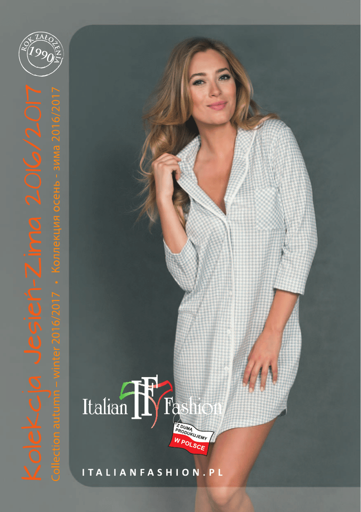 2 +NKDJBI@*DRHDŁ:HL@ 2016/2017 Collection autumn – winter 2016/2017 • Коллекция осень - зима 2016/2017 4 +NKDJBI@C@LRJ@ Szlafroki 60 +NKDJBI@LİRJ@ 70 91 +NKDJBI@BGŀNOHİB@ +NKDJBI@CYHDVBYİB@ +NKDJBI@CK@L@L 4@ADK@QNYLH@QÀV 98 114 123 3 100% bAWELNY LONG Fashion Carbon brash efekt skórki brzoskwini dla wysokich LV]F]XSā\FK HIHNWPLØNNRęFL SXV]\VWRęFL RODZINNE naturalne barwniki 4 5 1 Kontra koszula rękaw ¾ S M L XL XXL 100% bawełna - dżersej, nadruk night-dress ¾ sleeved 100% cotton – jersey, printed designs сорочка ночная рукав ¾ 100% хлопок - джерсей, набивка 6 7 2 Liza piżama długi rękaw długie spodnie S M L XL 100% bawełna bluza: ściągacz spodnie: dżersej, nadruk pyjamas long sleeved long bottom 100% cotton blouse: rib bottom: jersey, printed designs пижама длинный рукав длинные брюки 100% хлопок верх пижамы: резинка брюки: джерсей, набивка 3 Liza koszula rękaw ¾ S M L XL XXL 100% bawełna - dżersej, nadruk night-dress ¾ sleeved 100% cotton – jersey, printed designs сорочка ночная рукав ¾ 100% хлопок - джерсей, набивка 8 9 4 Sali piżama krótki rękaw długie spodnie S M L XL 100% bawełna - dżersej bluza: paski dziane pyjamas short sleeved long bottom 100% cotton – jersey blouse: knitted stripes пижама короткий рукав длинные брюки 100% хлопок - джерсей верх пижамы: вязаные полосы 5 Sali koszula krótki rękaw S M L XL 100% bawełna - dżersej paski dziane Carbon brash efekt skórki brzoskwini night-dress short sleeved 100% cotton – jersey knitted stripes сорочка ночная короткий рукав 100% хлопок - джерсей вязаные полосы 10 Carbon brash efekt skórki brzoskwini 6 Sali piżama długi rękaw długie spodnie S S/M M L XL 100% bawełna - dżersej bluza: ściągacz spodnie: paski dziane pyjamas long sleeved long bottom 100% cotton - jersey blouse: rib bottom: knitted stripes пижама длинный рукав длинные брюки 100% хлопок - джерсей верх пижамы: резинка брюки: вязаные полосы 11 12 13 LONG Fashion dla wysokich LV]F]XSā\FK 7 Abba piżama długi rękaw długie spodnie S S/M M L XL 100% bawełna - dżersej pyjamas long sleeved long bottom 100% cotton - jersey пижама длинный рукав длинные брюки 100% хлопок - джерсей 14 15 Carbon brash efekt skórki brzoskwini 8 Dafne piżama długi rękaw długie spodnie S M L XL 100% bawełna - dżersej bluza: ściągacz spodnie: paski dziane pyjamas long sleeved long bottom 100% cotton - jersey blouse: rib bottom: knitted stripes пижама длинный рукав длинные брюки 100% хлопок - джерсей верх пижамы: резинка брюки: вязаные полосы 16 Carbon brash efekt skórki brzoskwini 9 Dafne piżama krótki rękaw długie spodnie S M L XL 100% bawełna - dżersej bluza: paski dziane pyjamas short sleeved long bottom 100% cotton - jersey blouse: knitted stripes пижама короткий рукав длинные брюки 100% хлопок - джерсей верх пижамы: вязаные полосы 17 10 Dafne koszula krótki rękaw S M L XL 100% bawełna - dżersej paski dziane night-dress short sleeved 100% cotton – jersey, knitted stripes сорочка ночная короткий рукав 100% хлопок - джерсей вязаные полосы 11 Dafne koszula rękaw ¾ S M L XL XXL 100% bawełna - dżersej paski dziane night-dress ¾ sleeved 100% cotton – jersey, knitted stripes сорочка ночная рукав ¾ 100% хлопок - джерсей, вязаные полосы Carbon brash efekt skórki brzoskwini 18 szlafrok damski Aries str. 60, nr 56 19 12 Aries koszula wąskie ramiączko S M L XL XXL 100% bawełna - dżersej, nadruk night-dress bra straps 100% cotton - jersey, printed designs сорочка ночная на бретельки 100% хлопок - джерсей, набивка 13 Aries koszula długi rękaw S M L XL XXL 100% bawełna - dżersej, nadruk night-dress long sleeved 100% cotton - jersey, printed designs сорочка ночная длинный рукав 100% хлопок - джерсей, набивка 20 21 LONG Fashion dla wysokich LV]F]XSā\FK 14 Aries piżama długi rękaw długie spodnie S S/M M L XL 100% bawełna – dżersej nadruk pyjamas long sleeved long bottom 100% cotton - jersey printed designs пижама длинный рукав длинные брюки 100% хлопок - джерсей набивка 22 23 15 Finezja piżama długi rękaw długie spodnie S M L XL 100% bawełna bluza: ściągacz, sitodruk spodnie: dżersej, nadruk pyjamas long sleeved long bottom 100% cotton blouse: rib, screen print bottom: jersey, printed designs пижама длинный рукав длинные брюки 100% хлопок верх пижамы: резинка, ситодрук брюки: джерсей, набивка 24 25 16 Azalia piżama długi rękaw długie spodnie S M L XL 100% bawełna - dżersej bluza: nadruk pyjamas long sleeved long bottom 100% cotton - jersey blouse: printed designs пижама длинный рукав длинные брюки 100% хлопок - джерсей верх пижамы: набивка 26 17 Azalia piżama rękaw ¾ spodnie ¾ M L XL XXL XXXL 100% bawełna – dżersej bluza: nadruk pyjamas ¾ sleeved bottom ¾ 100% cotton - jersey blouse: printed designs пижама рукав ¾ брюки ¾ 100% хлопок - джерсей верх пижамы: набивка 18 Azalia koszula rękaw ¾ M L XL XXL XXXL 100% bawełna - dżersej, nadruk night-dress ¾ sleeved 100% cotton – jersey, printed designs сорочка ночная 