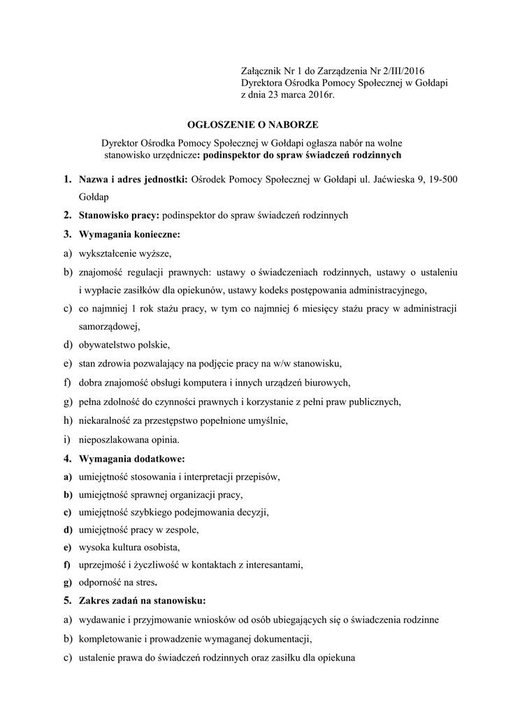 Załącznik Nr 1 do Zarządzenia Nr 2/III/2016 Dyrektora Ośrodka Pomocy Społecznej w Gołdapi z dnia 23 marca 2016r. OGŁOSZENIE O NABORZE Dyrektor Ośrodka Pomocy Społecznej w Gołdapi ogłasza nabór na wolne stanowisko urzędnicze: podinspektor do spraw świadczeń rodzinnych 1. Nazwa i adres jednostki: Ośrodek Pomocy Społecznej w Gołdapi ul. Jaćwieska 9, 19-500 Gołdap 2. Stanowisko pracy: podinspektor do spraw świadczeń rodzinnych 3. Wymagania konieczne: a) wykształcenie wyższe, b) znajomość regulacji prawnych: ustawy o świadczeniach rodzinnych, ustawy o ustaleniu i wypłacie zasiłków dla opiekunów, ustawy kodeks postępowania administracyjnego, c) co najmniej 1 rok stażu pracy, w tym co najmniej 6 miesięcy stażu pracy w administracji samorządowej, d) obywatelstwo polskie, e) stan zdrowia pozwalający na podjęcie pracy na w/w stanowisku, f) dobra znajomość obsługi komputera i innych urządzeń biurowych, g) pełna zdolność do czynności prawnych i korzystanie z pełni praw publicznych, h) niekaralność za przestępstwo popełnione umyślnie, i) nieposzlakowana opinia. 4. Wymagania dodatkowe: a) umiejętność stosowania i interpretacji przepisów, b) umiejętność sprawnej organizacji pracy, c) umiejętność szybkiego podejmowania decyzji, d) umiejętność pracy w zespole, e) wysoka kultura osobista, f) uprzejmość i życzliwość w kontaktach z interesantami, g) odporność na stres. 5. Zakres zadań na stanowisku: a) wydawanie i przyjmowanie wniosków od osób ubiegających się o świadczenia rodzinne b) kompletowanie i prowadzenie wymaganej dokumentacji, c) ustalenie prawa do świadczeń rodzinnych oraz zasiłku dla opiekuna d) opracowywanie decyzji administracyjnych w sprawie świadczeń rodzinnych oraz w sprawie zasiłku dla opiekuna e) prowadzenie rejestru decyzji w sprawach świadczeń rodzinnych, zasiłku dla opiekuna f) rozpatrywanie spraw osób zobowiązanych do zwrotu nienależnie pobranych świadczeń rodzinnych, zasiłku dla opiekuna oraz prowadzenie w tych sprawach postępowań, g) wprowadzanie i aktualizacja danych osobowych osób ubiegających się o świadczenia rodzinne, h) analiza i gromadzenie dokumentacji w sprawach świadczeń rodzinnych, i) sporządzanie list wypłat i przelewów świadczeń rodzinnych, zasiłku dla opiekuna oraz potwierdzanie ich zgodności z decyzjami administracyjnymi i terminowe przekazywanie do dalszej realizacji, j) przestrzeganie realizacji planów budżetowych, k) planowanie świadczeń i sprawozdawczość, l) współpraca z Regionalnym Ośrodkiem Polityki Społecznej w zakresie ustalenia prawa do świadczeń rodzinnych w przypadku podjęcia pracy członka rodziny poza granicami RP. 6. Informacja o warunkach pracy: a) wymiar czasu pracy: 1 etat, pierwsza umowa o pracę na czas określony z możliwością przedłużenia na czas nieokreślony, termin zatrudnienia: kwiecień 2016r. b) miejsce pracy: stanowisko pracy mieści się na parterze budynku Ośrodka Pomocy Społecznej w Gołdapi bez windy. Budynek Ośrodka wyposażony jest w podjazd umożliwiający wjazd do budynku wózkiem inwalidzkim. Toaleta dostosowana do wózków inwalidzkich. c) stanowisko pracy: praca administracyjno - biurowa, w systemie jednozmianowym, praca przy monitorze ekranowym powyżej 4 godzin, bezpośredni kontakt z interesantami, 40 godzinny tygodniowy wymiar czasu pracy. d) wskaźnik zatrudnienia osób niepełnosprawnych w Ośrodku Pomocy Społecznej w Gołdapi w lutym 2016r., w rozumieniu przepisów o rehabilitacji zawodowej i społecznej oraz zatrudnianiu osób niepełnosprawnych, wynosił więcej niż 6%. 7. Wymagane dokumenty: 1) CV (curriculum vitae). 2) List motywacyjny. 3) Kopie dokumentów poświadczających wykształcenie (dyplomy, zaświadczenia o ukończonych kursach, szkoleniach). 4) Kopie dokumentów potwierdzających zatrudnienie (świadectwa pracy). świadectwa, 5) Kwestionariusz dla osoby ubiegającej się o zatrudnienie. 6) Oświadczenie kandydata o niekaralności za przestępstwo popełnione umyślnie lub informacja o niekaralności z Krajowego Rejestru Karnego opatrzone datą nie wcześniej niż miesiąc przed złożeniem. 7) Oświadczenie lub zaświadczenie lekarskie o stanie zdrowia stwierdzające, że stan zdrowia kandydata pozwala na zatrudnienie na stanowisku podinspektora do spraw świadczeń rodzinnych. 8) Oświadczenie o posiadaniu obywatelstwa polskiego. 9) Oświadczenie o pełnej zdolności do czynności prawnych oraz korzystaniu z pełni praw publicznych. 10) W przypadku, gdy kandydatem jest osoba niepełnosprawna, kopia dokumentu potwierdzającego niepełnosprawność. 11) Inne dodatkowe dokumenty o posiadanych kwalifikacjach i umiejętnościach. WAŻNE Wymagane dokumenty aplikacyjne: list motywacyjny, szczegółowe CV powinny być opatrzone klauzulą: Wyrażam zgodę na przetwarzanie moich danych osobowych zawartych w ofercie pracy dla potrzeb niezbędnych do realizacji procesu rekrutacji zgodnie z ustawą z dnia 29 sierpnia 1997 r. o ochronie danych osobowych (t.j. Dz. U. z 2014 r. poz. 1182 ze zm.) oraz usta wą z dnia 21 listopada 2008 r. pracownikach samorządowych (t.j. Dz.U 2014, poz.1202). Ww. klauzula musi być podpisana przez osobę ubiegającą się o zatrudnienie. Brak podpisu na w/w dokumentach oraz brak podpisu pod klauzulą skutkować będzie odrzuceniem oferty. Brak któregokolwiek z wymaganych dokumentów skutkuje odrzuceniem oferty. 8. Miejsce i termin złożenia dokumentów Wymagane dokumenty aplikacyjne należy składać w siedzibie Ośrodka Pomocy Społecznej w Gołdapi – sekretariat pokój nr 13 lub na adres: Ośrodek Pomocy Społecznej w Gołdapi, ul. Jaćwieska 9, 19-500 Gołdap w terminie do dnia 4 kwietnia 2016r. do godz. 12.00 w zamkniętej nieprzezroczystej kopercie z dopiskiem: „NABÓR NA STANOWISKO PODINSPEKTOR DO SPRAW ŚWIADCZEŃ RODZINNYCH” (w przypadku wysłania dokumentów pocztą decyduje data i godzina ich doręczenia do Ośrodka Pomocy Społecznej w Gołda