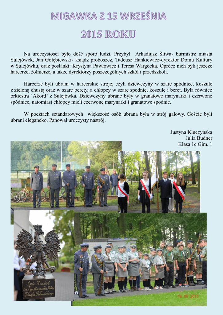 Na uroczystości było dość sporo ludzi. Przybył Arkadiusz Śliwa- burmistrz miasta Sulejówek, Jan Gołębiewski- ksiądz proboszcz, Tadeusz Hankiewicz-dyrektor Domu Kultury w Sulejówku, oraz posłanki: Krystyna Pawłowicz i Teresa Wargocka. Oprócz nich byli jeszcze harcerze, żołnierze, a także dyrektorzy poszczególnych szkół i przedszkoli. Harcerze byli ubrani w harcerskie stroje, czyli dziewczyny w szare spódnice, koszule z zieloną chustą oraz w szare berety, a chłopcy w szare spodnie, koszule i beret. Była również orkiestra ‘Akord’ z Sulejówka. Dziewczyny ubrane były w granatowe marynarki i czerwone spódnice, natomiast chłopcy mieli czerwone marynarki i granatowe spodnie. W pocztach sztandarowych większość osób ubrana była w strój galowy. Goście byli ubrani elegancko. Panował uroczysty nastrój. Justyna Kluczyńska Julia Budner Klasa 1c Gim. 1