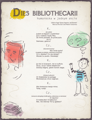 humoreska w jednym akcie K. Libros lege! Quae legeris, memento! Marcus Porcius Cato Maior Censorius (do siebie) Jużem w łapach czytelnika! Już z radości kozły fika, że mnie posiadł, że przeczyta. (do Cz.) Siemasz, gościu! Cz. (skonsternowany) Kto mnie pyta? (rozgląda się dokoła, cokolwiek strwożony) Co u diaska? Co się dzieje? Wszak tu pusto. Oszaleję! K. Ja nie w ścianach, nie w suficie. Oczy, oczy! Gdzie błądzicie? Dzisiaj sięgnij, gdzie wzrok sięga. Cz. (drżącym głosem) O! Diabelska ta potęga Mickiewicza chce naginać. K. Ale śmieszna twoja mina. Tutaj, tutaj! Cz. (wreszcie odnajduje źródło głosu, zdziwiony co niemiara) O rajuniu! O mateczko! O babuniu! Nie, nie wierzę! To ty gadasz? K. Zaraz zmysły swe postradasz, więc uspokój się, człowieku, bo dostałeś już wypieków. Cz. To możliwe? Co za cuda? Śnię na jawie? Przecież czuwam. Jestem trzeźwy, nic nie piłem, chyba tracę głowy siłę. K. To jest prawda, to jest jawa, tegoś jeszcze nie doznawał. To jest, bracie, wyrok boski. Wyrok poznać – nie twe troski. Tyle tylko wiedzieć musisz, że gdy majem świat się puszy, a dokładnie, gdy raz ósmy słońce wschodzi – ciepłe, tuszmy, wtedy ludzkim mówię głosem i naukę pewną niosę. Cz. (pogodzony z dziwną sytuacją) No, to słucham. O co chodzi? K. Dziś na nowo się narodzisz. Będzie pełna twoja wiedza, oto ona cię nawiedza. (mentorskim tonem, niczym profesor egzaminujący studenta) Skąd się wzięłam? Cz. (na stronie) Ale głupia! (już do K.) Z biblioteki. (znów na stronie) Się nie skupiam, gdy pytania takie proste rozmówczyni mej żałosnej. K. (poirytowana) Stąd mnie wziąłeś, ty baranie, ale skądem tam na stanie? Cz. (drapie się po głowie, po czym olśniony) No, z księgarni lub hurtowni. K. (z politowaniem) Równie dobrze i z cukrowni. (znów mentorsko) To posłuchaj, bracie miły, ile ludzkiej trzeba siły, bym dotarła do odbiorcy. To dla ciebie jak egzorcyzm. Pierwiej działa gromadzenie, co namierza nowe mienie. Potem trzeba to zakupić. Cz. (z rosnącym zdziwieniem, spontanicznie wyrywa mu się łagodne przekleństwo) Ożeż w mordę…! K. (surowo) Niech się skupi! Już jest księga w bibliotece, lecz wy jeszcze nic nie wiecie. Teraz opracować trzeba, to jest trudny kawał chleba. To U-Ka-De i opisy - karczowanie głuchej dziczy, słów kluczowych cała masa. Ich to praca – łatwość nasza. No i wreszcie dział kolejny, równie mocny, równie dzielny. Udostępnień to agenda, nie ma mowy tu o błędach. No i w końcu księga twoja, po przeprawach, po przebojach. Cz. Ożeż orzech! O orzeszek! No to niezły był mój grzeszek. Bo jam tylko wypożyczał, o tej drodze nie rozmyślał. K. (łagodniej) A skąd wiedział o książnicy? Cz. (znów drapie się po głowie) K. Niech pamięci już nie ćwiczy. Są wszak działy promowania, by nie było już bajania, by nie było już zarzutów, że ksiąg nowych nie ma rzutów. Cz. No, nie mogę! Ale praca! Ty mnie dzisiaj, o!, nawracasz! Ale zaraz, jeszcze jedno. Ja rozumiem rozmów sedno, lecz jest jeszcze Ibuk Libra… K. (na stronie) Czyżby myślał, że tu wygra? (do Cz., wraca do tonu mentorskiego) No to pomyśl, mój chłopaku, skąd Ibuki są w OPAC-u. Czytać łatwo wszędzie przecież, w domu, parku, całym świecie. Lecz by właśnie tak się działo, pracy trzeba tu niemało. Bo me siostry nowoczesne, jak i księgi te cielesne, wymagają też tej drogi. Cz. Moi kumple, o!, niebogi. Oni o tym nic nie wiedzą, lecę do nich z egzegezą. (zrywa się, chcą biec i objaśniać wszem i wobec, niczym natchnieni egzegeci wyjaśniający święte teksty, pracę bibliotekarzy) K. (władczo) Stój! Zaczekaj jeszcze trochę! Czemu dziś ci tę radochę daję? Pomyśl! Cz. (po raz trzeci drapie się po głowie) Myśli zero. K. (z ironią) Niespodzianka to dopiero. (znów łagodniej) Otóż czemu dziś ja prawię i po ludzku cię ciekawię? Bo ma święto bibliotekarz, to więc wszystkim dzisiaj przekaż. Cz. (z pokorą) Nie wiedziałem. Ale kicha! Zatem lecę już do Zdzicha. Do książnicy wnet poleciem, podziękować pięknym kwieciem. Podziękować tym mocarzom, niech bogowie wciąż im darzą. (wybiega) K. (z ulgą) Aż włączyła mu się mowa staropolska, pradziadowa. Ot i uczeń mój jest nowy, niech naucza inne głowy. (wchodzi para bibliotekarzy, pochłonięci cichą rozmową zmierzają zapewne na piknik bibliotekarski; K. zastępuje im drogę, wyciąga spośród swoich stronic luźną kartkę i czyta) K. Moi mili, o, kochani! Dziś już wiedzą i barani, jaka wielka Wasza praca, co się w wiedzę wciąż obraca. A ja bez Was jestem niczym, księga wszelka na Was liczy. Niech Wam darzy Nieb potęga! Podpisano – Wdzięczna Księga. Kurtyna Zbigniew Jan Meller