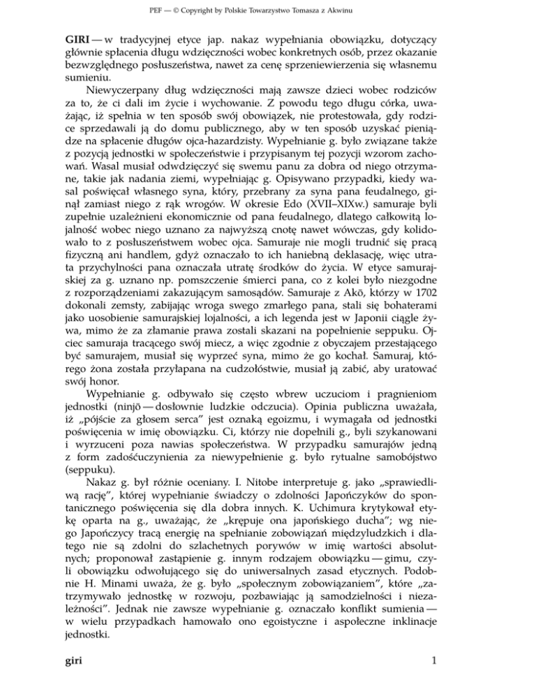 PEF — © Copyright by Polskie Towarzystwo Tomasza z Akwinu GIRI — w tradycyjnej etyce jap. nakaz wypełniania obowiązku, dotyczący głównie spłacenia długu wdzięczności wobec konkretnych osób, przez okazanie bezwzględnego posłuszeństwa, nawet za cenę sprzeniewierzenia się własnemu sumieniu. Niewyczerpany dług wdzięczności mają zawsze dzieci wobec rodziców za to, że ci dali im życie i wychowanie. Z powodu tego długu córka, uważając, iż spełnia w ten sposób swój obowiązek, nie protestowała, gdy rodzice sprzedawali ją do domu publicznego, aby w ten sposób uzyskać pieniądze na spłacenie długów ojca-hazardzisty. Wypełnianie g. było związane także z pozycją jednostki w społeczeństwie i przypisanym tej pozycji wzorom zachowań. Wasal musiał odwdzięczyć się swemu panu za dobra od niego otrzymane, takie jak nadania ziemi, wypełniając g. Opisywano przypadki, kiedy wasal poświęcał własnego syna, który, przebrany za syna pana feudalnego, ginął zamiast niego z rąk wrogów. W okresie Edo (XVII–XIXw.) samuraje byli zupełnie uzależnieni ekonomicznie od pana feudalnego, dlatego całkowitą lojalność wobec niego uznano za najwyższą cnotę nawet wówczas, gdy kolidowało to z posłuszeństwem wobec ojca. Samuraje nie mogli trudnić się pracą fizyczną ani handlem, gdyż oznaczało to ich haniebną deklasację, więc utrata przychylności pana oznaczała utratę środków do życia. W etyce samurajskiej za g. uznano np. pomszczenie śmierci pana, co z kolei było niezgodne z rozporządzeniami zakazującym samosądów. Samuraje z Akō, którzy w 1702 dokonali zemsty, zabijając wroga swego zmarłego pana, stali się bohaterami jako uosobienie samurajskiej lojalności, a ich legenda jest w Japonii ciągle żywa, mimo że za złamanie prawa zostali skazani na popełnienie seppuku. Ojciec samuraja tracącego swój miecz, a więc zgodnie z obyczajem przestającego być samurajem, musiał się wyprzeć syna, mimo że go kochał. Samuraj, którego żona została przyłapana na cudzołóstwie, musiał ją zabić, aby uratować swój honor. Wypełnianie g. odbywało się często wbrew uczuciom i pragnieniom jednostki (ninjō — dosłownie ludzkie odczucia). Opinia publiczna uważała, iż „pójście za głosem serca” jest oznaką egoizmu, i wymagała od jednostki poświęcenia w imię obowiązku. Ci, którzy nie dopełnili g., byli szykanowani i wyrzuceni poza nawias społeczeństwa. W przypadku samurajów jedną z form zadośćuczynienia za niewypełnienie g. było rytualne samobójstwo (seppuku). Nakaz g. był różnie oceniany. I. Nitobe interpretuje g. jako „sprawiedliwą rację”, której wypełnianie świadczy o zdolności Japończyków do spontanicznego poświęcenia się dla dobra innych. K. Uchimura krytykował etykę oparta na g., uważając, że „krępuje ona japońskiego ducha”; wg niego Japończycy tracą energię na spełnianie zobowiązań międzyludzkich i dlatego nie są zdolni do szlachetnych porywów w imię wartości absolutnych; proponował zastąpienie g. innym rodzajem obowiązku — gimu, czyli obowiązku odwołującego się do uniwersalnych zasad etycznych. Podobnie H. Minami uważa, że g. było „społecznym zobowiązaniem”, które „zatrzymywało jednostkę w rozwoju, pozbawiając ją samodzielności i niezależności”. Jednak nie zawsze wypełnianie g. oznaczało konflikt sumienia — w wielu przypadkach hamowało ono egoistyczne i aspołeczne inklinacje jednostki. giri 1 PEF — © Copyright by Polskie Towarzystwo Tomasza z Akwinu Bibliografia: I. Nitobé, Bushidō. The Soul of Japan, Tok 1900, 191825 , Rutland 1987 (Bushidō. Dusza Japonii, Wwa 1993, Bd 2000); H. Minami, Nihonjin no shinri, Tok 1953, 19578 (Psychology of the Japanese People, Tok 1971); S. Ienaga, Nihon dōtoku shisōshi, Tok 1957, 1987; S. Tsuda, Bungaku ni arawaretaru waga kokumin shisō no kenkyu, III, Tok 1966 (An Inquiry into Japanese Mind as Mirrored in Literature, Tok 1970); The Japanese Mind. Essentials of Japanese Philosophy and Culture, Honolulu 1967; A. Kozyra, Samurajskie chrześcijaństwo, Wwa 1994. Agnieszka Kozyra giri 2