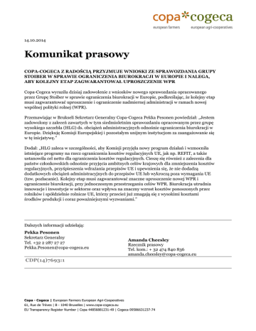 14.10.2014 Komunikat prasowy COPA-COGECA Z RADOŚCIĄ PRZYJMUJE WNIOSKI ZE SPRAWOZDANIA GRUPY STOIBER W SPRAWIE OGRANICZENIA BIUROKRACJI W EUROPIE I NALEGA, ABY KOLEJNY ETAP ZAGWARANTOWAŁ UPROSZCZENIE WPR Copa-Cogeca wyraziła dzisiaj zadowolenie z wniosków nowego sprawozdania opracowanego przez Grupę Stoiber w sprawie ograniczenia biurokracji w Europie, podkreślając, że kolejny etap musi zagwarantować uproszczenie i ograniczenie nadmiernej administracji w ramach nowej wspólnej polityki rolnej (WPR). Przemawiając w Brukseli Sekretarz Generalny Copa-Cogeca Pekka Pesonen powiedział: „Jestem zadowolony z zaleceń zawartych w tym siedmioletnim sprawozdaniu opracowanym przez grupę wysokiego szczebla (HLG) ds. obciążeń administracyjnych odnośnie ograniczenia biurokracji w Europie. Dziękuję Komisji Europejskiej i pozostałym unijnym instytucjom za zaangażowanie się w tę inicjatywę.” Dodał: „HLG zaleca w szczególności, aby Komisji przyjęła nowy program działań i wzmocniła istniejące programy na rzecz ograniczenia kosztów regulacyjnych UE, jak np. REFIT, a także ustanowiła cel netto dla ograniczenia kosztów regulacyjnych. Cieszę się również z zalecenia dla państw członkowskich odnośnie przyjęcia ambitnych celów krajowych dla zmniejszenia kosztów regulacyjnych, przyśpieszenia wdrażania przepisów UE i upewnienia się, że nie dodadzą dodatkowych obciążeń administracyjnych do przepisów UE lub wykroczą poza wymagania UE (tzw. pozłacanie). Kolejny etap musi zagwarantować znaczne uproszczenie nowej WPR i ograniczenie biurokracji, przy jednoczesnym przestrzeganiu celów WPR. Biurokracja utrudnia innowacje i inwestycje w sektorze oraz wpływa na znaczny wzrost kosztów ponoszonych przez rolników i spółdzielnie rolnicze UE, którzy przecież już zmagają się z wysokimi kosztami środków produkcji i coraz poważniejszymi wyzwaniami.” Dalszych informacji udzielają: Pekka Pesonen Sekretarz Generalny Tel. +32 2 287 27 27 [email protected] Amanda Cheesley Rzecznik prasowy Tel. kom.: + 32 474 840 836 [email protected] CDP(14)7693:1 Copa - Cogeca | European Farmers European Agri-Cooperatives 61, Rue de Trèves | B - 1040 Bruxelles | www.copa-cogeca.eu EU Transparency Register Number | Copa 44856881231-49 | Cogeca 09586631237-74