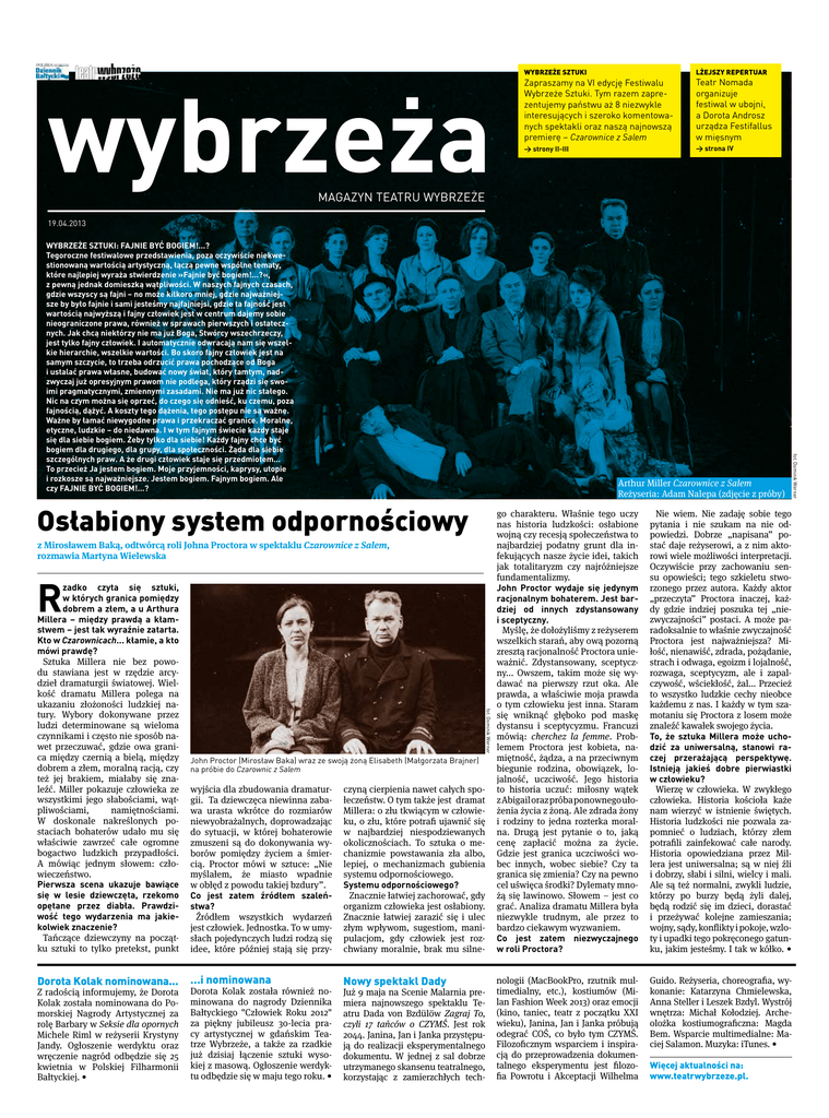 wybrzeża Lżejszy repertuar Wybrzeże Sztuki Zapraszamy na VI edycję Festiwalu Wybrzeże Sztuki. Tym razem zaprezentujemy państwu aż 8 niezwykle interesujących i szeroko komentowanych spektakli oraz naszą najnowszą premierę – Czarownice z Salem Teatr Nomada organizuje festiwal w ubojni, a Dorota Androsz urządza Festifallus w mięsnym → strony II-III → strona IV Magazyn Teatru Wybrzeże 19.04.2013 Arthur Miller Czarownice z Salem Reżyseria: Adam Nalepa (zdjęcie z próby) Osłabiony system odpornościowy z Mirosławem Baką, odtwórcą roli Johna Proctora w spektaklu Czarownice z Salem, rozmawia Martyna Wielewska R wyjścia dla zbudowania dramaturgii. Ta dziewczęca niewinna zabawa urasta wkrótce do rozmiarów niewyobrażalnych, doprowadzając do sytuacji, w której bohaterowie zmuszeni są do dokonywania wyborów pomiędzy życiem a śmiercią. Proctor mówi w sztuce: „Nie myślałem, że miasto wpadnie w obłęd z powodu takiej bzdury”. Co jest zatem źródłem szaleństwa? Źródłem wszystkich wydarzeń jest człowiek. Jednostka. To w umysłach pojedynczych ludzi rodzą się idee, które później stają się przy- czyną cierpienia nawet całych społeczeństw. O tym także jest dramat Millera: o złu tkwiącym w człowieku, o złu, które potrafi ujawnić się w najbardziej niespodziewanych okolicznościach. To sztuka o mechanizmie powstawania zła albo, lepiej, o mechanizmach gubienia systemu odpornościowego. Systemu odpornościowego? Znacznie łatwiej zachorować, gdy organizm człowieka jest osłabiony. Znacznie łatwiej zarazić się i ulec złym wpływom, sugestiom, manipulacjom, gdy człowiek jest rozchwiany moralnie, brak mu silne- Dorota Kolak nominowana... …i nominowana Nowy spektakl Dady Z radością informujemy, że Dorota Kolak została nominowana do Pomorskiej Nagrody Artystycznej za rolę Barbary w Seksie dla opornych Michele Riml w reżyserii Krystyny Jandy. Ogłoszenie werdyktu oraz wręczenie nagród odbędzie się 25 kwietnia w Polskiej Filharmonii Bałtyckiej. • fot. Dominik Werner zadko czyta się sztuki, w których granica pomiędzy dobrem a złem, a u Arthura Millera – między prawdą a kłamstwem – jest tak wyraźnie zatarta. Kto w Czarownicach... kłamie, a kto mówi prawdę? Sztuka Millera nie bez powodu stawiana jest w rzędzie arcydzieł dramaturgii światowej. Wielkość dramatu Millera polega na ukazaniu złożoności ludzkiej natury. Wybory dokonywane przez ludzi determinowane są wieloma czynnikami i często nie sposób nawet przeczuwać, gdzie owa granica między czernią a bielą, między dobrem a złem, moralną racją, czy też jej brakiem, miałaby się znaleźć. Miller pokazuje człowieka ze wszystkimi jego słabościami, wątpliwościami, namiętnościami. W doskonale nakreślonych postaciach bohaterów udało mu się właściwie zawrzeć całe ogromne bogactwo ludzkich przypadłości. A mówiąc jednym słowem: człowieczeństwo. Pierwsza scena ukazuje bawiące się w lesie dziewczęta, rzekomo opętane przez diabła. Prawdziwość tego wydarzenia ma jakiekolwiek znaczenie? Tańczące dziewczyny na początku sztuki to tylko pretekst, punkt John Proctor (Mirosław Baka) wraz ze swoją żoną Elisabeth (Małgorzata Brajner) na próbie do Czarownic z Salem Dorota Kolak została również nominowana do nagrody Dziennika Bałtyckiego "Człowiek Roku 2012" za piękny jubileusz 30-lecia pracy artystycznej w gdańskim Teatrze Wybrzeże, a także za rzadkie już dzisiaj łączenie sztuki wysokiej z masową. Ogłoszenie werdyktu odbędzie się w maju tego roku. • Już 9 maja na Scenie Malarnia premiera najnowszego spektaklu Teatru Dada von Bzdülöw Zagraj To, czyli 17 tańców o CZYMŚ. Jest rok 2044. Janina, Jan i Janka przystępują do realizacji eksperymentalnego dokumentu. W jednej z sal dobrze utrzymanego skansenu teatralnego, korzystając z zamierzchłych tech- go charakteru. Właśnie tego uczy nas historia ludzkości: osłabione wojną czy recesją społeczeństwa to najbardziej podatny grunt dla infekujących nasze życie idei, takich jak totalitaryzm czy najróżniejsze fundamentalizmy. John Proctor wydaje się jedynym racjonalnym bohaterem. Jest bardziej od innych zdystansowany i sceptyczny. Myślę, że dołożyliśmy z reżyserem wszelkich starań, aby ową pozorną zresztą racjonalność Proctora unieważnić. Zdystansowany, sceptyczny... Owszem, takim może się wydawać na pierwszy rzut oka. Ale prawda, a właściwie moja prawda o tym człowieku jest inna. Staram się wniknąć głęboko pod maskę dystansu i sceptycyzmu. Francuzi mówią: cherchez la femme. Problemem Proctora jest kobieta, namiętność, żądza, a na przeciwnym biegunie rodzina, obowiązek, lojalność, uczciwość. Jego historia to historia uczuć: miłosny wątek z Abigail oraz próba ponownego ułożenia życia z żoną. Ale zdrada żony i rodziny to jedna rozterka moralna. Drugą jest pytanie o to, jaką cenę zapłacić można za życie. Gdzie jest granica uczciwości wobec innych, wobec siebie? Czy ta granica się zmienia? Czy na pewno cel uświęca środki? Dylematy mnożą się lawinowo. Słowem – jest co grać. Analiza dramatu Millera była niezwykle trudnym, ale przez to bardzo ciekawym wyzwaniem. Co jest zatem niezwyczajnego w roli Proctora? Nie wiem. Nie zadaję sobie tego pytania i nie szukam na nie odpowiedzi. Dobrze „napisana” postać daje reżyserowi, a z nim aktorowi wiele możliwości interpretacji. Oczywiście przy zachowaniu sensu opowieści; tego szkieletu stworzonego przez autora. Każdy aktor „przeczyta” Proctora inaczej, każdy gdzie indziej poszuka tej „niezwyczajności” postaci. A może paradoksalnie to właśnie zwyczajność Proctora jest najważniejsza? Miłość, nienawiść, zdrada, pożądanie, strach i odwaga, egoizm i lojalność, rozwaga, sceptycyzm, ale i zapalczywość, wściekłość, żal... Przecież to wszystko ludzkie cechy nieobce każdemu z nas. I każdy w tym szamotaniu się Pr