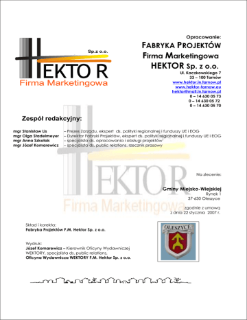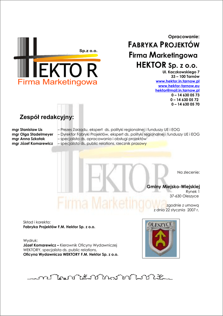 Opracowanie: Sp.z o.o. EKTO R Firma Marketingowa FABRYKA PROJEKTÓW Firma Marketingowa HEKTOR Sp. z o.o. Ul. Kaczkowskiego 7 33 – 100 Tarnów www.hektor.in.tarnow.pl www.hektor-tarnow.eu [email protected] 0 – 14 630 05 73 0 – 14 630 05 72 0 – 14 630 05 70 Zespół redakcyjny: mgr Stanisław Lis mgr Olga Stadelmeyer mgr Anna Szkotak mgr Józef Komarewicz – Prezes Zarządu, ekspert ds. polityki regionalnej i funduszy UE i EOG – Dyrektor Fabryki Projektów, ekspert ds. polityki regionalnej i funduszy UE i EOG – specjalista ds. opracowania i obsługi projektów – specjalista ds. public relations, rzecznik prasowy Na zlecenie: Gminy Miejsko-Wiejskiej Rynek 1 37-630 Oleszyce zgodnie z umową z dnia 22 stycznia 2007 r. Skład i korekta: Fabryka Projektów F.M. Hektor Sp. z o.o. Wydruk: Józef Komarewicz – Kierownik Oficyny Wydawniczej WEKTORY, specjalista ds. public relations, Oficyna Wydawnicza WEKTORY F.M. Hektor Sp. z o.o.