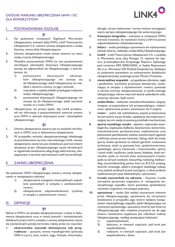 OGÓLNE WARUNKI UBEZPIECZENIA NNW I OC DLA ROWERZYSTÓW I. POSTANOWIENIA OGÓLNE 1. Na podstawie niniejszych Ogólnych Warunków Ubezpieczenia, zwanych dalej OWU, Link4 Towarzystwo Ubezpieczeń S.A. zawiera umowę ubezpieczenia z osobą fizyczną, zwaną dalej Ubezpieczającym. Umowa ubezpieczenia może zostać zawarta na rzecz osoby trzeciej (Ubezpieczonego). Wszelkie postanowienia OWU (w tym postanowienia określające obowiązki) dotyczące Ubezpieczającego stosuje się odpowiednio do Ubezpieczonego, z zastrzeżeniem, że: 1) postanowień dotyczących obowiązków Ubezpieczającego nie stosuje się do Ubezpieczonego, jeżeli Ubezpieczony nie wiedział o zawarciu umowy na jego rachunek, 2) roszczenie o zapłatę składki przysługuje wyłącznie wobec Ubezpieczającego, 3) postanowień dotyczących Ubezpieczającego nie stosuje się do Ubezpieczonego, jeżeli wyraźnie wynika to z treści OWU. Ubezpieczony ma prawo żądać, aby Link4 przedstawił mu informacje o postanowieniach zawartej umowy oraz OWU w zakresie dotyczącym praw i obowiązków Ubezpieczonego. §1 2. 3. 4. §2 1. 2. II. 2. 3. 4. 5. 6. 7. 8. Umowa ubezpieczenia zawarta jest na zasadach określonych w OWU oraz w dokumencie ubezpieczenia. W przypadku wniosku ubezpieczeniowego składanego za pośrednictwem serwisu internetowego Link4, umowa ubezpieczenia zawierana jest dodatkowo pod warunkiem akceptacji przez Ubezpieczającego zasad określonych w regulaminie świadczenia usług drogą elektroniczną, udostępnionym w serwisie internetowym Link4 (www.link4.pl). ZAKRES UBEZPIECZENIA §3 Na podstawie OWU Ubezpieczający zawiera umowę ubezpieczenia w następującym zakresie: 1) ubezpieczenie następstw nieszczęśliwych wypadków powstałych w związku z użytkowaniem roweru, 2) ubezpieczenie odpowiedzialności cywilnej w związku z użytkowaniem roweru. III. DEFINICJE §4 Ilekroć w OWU, we wniosku ubezpieczeniowym, a także w dokumencie ubezpieczenia oraz w innych pismach i oświadczeniach składanych przez Link4 w związku z umową ubezpieczenia używa się wymienionych poniżej terminów, należy przez nie rozumieć: 1. ekstremalne warunki klimatyczne lub przyrodnicze – pustynia, tereny wysokogórskie (powyżej 5500 m.n.p.m.), busz, tundra, tajga, Arktyka, Antarktyka, 9. 10. dżungla, tereny lodowcowe i tereny śnieżne wymagające użycia sprzętu zabezpieczającego lub asekuracyjnego, franszyza integralna – wskazana w niniejszych OWU wartość kwotowa, do wysokości której Link4 nie ponosi odpowiedzialności odszkodowawczej, lekarz – osoba posiadająca uprawnienia do wykonywania zawodu lekarza, niebędąca osobą bliską Ubezpieczającego, Link4 – Link4 Towarzystwo Ubezpieczeń S.A. z siedzibą w Warszawie, przy ulicy Postępu 15, wpisane do rejestru przedsiębiorców Krajowego Rejestru Sądowego pod numerem KRS 0000142452, w Sądzie Rejonowym dla m.st. Warszawy XIII Wydział Gospodarczy, działające na podstawie zezwolenia na wykonywanie działalności ubezpieczeniowej wydanego przez Ministra Finansów, nieszczęśliwy wypadek – przypadkowe zdarzenie, nagłe i gwałtowne, wywołane przyczyną zewnętrzną i pozostającą w związku z użytkowaniem roweru, powstałe w okresie ochrony ubezpieczeniowej, w wyniku którego Ubezpieczający wbrew swej woli doznał uszkodzenia ciała, rozstroju zdrowia, bądź zmarł, osoba bliska – małżonek, konkubent/konkubina, zstępny, wstępny, przysposobiony lub przysposabiający, rodzeństwo, opiekunowie prawni, powinowaci do II stopnia, rower – jedno lub wielośladowy pojazd przeznaczony do poruszania się po drodze, napędzany siłą mięśni poruszającej się nim osoby za pomocą przekładni mechanicznej, sporty wysokiego ryzyka – alpinizm, wspinaczka wysokogórska, wspinaczka skałkowa, baloniarstwo, lotniarstwo, motolotniarstwo, paralotniarstwo, szybownictwo oraz pilotowanie jakichkolwiek statków powietrznych (zgodnie z definicją ustawy prawo lotnicze), rafting, skoki do wody, sporty wodne uprawiane na rzekach górskich, nurkowanie techniczne, skoki na gumowej linie, spadochroniarstwo, speleologia, sporty motorowe i motorowodne, sporty i sztuki walki, myślistwo, jazda konna, bobsleje, skoki narciarskie, jazda na nartach poza wyznaczonymi trasami, jazda na nartach wodnych, kitesurfing, heliskiing, heliboarding, mountainboarding, parkur, free run, B.A.S.E. jumping, downhil, streetluge, udział w wyścigach wszelkiego rodzaju oraz jazdach próbnych przed wyścigami, a także próbach szybkościowych poza lekkoatletyką i pływaniem, trwały uszczerbek na zdrowiu – fizyczne, trwałe naruszenie sprawności organizmu, w następstwie nieszczęśliwego wypadku, które powoduje upośledzenie czynności organizmu nierokujące poprawy, uposażony – osoba (lub osoby) wyznaczona imiennie przez Ubezpieczającego, uprawniona do otrzymania świadczenia w przypadku jego śmierci będącej następstwem nieszczęśliwego wypadku. Jeżeli Ubezpieczający nie wyznaczył uposażonego, uposażony zmarł przed śmiercią Ubezpieczającego albo umyślnie przyczynił się do jego śmierci, świadczenie wypłacane jest członkom rodziny Ubezpieczającego, według następującej kolejności: 1) współmałżonkowi, 2) dzieciom, w równych częściach, jeśli brak jest współmałżonka, 3) rodzicom, w równych częściach, jeśli brak jest współmałżonka i dzieci, 2 | Link4 Ogólne Warunki Ubezpieczenia 11. 12. 13. IV. rodzeństwu w równych częściach, jeśli brak jest współmałżonka, dzieci i rodziców, 5) innym ustawowym spadkobiercom w równych częściach, jeśli brak jest współmałżonka, dzieci, rodziców i rodzeństwa, użytkowanie roweru – kierowanie rowerem, prowadzenie roweru oraz wsiadanie i zsiadanie z roweru, wyczynowe uprawianie sportu – uprawianie dyscypliny sportu w ramach zarejestrowanych sekcji, klubów lub organizacji sportowych w celu uzyskania maksymalnych wyników, polegające na regularnym uczestniczeniu w treningach, zawodach i turniejach, zd