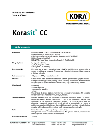 ® Pozwolenia Rozporządzenie EU 528/2012: Wniosek nr: BC-DQ003485-38, Pozwolenie Ministra Zdrowia Polska 5655/14, CTB-P+ (Centre Technique du Bois et de L’Ameublement, F-75012 Paris) Nr identyfikacyjny: 9-3400-49 NTR/NWPC (Nordic Wood Preservation Council); Nr Certyfikatu:186 Klasy użytkowe 3,4 (zgodnie z EN335) 1,2,3a,3b,4 (zgodnie z FCBA) A, M (zgodnie z NTR/NWPC) Rodzaj produktu Koncentrat soli w postaci płynnej na bazie związków miedzi i chromu, rozpuszczalny w wodzie, utrwalający się w drewnie. Przeznaczony wyłącznie do impregnacji drewna zgodnie z niniejszą instrukcją. Substancje czynne 100 g zawiera: 17,7 g wodorotlenku miedzi Działanie Chroni drewno przed szkodliwym działaniem grzybów (podstawczaki i grzyby rozkładu szarego) i owadów (spuszczel pospolity, kołatek domowy). Po utrwaleniu w drewnie trudno wymywalny, odporny na działanie warunków atmosferycznych, nieszkodliwy dla roślin. Właściwości • utrwala się • wysoce skuteczny • rozpuszczalny w wodzie • płynny Standardowo stosowane stężenia roztworów nie powodują korozji żelaza, stali ani szkła. Nietolerowany przez metale kolorowe, np. cynk, mosiądz. Zakres stosowania Preparat ochronny może być stosowany w zakresach określonych normą DIN 68800-3 przyporządkowanych klasom użytkowania 3 lub 4. Do elementów nośnych i/lub stabilizujących, np. konstrukcji drewnianych, podpór i. in.. Przeznaczony również do elementów drewnianych, niepełniących funkcji nośnych, w szczególności np. drewna w architekturze ogrodowej i krajobrazu, do chłodni kominowych, ogrodzeń, palisad, słupków, masztów, palików do winorośli, drewnianej kostki brukowej, paneli drewnianych. Kolor Koncentrat i roztwór mają barwę własną w odcieniu brązu. Impregnowane drewno posiada kolor szarozielony. Na życzenie możliwe jest zabarwienie roztworu pastami koloryzującymi Korasit Farbpasten. Pojemność opakowań 1500 kg Kurt Obermeier GmbH & Co. KG Berghäuser Straße 70 D-57319 Bad Berleburg Telefon +49 2751 524-0 Telefax +49 2751 5041 www.kora-holzschutz.de/pl [email protected] 1 Gęstość ok. 1,65 g/cm³ (20 °C) Współczynnik pH ok. 2-3 (4%-owy roztwór roboczy) ży Sposób nanoszenia Impregnacja ciśnieniowa Dawki Zgodnie z narodowymi pozwoleniami. Do uzyskania wystarczających dawek z reguły stosuje się standardowe stężenia roztworów w zakresie 2-4%. Proszę skorzystać z naszej pomocy technicznej. Przygotowanie roztworu do impregnacji Korasit® CC można mieszać z wodą w dowolnych proporcjach. Dodawać do odpowiedniej ilości wody, ciągle mieszając, następuje szybkie rozpuszczanie. Im cieplejsza woda, tym szybszy proces rozpuszczania. Temperatura roztworu do impregnacji nie powinna być niższa niż +5 °C i wyższa niż + 30 °C. W przypadku mieszania z innymi produktami proszę koniecznie skorzystać z naszej pomocy technicznej. Kontrola stężenia roztworu Stężenie roztworu do impregnacji można zmierzyć przy pomocy areometru poprzez określenie jego gęstości. Na życzenie możliwe jest udostępnienie areometru i dokładnych tabel pomiarowych. Stężenie Gęstość (g/m³ w temp. 15 °C) Gęstość (g/m³ w temp. 20 °C) Gęstość (g/m³ w temp. 25 °C) 2,5% 1,0085 1,0077 1,0067 3,0% 1,0104 1,0096 1,0086 3,5% 1,0123 1,0115 1,0105 4,0% 1,0142 1,0134 1,0124 Tabele pomiarowe sporządzane są zawsze dla świeżo przygotowanych roztworów. W roztworach roboczych gęstość wzrasta z biegiem czasu dzięki składnikom drewna i innym substancjom. Różnice te rzadko są niższe niż 0,2%, często wynoszą także 0,3% do 0,4%, w procesie impregnacji metodą oscylacyjną wartości mogą być jeszcze wyższe. Utrwalenie Bezpośrednio po zastosowaniu preparat ochronny może ulec lekkiemu wymyciu z drewna. Przemiana w formę trudno wymywalną (utrwalenie) następuje w ciągu kilku tygodni. Dłuższe składowanie poprawia utrwalenie, szczególnie podczas zimnych pór roku. Czas utrwalania (pomijając dni mroźne i chroniąc przed warunkami atmosferycznymi) powinien dlatego wynosić co najmniej 2 tygodnie. Dla drewna przeznaczonego do użytkowania w długotrwałym kontakcie z ziemią możliwie 4 tygodnie, chyba, że zastosowanoprzyśpieszone utrwalanie parowe. Powstające podczas suszenia pęknięcia mogą pogorszyć skuteczność działania ochronnego i dlatego należy je ponownie zaimpregnować. Następstwem niedotrzymania warunków utrwalania jest częściowe wymycie , połączone z możliwym zagrożeniem dla wód gruntowych i powierzchniowych oraz niewystarczającą pewnością zabezpieczenia drewna poprzez starty środka ochronnego. Właściwości gruntowanego drewna Kurt Obermeier GmbH & Co. KG Drewno impregnowane preparatem Korasit® CC wykazuje takie samo oddziaływanie na żelazo, stal i szkło, jak drewno nieimpregnowane. Berghäuser Straße 70 D-57319 Bad Berleburg Telefon +49 2751 524-0 Telefax +49 2751 5041 www.kora-holzschutz.de/pl [email protected] 2 Impregnacja dodatkowa Po utrwaleniu drewno można malować lazurami rozpuszczalnikowymi i wodnymi. Ze względu na własną barwę impregnowanego drewna zaleca się bezwzględnie przeprowadzenie próbnego malowania. Próbne malowanie zalecane jest zasadniczo w przypadku kryjących powłok lub lazur na bazie wody. 4. Wskazówki specjalne Klasyfikacja zgodnie z Rozporządzeniem UE 1272/2008 (CLP) Hasło ostrzegawcze: Niebezpieczeństwo Zawiera: tlenek chromu Zagrożenia: H330 H301 H334 H340 H350 H372 H361f H314 H317 H335 H410 Wdychanie grozi śmiercią. Działa toksycznie po połknięciu. Może powodować objawy alergii lub astmy lub trudności w oddychaniu w następstwie wdychania. Może powodować wady genetyczne. Może powodować raka. Powoduje uszkodzenie narządów w następstwie długotrwałego lub powtarzanego narażenia. Podejrzewa się, że działa szkodliwie na płodność. Powoduje poważne oparzenia skóry i uszkodzenia oczu. Może powodować reakcję alergiczną skóry. Może powodować podrażnienie dróg oddechowych