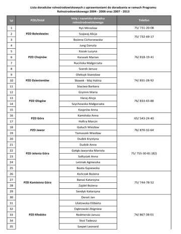 Lista doradców rolnośrodowiskowych z uprawnieniami do doradzania w ramach Programu Rolnośrodowiskowego 2004 - 2006 oraz 2007 - 2013 Lp PZD/Dział 1 2 PZD Bolesławiec Imię i nazwisko doradcy rolnośrodowiskowego Telefon Ryś Mirosław 75/ 731-20-08 Szajwaj Alicja 3 Bożena Cichorzewska 4 Jung Danuta 5 Kozak Lucyna 6 PZD Chojnów Karasek Marian 7 Rucińska Małgorzata 8 Szarek Janusz 9 Oleksyk Stanisław 10 PZD Dzierżoniów Sławek - Maj Halina 11 Staciwa Barbara 12 Grymm Maria 13 14 PZD Głogów 15 16 Szychowska Małgorzata PZD Góra Kamińska Anna PZD Jawor Gołuch Wiesław Tomaszek Wiesław 20 Dudek Krystyna 21 Dudzik Anna PZD Jelenia Góra Gołąb-Jaworska Mariola 23 Sołtysiak Anna 24 Leśniak Agnieszka 25 Beata Gąsiewska 26 Kończak Bożena 27 PZD Kamienna Góra Banaś Katarzyna 28 Zajdel Bożena 29 Sendyk Katarzyna 30 Dereń Jan 31 Ulatowska Elżbieta 32 Dąbrowski Zbigniew 33 74/ 831-28-92 76/ 833-43-88 65/ 543-24-40 Hołtra Marcin 19 22 76/ 818-19-41 Kasprów Anna 17 18 Haraj Alicja 75/ 732-69-17 PZD Kłodzko Redmerski Janusz 34 Stoś Tadeusz 35 Szepet Leonard 76/ 870-32-64 75/ 755-30-81 (82) 75/ 744-78-52 74/ 867-38-01 36 Tomkiewicz Irena 37 Demiańczuk Dorota 38 PZD Lubań Kalinowski Czesław 39 Urbanowicz Teresa 40 Baranowski Franciszek 41 42 PZD Lubin 44 Pietraszek Mirosław 46 Polesiak Teresa Larek Andrzej 48 Grajczak Zygmunt 50 PZD Milicz 51 52 Kowalczyk Norbert PZD Oleśnica Stańczyk Jerzy 54 Barabasz Zofia PZD Oława Zieliński Jerzy 57 Korobczak Piotr PZD Polkowice 59 61 62 63 PZD Strzelin PZD Środa Śląska PZD Świdnica Chacko Piotr Kuriata - Rajska Anna Krajewski Edward 150 Polak Iwona 220 Kośmider-Kmita Jolanta Kwiatkowska Aleksandra 69 Matusz-Stańczyk Danuta 70 Kamińska Jadwiga 71 73 71/ 317-29-59 Znamirowski Andrzej 67 PZD Trzebnica 71/ 392-04-56 Przytocka Weronika Barbara Kot 72 76/ 845-46-93 Pyrcz Grzegorz 66 68 71/ 313-94-81 Skut Izabela 64 65 71/ 314-93-63 Głogulska Grażyna 56 60 71/ 384-21-59 Choma Wanda Słapek Andrzej 58 75/ 78-22-136 Turowska Janina 53 55 75/ 782-21-36 Jaśkiewicz Jan 47 49 76/ 844-74-07 Arkadiusz Dulemba Zajączkowska Jadwiga PZD Lwówek Śląski 75/ 721-14-07 Charytanowicz Magdalena 43 45 75/ 722-34-61 74/852-20-21, 71/ 312-16-83 Borsuk Krzysztof PZD Wałbrzych Kusyk Agnieszka Katarzyna Hofman 74/ 842-62-72 74 75 Truś Jerzy PZD Wołów 71/ 389-11-48 Derejczyk Elżbieta Bogusiewicz Urszula 183 77 Grzyś Ewa 180 78 Kozaczuk Urszula 185 Miniewska Monika 182 Gardyna - Ciosek Marta 184 Ziobrowski Łukasz 184 79 DSPRSJiD 80 81 82 Wrocław Burblis Jan 83 Stanisław Leń 84 DE 85 86 PZD 87 88 89 PZD Ząbkowice Śląskie 90 91 Kędzierska Sylwia 161 Gajos Edyta 153 Prószyński Jerzy 241/242 Stróżyk Monika Tokarczyk Aleksandra 606 - 307 - 786 203 74/ 815-17-51 Kubińska Agnieszka PZD Zgorzelec Gazda Aneta 92 Podborączyńska Teresa 93 Galik Celina 94 216 Ziobro Dorota NZ 71/ 339 80 81(85) 71/ 339 80 21 (22) wew.: 76 PZD Złotoryja Bernasiewicz Bogusław 95 Zawada-Kobylarz Teresa 96 Kartarzyna Dorna 75/ 788-72-06 76/ 878-35-42
