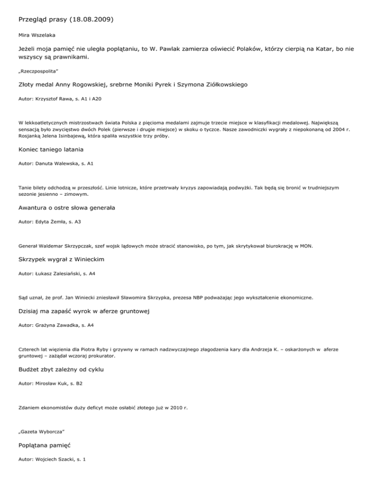 Przegląd prasy (18.08.2009) Mira Wszelaka Jeżeli moja pamięć nie uległa poplątaniu, to W. Pawlak zamierza oświecić Polaków, którzy cierpią na Katar, bo nie wszyscy są prawnikami. „Rzeczpospolita” Złoty medal Anny Rogowskiej, srebrne Moniki Pyrek i Szymona Ziółkowskiego Autor: Krzysztof Rawa, s. A1 i A20 W lekkoatletycznych mistrzostwach świata Polska z pięcioma medalami zajmuje trzecie miejsce w klasyfikacji medalowej. Największą sensacją było zwycięstwo dwóch Polek (pierwsze i drugie miejsce) w skoku o tyczce. Nasze zawodniczki wygrały z niepokonaną od 2004 r. Rosjanką Jelena Isinbajewą, która spaliła wszystkie trzy próby. Koniec taniego latania Autor: Danuta Walewska, s. A1 Tanie bilety odchodzą w przeszłość. Linie lotnicze, które przetrwały kryzys zapowiadają podwyżki. Tak będą się bronić w trudniejszym sezonie jesienno – zimowym. Awantura o ostre słowa generała Autor: Edyta Żemła, s. A3 Generał Waldemar Skrzypczak, szef wojsk lądowych może stracić stanowisko, po tym, jak skrytykował biurokrację w MON. Skrzypek wygrał z Winieckim Autor: Łukasz Zalesiański, s. A4 Sąd uznał, że prof. Jan Winiecki zniesławił Sławomira Skrzypka, prezesa NBP podważając jego wykształcenie ekonomiczne. Dzisiaj ma zapaść wyrok w aferze gruntowej Autor: Grażyna Zawadka, s. A4 Czterech lat więzienia dla Piotra Ryby i grzywny w ramach nadzwyczajnego złagodzenia kary dla Andrzeja K. – oskarżonych w aferze gruntowej – zażądał wczoraj prokurator. Budżet zbyt zależny od cyklu Autor: Mirosław Kuk, s. B2 Zdaniem ekonomistów duży deficyt może osłabić złotego już w 2010 r. „Gazeta Wyborcza” Poplątana pamięć Autor: Wojciech Szacki, s. 1 Okrutny Ukrainiec, czasem dobry Niemiec i Polacy cierpiący bardziej niż Żydzi - taki obraz wojny wyłania się z wielkiego sondażu dla Muzeum II Wojny Światowej autorstwa Pentoru. O wstydliwych wydarzeniach takich jak np. Jedwabne, zdaniem "GW" wolimy zapomnieć. O tym, że takie wydarzenia były, przekonanych jest 17 proc. Polaków. Jak premier Pawlak oświeci Polaków Autor: Adam Zadworny, s. 5 Ministerstwo Gospodarki chce rozdać gminom w całym kraju 50 tys. energooszczędnych świetlówek. Koszt akcji „Czas na oszczędzanie energii” może przekroczyć oszczędności na prądzie – szacują urzędnicy. Czy Katar zapłaci za stocznie? Autor: Mikołaj Chrzan i Konrad Niklewicz, s. 19 Nie spełniły się obietnice ministra skarbu – mimo wydłużenia terminu katarski inwestor nie przelał 381 mln zł za stocznie w Gdyni i Szczecinie. Jak Polacy postraszyli Włochów Czechami i podbili cenę za Świdnik Autor: Konrad Niklewicz, s. 20 339 mln zł – dwa razy więcej, niż planował – zapłaci włoski koncern Agusta Westland za PZL Świdnik. Opcje już nie takie straszne Autor: ToP, s. 20 Najnowsze dane KNF wskazują, że maleje problem opcji w naszej gospodarce. Ich negatywna wycena sięga już „tylko” 2,21 mld zł. Japońska gospodarka wyszła z recesji Autor: ToP, s. 20 Kolejna wielka gospodarka wydobywa się z głębokiej zapaści. W II kwartale japoński PKB urósł o 0,9 proc. po pięciu z rzędu kwartałach spadku. TVP szuka banku i kredytu Autor: Vadim Makarenko, s. 22 Telewizja publiczna chce pożyczyć 100 mln zł. Pieniędzy potrzebuje na „finansowanie bieżącej działalności”. Jednocześnie firma zwolni 500 pracowników. „Dziennik” Fiasko unijnych ambicji Autor: Rafał Woś, s. 12 Sprawująca unijną prezydencję Szwecja zamierza jesienią oficjalnie ogłosić porażkę strategii lizbońskiej. Stworzony przed dekadą sztandarowy projekt eurooptymistów zakładał, że do 2010 r. Unia stanie się najbardziej konkurencyjną potęgą gospodarczą świata. Deficyt spada, ale tylko na chwilę Autor: Adam Sofuł, s. 13 Dziura budżetowa jest mniejsza niż zakładał resort finansów i po siedmiu miesiącach wynosi 15,04 mld zł. Ekonomiści jednak ostrzegają, że druga połowa roku będzie dla finansów publicznych słaba. Szczęśliwy Polak to prawnik Autor: Magdalena Janczewska, s. 10 Bogaty jak lekarz, szczęśliwy jak prawnik i spełniony w alkowie jak górnik – do takich wniosków mozna dojść po lekturze najnowszej części Diagnozy Społecznej 2009. Jej autorzy przebadali 54 grupy zawodowe pytając je nie tylko o wiek, wykształcenie, zarobki czy stan cywilny. Interesowało ich także, czy ankietowani są religijni, szczęśliwi, zadowoleni z pracy, mają nałogi, a nawet, czy zdarzają im się myśli samobójcze. „Polska” Burza w armii Autor: Mariusz Staniszewski, s. 1 W Afganistanie żołnierzom brakuje nie tylko broni, ale też jedzenia – ujawnia żona poległego oficera. Jakubas oskarża śląski samorząd Autor: Michał Wroński, s. 1 i 3 Jeden z najbogatszych Polaków Zbigniew Jakubas twierdzi, że jego firma nie mogła wystartować w przetargu na pociągi, bo ustawiono go tak, aby kontrakt zgarnęła konkurencja. Ostatecznie wygrała go bydgoska Pesa. Dla śląskich kolei zakup ośmiu szybkich nowoczesnych pociągów miał być kontraktem dziesięciolecia. Tymczasem w Krakowie ten sam pociąg będzie o 5 mln zł tańszy. „Gazeta Prawna” Zbyt silny złoty zdławi wzrost PKB Autor: Marek Chądzyński, s. A2 Złoty będzie zyskiwał w kolejnych miesiącach, choć rynek będzie przechodził huśtawkę nastrojów. Zbyt duże umocnienie naszej waluty może jednak zaszkodzić wzrostowi PKB. Zdaniem ekonomistów optymalny kurs złotego do euro to około 4 zł. W TP rozmowy ze stacjonarnych na komórki będą tańsze Autor: Michał Fura, s. A4 Od listopada klienci TP będą płacić mniej za rozmowy z telefonów stacjonarnych na komórkowe. Ujednolicone zostaną też stawki dla osób prywatnych i firm. „Puls Biznesu” Boks za pieniądze z piramidy Autor: Dawid Tokarz, s. 4 Klienci spółki Digit Serve, założonej przez Bogusława Bagsika, byłego szefa Art. – B finansowali największą galę boksu w Polsce z 2007 r. Resort skarbu będ