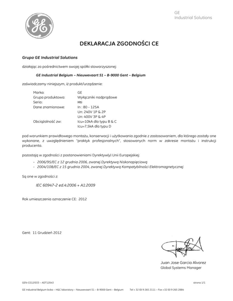 GE Industrial Solutions DEKLARACJA ZGODNOŚCI CE Grupa GE Industrial Solutions działając za pośrednictwem swojej spółki stowarzyszonej: GE Industrial Belgium – Nieuwevaart 51 – B-9000 Gent – Belgium zaświadczamy niniejszym, iż produkt/urządzenie: Marka: Grupa produktowa: Seria: Dane znamionowe: Obciążalność zw: GE Wyłączniki nadprądowe Hti In : 80 - 125A Un: 240V 1P & 2P Un: 400V 3P & 4P Icu=10kA dla typu B & C Icu=7,5kA dla typu D pod warunkiem prawidłowego montażu, konserwacji i użytkowania zgodnie z zastosowaniem, dla którego zostały one wykonane, z uwzględnieniem “praktyk profesjonalnych”, stosowanych norm w zakresie montażu i instrukcji producenta. pozostają w zgodności z postanowieniami Dyrektyw(y) Unii Europejskiej: - 2006/95/EC z 12 grudnia 2006, zwanej Dyrektywą Niskonapięciową - 2004/108/EC z 15 grudnia 2004, zwanej Dyrektywą Kompatybilności Elektromagnetycznej Są one w zgodności z: IEC 60947-2 ed.4:2006 + A1:2009 Rok umieszczenia oznaczenie CE: 2012 Gent: 11 Grudzień 2012 Juan Jose Garcia Alvarez Global Systems Manager GEN-CE12/033 – ADT12043 GE Industrial Belgium bvba – H&C laboratory – Nieuwevaart 51 – B-9000 Gent – Belgium strona 1/1 Tel + 32 (0) 9 265 2111 – Fax +32 (0) 9 265 2884