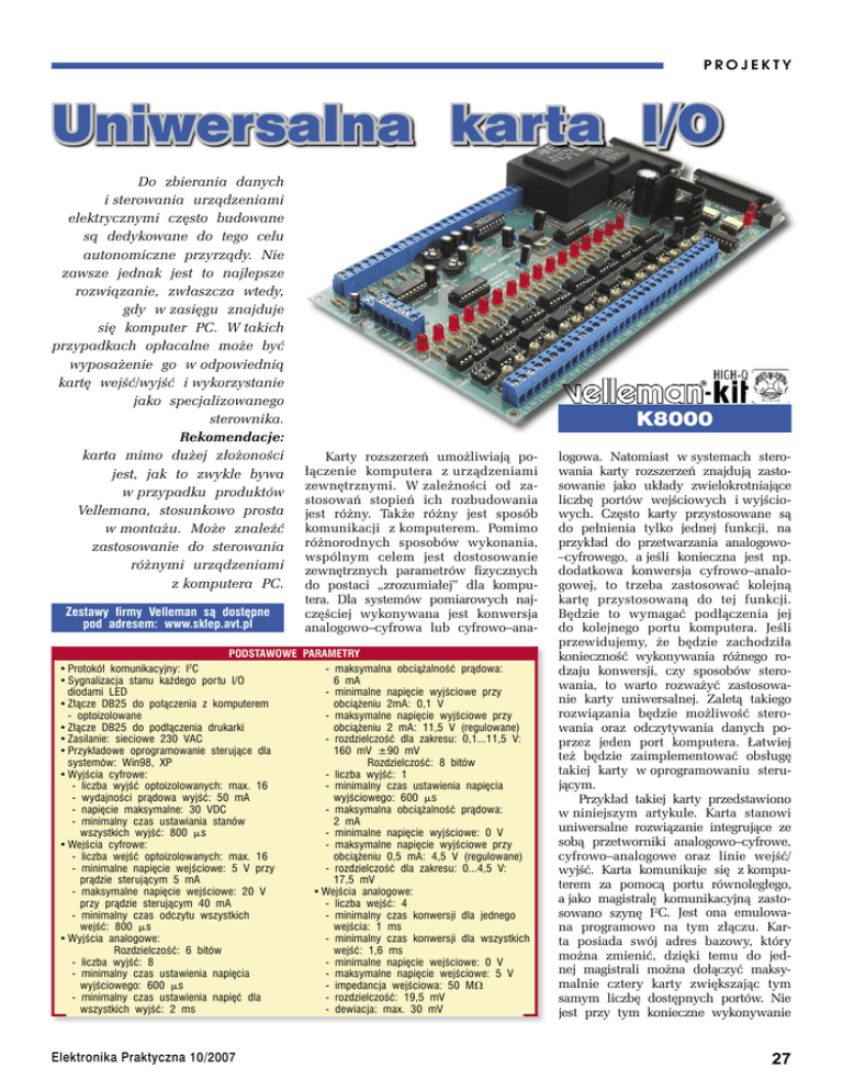 Uniwersalna P R karta O J E KI/O TY Uniwersalna karta I/O Do zbierania danych i sterowania urządzeniami elektrycznymi często budowane są dedykowane do tego celu autonomiczne przyrządy. Nie zawsze jednak jest to najlepsze rozwiązanie, zwłaszcza wtedy, gdy w zasięgu znajduje się komputer PC. W takich przypadkach opłacalne może być wyposażenie go w odpowiednią kartę wejść/wyjść i wykorzystanie jako specjalizowanego sterownika. Rekomendacje: karta mimo dużej złożoności jest, jak to zwykle bywa w przypadku produktów Vellemana, stosunkowo prosta w montażu. Może znaleźć zastosowanie do sterowania różnymi urządzeniami z komputera PC. Zestawy firmy Velleman są dostępne pod adresem: www.sklep.avt.pl K8000 Karty rozszerzeń umożliwiają połączenie komputera z urządzeniami zewnętrznymi. W zależności od zastosowań stopień ich rozbudowania jest różny. Także różny jest sposób komunikacji z komputerem. Pomimo różnorodnych sposobów wykonania, wspólnym celem jest dostosowanie zewnętrznych parametrów fizycznych do postaci „zrozumiałej” dla komputera. Dla systemów pomiarowych najczęściej wykonywana jest konwersja analogowo–cyfrowa lub cyfrowo–ana- PODSTAWOWE PARAMETRY • Protokół komunikacyjny: I2C - maksymalna obciążalność prądowa: • Sygnalizacja stanu każdego portu I/O 6 mA diodami LED - minimalne napięcie wyjściowe przy • Złącze DB25 do połączenia z komputerem obciążeniu 2mA: 0,1 V - optoizolowane - maksymalne napięcie wyjściowe przy • Złącze DB25 do podłączenia drukarki obciążeniu 2 mA: 11,5 V (regulowane) • Zasilanie: sieciowe 230 VAC - rozdzielczość dla zakresu: 0,1...11,5 V: • Przykładowe oprogramowanie sterujące dla 160 mV ±90 mV systemów: Win98, XP Rozdzielczość: 8 bitów • Wyjścia cyfrowe: - liczba wyjść: 1 - liczba wyjść optoizolowanych: max. 16 - minimalny czas ustawienia napięcia - wydajności prądowa wyjść: 50 mA wyjściowego: 600 ms - napięcie maksymalne: 30 VDC - maksymalna obciążalność prądowa: - minimalny czas ustawiania stanów 2 mA wszystkich wyjść: 800 ms - minimalne napięcie wyjściowe: 0 V • Wejścia cyfrowe: - maksymalne napięcie wyjściowe przy - liczba wejść optoizolowanych: max. 16 obciążeniu 0,5 mA: 4,5 V (regulowane) - minimalne napięcie wejściowe: 5 V przy - rozdzielczość dla zakresu: 0...4,5 V: prądzie sterującym 5 mA 17,5 mV - maksymalne napięcie wejściowe: 20 V • Wejścia analogowe: przy prądzie sterującym 40 mA - liczba wejść: 4 - minimalny czas odczytu wszystkich - minimalny czas konwersji dla jednego wejść: 800 ms wejścia: 1 ms • Wyjścia analogowe: - minimalny czas konwersji dla wszystkich Rozdzielczość: 6 bitów wejść: 1,6 ms - liczba wyjść: 8 - minimalne napięcie wejściowe: 0 V - minimalny czas ustawienia napięcia - maksymalne napięcie wejściowe: 5 V wyjściowego: 600 ms - impedancja wejściowa: 50 MV - minimalny czas ustawienia napięć dla - rozdzielczość: 19,5 mV wszystkich wyjść: 2 ms - dewiacja: max. 30 mV Elektronika Praktyczna 10/2007 logowa. Natomiast w systemach sterowania karty rozszerzeń znajdują zastosowanie jako układy zwielokrotniające liczbę portów wejściowych i wyjściowych. Często karty przystosowane są do pełnienia tylko jednej funkcji, na przykład do przetwarzania analogowo–cyfrowego, a jeśli konieczna jest np. dodatkowa konwersja cyfrowo–analogowej, to trzeba zastosować kolejną kartę przystosowaną do tej funkcji. Będzie to wymagać podłączenia jej do kolejnego portu komputera. Jeśli przewidujemy, że będzie zachodziła konieczność wykonywania różnego rodzaju konwersji, czy sposobów sterowania, to warto rozważyć zastosowanie karty uniwersalnej. Zaletą takiego rozwiązania będzie możliwość sterowania oraz odczytywania danych poprzez jeden port komputera. Łatwiej też będzie zaimplementować obsługę takiej karty w oprogramowaniu sterującym. Przykład takiej karty przedstawiono w niniejszym artykule. Karta stanowi uniwersalne rozwiązanie integrujące ze sobą przetworniki analogowo–cyfrowe, cyfrowo–analogowe oraz linie wejść/ wyjść. Karta komunikuje się z komputerem za pomocą portu równoległego, a jako magistralę komunikacyjną zastosowano szynę I2C. Jest ona emulowana programowo na tym złączu. Karta posiada swój adres bazowy, który można zmienić, dzięki temu do jednej magistrali można dołączyć maksymalnie cztery karty zwiększając tym samym liczbę dostępnych portów. Nie jest przy tym konieczne wykonywanie 27 Uniwersalna karta I/O Rys. 1. Schemat blokowy karty rozszerzeń dodatkowych połączeń z komputerem, gdyż na karcie znajduje się złącze do podłączenia kolejnych kart. Schemat blokowy karty jest przedstawiony na rys. 1. W jej skład wchodzi: 8 kanałów przetworników C/A o rozdzielczości 6 bitów i maksymalnym napięciu wyjściowym 11,5 V, jeden przetwornik C/A o rozdzielczości 8 bitów i maksymalnym napięciu wyjściowym 4,5 V, 4 wejścia analogowe o rozdzielczości 8 bitów, 16 wejść/wyjść cyfrowych. Podczas konstruowania karty szczególny nacisk położono na zabezpieczenie obwodów komputera przed uszkodzeniem, dlatego interfejs komunikacyjny został odizolowany elektrycznie poprzez zastosowanie transoptorów. W transoptor izolujący wyposażono również każdą z linii wejścia/wyjścia. Do karty dołączone jest przykładowe oprogramowanie wykorzystywane do jej obsługi oraz pliki źródłowe umożliwiające wykonanie modyfikacji oprogramowania według własnych potrzeb. Budowa Schemat elektryczny karty jest przedstawiony na rys. 2. Można w nim wyróżnić kilka bloków funkcjonalnych. Pierwszym z nich jest obwód interfejsu pomiędzy kartą a kom- 28 puterem. Komunikacja odbywa się za pomocą szyny I 2C, dlatego do połączenia karty z komputerem wymagane jest dołączenie tylko linii danych i linii zegarowej. Z uwagi na duży nacisk na zabezpieczenie komputera przed uszkodzeniem portu, li