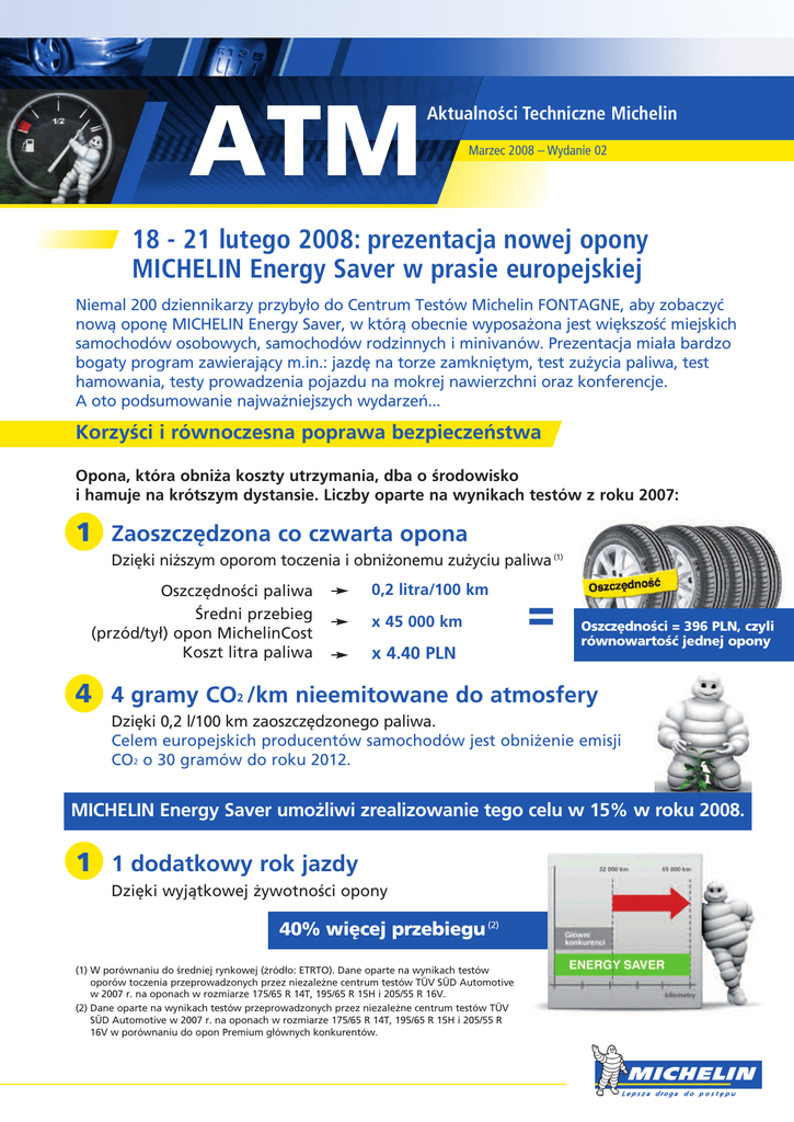 ATM Aktualności Techniczne Michelin Marzec 2008 – Wydanie 02 18 - 21 lutego 2008: prezentacja nowej opony MICHELIN Energy Saver w prasie europejskiej Niemal 200 dziennikarzy przybyło do Centrum Testów Michelin FONTAGNE, aby zobaczyć nową oponę MICHELIN Energy Saver, w którą obecnie wyposażona jest większość miejskich samochodów osobowych, samochodów rodzinnych i minivanów. Prezentacja miała bardzo bogaty program zawierający m.in.: jazdę na torze zamkniętym, test zużycia paliwa, test hamowania, testy prowadzenia pojazdu na mokrej nawierzchni oraz konferencje. A oto podsumowanie najważniejszych wydarzeń... Korzyści i równoczesna poprawa bezpieczeństwa Opona, która obniża koszty utrzymania, dba o środowisko i hamuje na krótszym dystansie. Liczby oparte na wynikach testów z roku 2007: 1 Zaoszczędzona co czwarta opona Dzięki niższym oporom toczenia i obniżonemu zużyciu paliwa (1) Oszczędności paliwa Średni przebieg (przód/tył) opon MichelinCost Koszt litra paliwa 0,2 litra/100 km x 45 000 km x 4.40 PLN = Oszczędności = 396 PLN, czyli równowartość jednej opony 4 4 gramy CO2 /km nieemitowane do atmosfery Dzięki 0,2 l/100 km zaoszczędzonego paliwa. Celem europejskich producentów samochodów jest obniżenie emisji CO2 o 30 gramów do roku 2012. MICHELIN Energy Saver umożliwi zrealizowanie tego celu w 15% w roku 2008. 1 1 dodatkowy rok jazdy Dzięki wyjątkowej żywotności opony 40% więcej przebiegu (2) (1) W porównaniu do średniej rynkowej (żródło: ETRTO). Dane oparte na wynikach testów oporów toczenia przeprowadzonych przez niezależne centrum testów TÜV SÜD Automotive w 2007 r. na oponach w rozmiarze 175/65 R 14T, 195/65 R 15H i 205/55 R 16V. (2) Dane oparte na wynikach testów przeprowadzonych przez niezależne centrum testów TÜV SÜD Automotive w 2007 r. na oponach w rozmiarze 175/65 R 14T, 195/65 R 15H i 205/55 R 16V w porównaniu do opon Premium głównych konkurentów. Testy hamowania Po raz pierwszy uczestnicy prezentacji mogli sami przetestować osiągi opony podczas hamowania na mokrej nawierzchni. W tym celu dostarczono kilka FIATÓW 500 (zdobywcę tytułu samochodu roku), z których jeden wyposażony był w opony MICHELIN Energy Saver 175/65 R 14T, a pozostałe w opony trzech głównych europejskich konkurentów. Rezultaty 513 hamowań od 70 do 0 km/h wykonane w ciągu czterech dni mówią same za siebie: Średnie wartości z 4 dni Konkurenci PREMIUM 26,67 m 24,20 m MICHELIN Energy Saver hamuje krócej o: 2,47 m Każdego dnia dziennikarze mogli wziąć udział w testach zużycia paliwa, które przeprowadzano na dwóch identycznych MERCEDESACH 180 Klasy C, jednym wyposażonym w opony MICHELIN Energy Saver 195/60 R 16V MO, a drugim w opony Premium 195/60 R 16V MO konkurencyjnej firmy, zakupionymi na rynku. Aby zapewnić bezstronność wyników, wszelkie przygotowania, kontrolę techniczną obu samochodów, przebieg testów oraz odczyty wyników zużycia paliwa przeprowadzano w obecności prawnika pełniącego rolę niezależnego sędziego. Oto podsumowanie 4 dni testów. Wyniki mówią same za siebie: Opona konkurencji Dystans Zużycie paliwa Zużycie na 100 km 408 km 29,951 litrów 408 km 28,282 litrów 7,34 l/100 km 6,93 l/100 km Oszczędności z MICHELIN Energy Saver: 0,41 l/100 km Data ważności: Marzec 2008 – wydanie 2 - R.C.S 352 321 285 - Photo credits : Michelin MFP Test zużycia paliwa