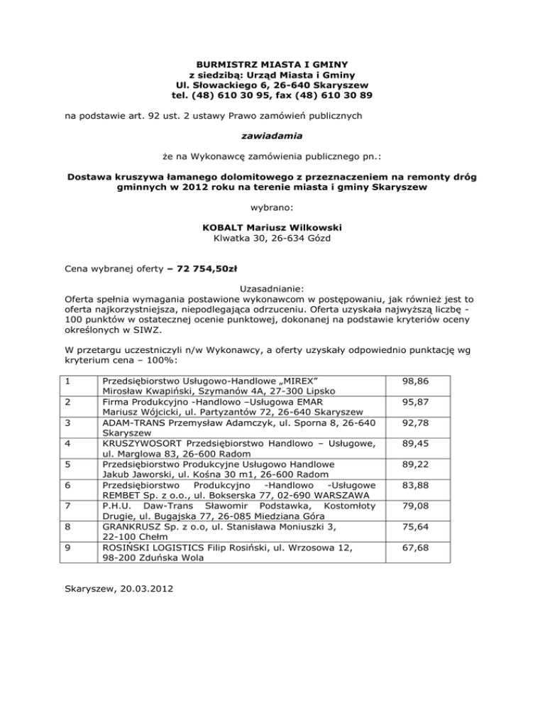 BURMISTRZ MIASTA I GMINY z siedzibą: Urząd Miasta i Gminy Ul. Słowackiego 6, 26-640 Skaryszew tel. (48) 610 30 95, fax (48) 610 30 89 na podstawie art. 92 ust. 2 ustawy Prawo zamówień publicznych zawiadamia że na Wykonawcę zamówienia publicznego pn.: Dostawa kruszywa łamanego dolomitowego z przeznaczeniem na remonty dróg gminnych w 2012 roku na terenie miasta i gminy Skaryszew wybrano: KOBALT Mariusz Wilkowski Klwatka 30, 26-634 Gózd Cena wybranej oferty – 72 754,50zł Uzasadnianie: Oferta spełnia wymagania postawione wykonawcom w postępowaniu, jak również jest to oferta najkorzystniejsza, niepodlegająca odrzuceniu. Oferta uzyskała najwyższą liczbę 100 punktów w ostatecznej ocenie punktowej, dokonanej na podstawie kryteriów oceny określonych w SIWZ. W przetargu uczestniczyli n/w Wykonawcy, a oferty uzyskały odpowiednio punktację wg kryterium cena – 100%: 1 2 3 4 5 6 7 8 9 Przedsiębiorstwo Usługowo-Handlowe „MIREX” Mirosław Kwapiński, Szymanów 4A, 27-300 Lipsko Firma Produkcyjno -Handlowo –Usługowa EMAR Mariusz Wójcicki, ul. Partyzantów 72, 26-640 Skaryszew ADAM-TRANS Przemysław Adamczyk, ul. Sporna 8, 26-640 Skaryszew KRUSZYWOSORT Przedsiębiorstwo Handlowo – Usługowe, ul. Marglowa 83, 26-600 Radom Przedsiębiorstwo Produkcyjne Usługowo Handlowe Jakub Jaworski, ul. Kośna 30 m1, 26-600 Radom Przedsiębiorstwo Produkcyjno -Handlowo -Usługowe REMBET Sp. z o.o., ul. Bokserska 77, 02-690 WARSZAWA P.H.U. Daw-Trans Sławomir Podstawka, Kostomłoty Drugie, ul. Bugajska 77, 26-085 Miedziana Góra GRANKRUSZ Sp. z o.o, ul. Stanisława Moniuszki 3, 22-100 Chełm ROSIŃSKI LOGISTICS Filip Rosiński, ul. Wrzosowa 12, 98-200 Zduńska Wola Skaryszew, 20.03.2012 98,86 95,87 92,78 89,45 89,22 83,88 79,08 75,64 67,68