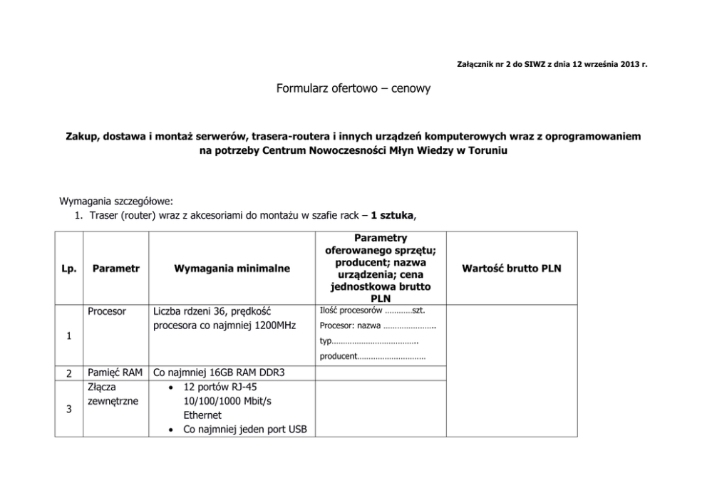 Załącznik nr 2 do SIWZ z dnia 12 września 2013 r. Formularz ofertowo – cenowy Zakup, dostawa i montaż serwerów, trasera-routera i innych urządzeń komputerowych wraz z oprogramowaniem na potrzeby Centrum Nowoczesności Młyn Wiedzy w Toruniu Wymagania szczegółowe: 1. Traser (router) wraz z akcesoriami do montażu w szafie rack – 1 sztuka, Lp. Parametr Procesor 1 Wymagania minimalne Liczba rdzeni 36, prędkość procesora co najmniej 1200MHz Parametry oferowanego sprzętu; producent; nazwa urządzenia; cena jednostkowa brutto PLN Ilość procesorów …………szt. Procesor: nazwa ………………….. typ……………………………….. producent………………………… 2 3 Pamięć RAM Złącza zewnętrzne Co najmniej 16GB RAM DDR3 12 portów RJ-45 10/100/1000 Mbit/s Ethernet Co najmniej jeden port USB Wartość brutto PLN 4 Architektura Obudowa 5 Dodatkowe opcje 6 System operacyjny 7 Certyfikaty i standardy 8 9 Gwarancja 4 porty SFP 1.25G (MiniGBIC) Tile GX obudowa przystosowana do montażu w szafie rack 19” (wysokość 1U-2U) Kontrola napięcia i temperatury Filtrowanie pakietów, konwersja adresów Monitor napięcia Monitor temperatury CPU Monitor temperatury PCB Zainstalowany system operacyjny RouterOS v6 (64bit) Nośnik z oprogramowaniem i sterownikami Certyfikat ISO9001 dla producenta sprzętu (załączyć dokument potwierdzający spełnianie wymogu) Deklaracja zgodności CE (załączyć dokument potwierdzający spełnianie wymogu) Wymagana jest 3-letnia gwarancja producenta świadczona na miejscu u klienta Czas reakcji serwisu – do końca następnego dnia roboczego Serwis urządzeń musi być realizowany przez Producenta lub Autoryzowanego Partnera Serwisowego Producenta. Firma serwisująca musi posiadać ISO9001 na świadczenie usług serwisowych oraz posiadać autoryzację producenta komputera (załączyć dokument potwierdzający spełnianie wymogu) 2. Konwerter SFP na RJ45 1000Mbps - 13 sztuk. Parametry oferowanego sprzętu: producent: nazwa urządzenia: cena jednostkowa brutto PLN: wartość brutto PLN: 3. Szafa rack – 1 sztuka, Lp. 1 Parametr Rodzaj Rozmiary 2 Drzwi 3 Osłony 4 Cokół 5 6 7 Kolor Dodatkowe opcje Wymagania minimalne 19” stojąca, spawana, 3 pary belek nośnych w rozstawie 19” Wysokość jednostkowa 47U Szerokość 800mm Głębokość 1000mm Drzwi przednie i tylne z perforacją 80%, wyposażone w zamki trzypunktowe z uchwytem wychylnym Dwie osłony boczne z perforacją 30%, dach z otworami pod zaślepki Szkielet na cokole z wysuwaną ramą wsporczą o wysokości 200mm Ciemny kolor Listwy i linki uziemienia Parametry oferowanego sprzętu; producent; nazwa urządzenia; cena jednostkowa brutto PLN Wartość brutto PLN 4. Zarządzalna listwa zasilająca do szaf serwerowych wraz z akcesoriami do montażu w szafie rack – 1 sztuka, Lp. 1 Parametr Wymagania minimalne Ilość gniazd 8 sterowanych gniazd zasilających, IEC 230V, 8A obciążalność prądowa 16A, max obciążenie gniazda 8A Interfejs Ethernet, SNMP, interfejs oparty na technologii AJAX, panel zarządzania dostosowany do urządzeń mobilnych, export/import danych w formacie XML, współpraca z kamerami IP, diody wskazujące stan wyjść 230V, sterowanie wyjściami za pomocą progów i parametrów, kontrola zaniku napięcia zasilania 230V 90V-240V Wejście 1-wire RJ-12 dla czujników temperatury Obciążenie Interfejs i diody 2 3 4 Zasilanie Złącza Parametry oferowanego sprzętu; producent; nazwa urządzenia; cena jednostkowa brutto PLN Wartość brutto PLN Obudowa 5 Inne opcje 6 Obudowa przystosowana do montażu w szafie rack 19” (wysokość 1U-2U) Pomiar mocy całkowitej programami alarmowymi/sterującymi, RTC - zegar czasu rzeczywistego z podtrzymaniem bateryjnym Oddzielne zasilanie warstwy sterowania, zapamiętywanie ustawień w przypadku utraty zasilania Programowalne temperaturowe progi sterowania, 2 wejścia NO/NC z zasilaniem 12V do czujników, funkcja resetera, watchdog sprzętowy 5. Zasilacz UPS wraz z akcesoriami do montażu w szafie rack – 1 sztuka, Lp. Parametr Akumulatory 1 2 Prąd wejściowy Prąd wyjściowy 3 Wyjście 4 Wymagania minimalne Akumulatory hot-swap: 8 akumulatorów po 48Vdc, szczelne kwasowo-ołowiowe, bezobsługowe, czas ładowania 2-4 godzin do 90% 220 /230 / 240Vac ±32%, częstotliwość 50 / 60Hz ±5% (automatycznie wykrywana) pomniejszające 10% ( wejście -9 ~ -20%), podwyższające 10%( wejście +9 ~ +20%), podwójna korekcja napięcia 2xAVR, nieprawidłowe wahania napięcia sieci bez korzystania z baterii w szerokim zakresie +/- 25%, moc pozorna 3000W, moc czynna 2700W Inverter 220 /230 / 240Vac ±3%, częstotliwość 50Hz/60Hz ±0.2%, THD Parametry oferowanego sprzętu; producent; nazwa urządzenia; cena jednostkowa brutto PLN Wartość brutto PLN 5 6 7 3%, moc (VA/W) 3000/1800, czas przełączenia 6ms, czas podtrzymania przy P=max >8min Czysta sinusoida na wyjściu zasilacza nawet przy pracy z baterii podczas zaniku napięcia sieciowego Porty Porty komunikacji USB, pełny RS 232, SNMP, topologia Lineinteractive, technologia z Toroidalnym Transformatorem Inne Zimny start (możliwość włączenia bez napięcia sieciowego), autotestujący, wyświetlacz LCD (obciążenie (%), poziom baterii (%), Bypass, AVR-Boost i AVR Buck, baterie słabe i do wymiany/awaria, UPS zepsuty), diody LED (stan włączony, praca z baterii, awaria UPS-a i stan baterii) Zabezpieczenie Zabezpieczenia: przeciążenie: tryb AC - > 110% Sygnalizacja Buzzer i po 10min zamyka system; tryb inwerter - > 100% Sygnalizacja Buzzer i po 10 sek. zamyka Obudowa 8 system, przeciwprzepięciowe: tryb AC - bezpiecznik na wejściu i elektroniczna kontrola; tryb inwerter - elektroniczna kontrola Obudowa przystosowana do montażu w szafie rack 19” (wysokość 1U-4U) 6. Serwer dwuprocesorowy, 32 rdzeniowy wraz z szynami i akcesoriami do montażu w szafie rack – 4 sztuki, Lp. Parametr Procesor 1 Pamięć RAM 2 3 Macierz Wymagania minimalne Co najmniej dwa procesory 1
