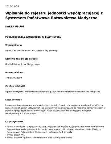 2016-11-08 Wpisanie do rejestru jednostki współpracującej z Systemem Państwowe Ratownictwa Medyczne KARTA USŁUG PODLASKI URZĄD WOJEWÓDZKI W BIAŁYMSTOKU Wydział/Biuro: Wydział Bezpieczeństwa i Zarządzania Kryzysowego Komórka realizująca usługę: Oddział Ratownictwa Medycznego Numer telefonu: +48 857439250 Co chcę załatwić? Wpisać do rejestru jednostkę współpracującą z Systemem Państwowe Ratownictwa Medyczne. Kogo dotyczy? Jednostkami współpracującymi z systemem mogą być społeczne organizacje ratownicze które, w ramach swoich zadań ustawowych lub statutowych, są obowiązane do niesienia pomocy osobom w stanie nagłego zagrożenia zdrowotnego, jeżeli zostaną wpisane do rejestru jednostek współpracujących z systemem. Co przygotować? ● ● ● formularz wniosku o wpisanie do rejestru jednostek współpracujących z Systemem Państwowe Ratownictwa Medyczne oraz informacje zawarte w art. 17 ustawy z dnia 8 września 2006 r. o Państwowym Ratownictwie Medycznym - załącznik Nr 1 do karty wykaz pojazdów , wykaz środków łączności (ile telefonów oraz numery telefonów) ● ● czas w jak ma jednostka osiągnie gotowość do współpracy, listę osób z informację odnośnie daty ważności kursu oraz wykaz ratowników Jakie dokumenty muszę wypełnić? Wypełnij formularz wniosku o wpisanie do rejestru jednostek współpracujących z Systemem Państwowe Ratownictwa Medyczne , który znajdziesz w załączniku nr 1. Jak wypełnić dokumenty? Druk wniosku powinien być wypełniony czytelnie. Wniosek można wypełnić komputerowo, maszynowo lub odręcznie Ile muszę zapłacić? Za złożenie wniosku nic nie płacisz Kiedy złożyć dokumenty? Po podjęciu decyzji o chęci współpracy z systemem Państwowe Ratownictwo Medyczne Gdzie załatwię sprawę? ● ● ● ● Dokumety możesz wysłać do nas pocztą na adres : Podlaski Urząd Wojewódzki ul. Mickiewicza 3 15-213 Białystok Możesz też złożyć dokumenty osobiście w Kancelarii Ogólnej Urzędu – pokój nr 6 (parter) lub w Oddziale Ratownictwa Medycznego Wydziału Bezpieczeństwa i Zarządzania kryzysowego , pok. Nr 15, tel. +48 857439450 Jeżeli będziesz miał problem z wypełnieniem wniosku zadzwoń do Wydziału Bezpieczeństwa i Zarządzania Kryzysowego Podlaskiego Urzędu Wojewódzkiego – tel. +48 857439250 lub wyślij zapytanie mailem na adres: mailto : [email protected] Co zrobi urząd? Sprawdzimy czy wypełniłeś prawidłowo wniosek. Możemy też zwrócić się o uzupełnienie dokumentów lub dodatkowe informacje. Po stwierdzeniu prawidłowości złożonych informacji zostanie wydana decyzja o wpisaniu do rejestru jednostek współpracujących z Systemem Państwowe Ratownictwa Medyczne Jaki jest czas realizacji? 30 dni od daty złożenia wniosku. Jak się odwołać? Od decyzji służy odwołanie składane do Ministra Zdrowia za pośrednictwem Wojewody w terminie 14 dni od otrzymania decyzji. Informacje dodatkowe: Wniosek powinien zawierać wykaz posiadanego sprzętu medycznego; informację na temat pojazdów, łączności (ile telefonów oraz numery telefonów) czas w jaki m jednostka osiągnie gotowość do współpracy, informację odnośnie daty ważności kursu oraz wykaz ratowników. Podstawa prawna: Ustawa z dnia 8 września 2006 r. o Państwowym Ratownictwie Medycznym Załączniki do karty: Załącznik nr 1- wniosek o wpisanie do rejestru jednostek współpracujących z systemem PRM Kartę opracował: Irena Frąckiel Kartę zatwierdził: Bogusław Maksim – Dyrektor Wydziału Bezpieczeństwa i Zarządzania Kryzysowego Karta obowiązuje od: 01 stycznia 2017 r.