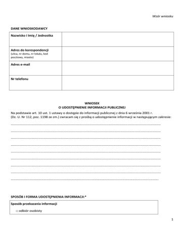 Wzór wniosku DANE WNIOSKODAWCY Nazwisko i Imię / Jednostka Adres do korespondencji (ulica, nr domu, nr lokalu, kod pocztowy, miasto) Adres e-mail Nr telefonu WNIOSEK O UDOSTĘPNIENIE INFORMACJI PUBLICZNEJ Na podstawie art. 10 ust. 1 ustawy o dostępie do informacji publicznej z dnia 6 września 2001 r. (Dz. U. Nr 112, poz. 1198 ze zm.) zwracam się z prośbą o udostępnienie informacji w następującym zakresie: .................................................................................................................................................................. .................................................................................................................................................................. .................................................................................................................................................................. .................................................................................................................................................................. .................................................................................................................................................................. .................................................................................................................................................................. .................................................................................................................................................................. .................................................................................................................................................................. …………………………………………………………………………………………………………………………………………………………. SPOSÓB I FORMA UDOSTĘPNIENIA INFORMACJI:* Sposób przekazania informacji □ odbiór osobisty 1 □ przesłać pocztą pod adres □ przesłać środkami komunikacji elektronicznej pod adres Sposób przygotowania informacji (nie dotyczy komunikacji elektronicznej) □ kopia na papierze □ płyta DVD □ płyta CD □ inny nośnik (podać jaki) Forma przekazania informacji □ tekst □ obraz/grafika □ dźwięk (nie dotyczy wydruku) □ audiowizualna (nie dotyczy wydruku) Wyrażam zgodę na przetwarzanie moich danych osobowych zgodnie z ustawą o ochronie danych osobowych z dnia 29.08.1977 r. (Dz. U. z 1997r.,Nr 133 poz. 883 z późn. zm.) ..................................................... Miejscowość, data ........................................................ podpis wnioskodawcy Uwagi: * proszę zakreślić właściwe pole krzyżykiem Urząd zastrzega sobie prawo pobrania opłaty od informacji udostępnionych zgodnie z art. 15 ust. 1 ustawy o dostępie do informacji publicznej o ile miałby ponieść dodatkowe koszty związane ze wskazanym we wniosku sposobem udostępniania lub koniecznością przekształcenia informacji w formę wskazaną we wniosku. O wysokości opłaty wnioskodawca zostanie powiadomiony w terminie 14 dni od dnia złożenia wniosku (stosownie do art. 15, ust. 2 ustawy). 2