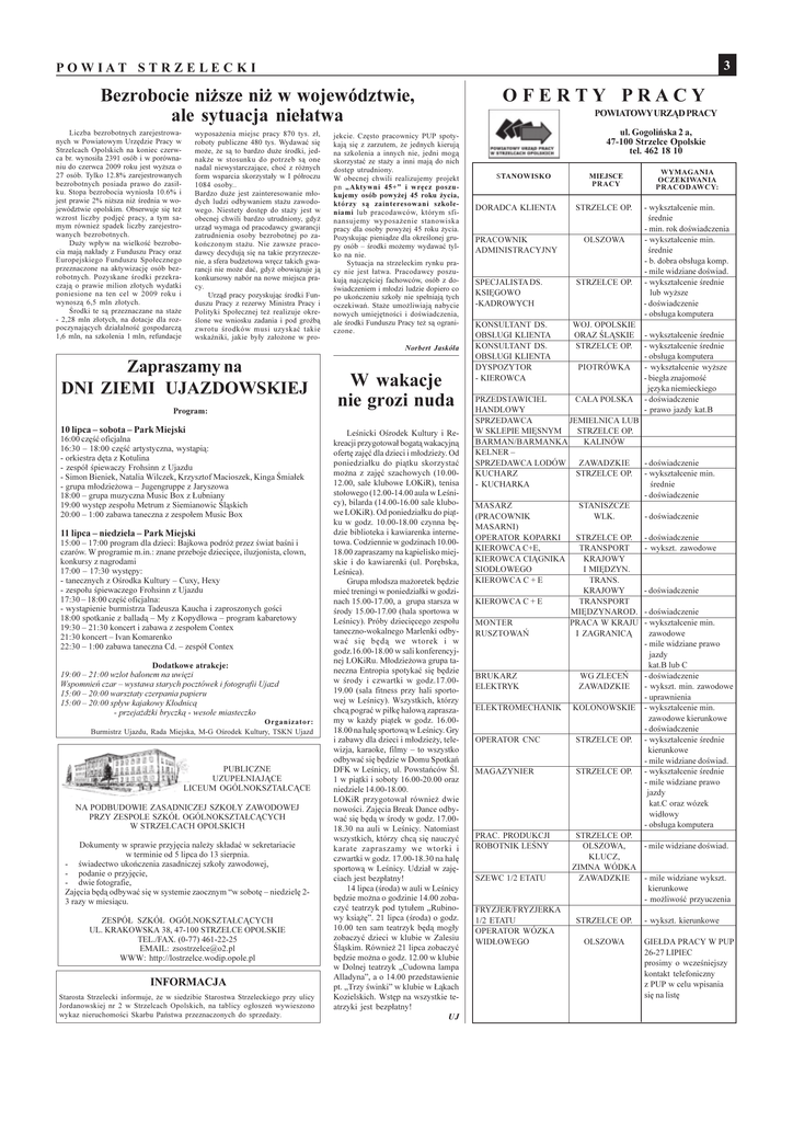 3 POWIAT STR Z E LE C K I Bezrobocie ni¿sze ni¿ w województwie, ale sytuacja nie³atwa Liczba bezrobotnych zarejestrowanych w Powiatowym Urzêdzie Pracy w Strzelcach Opolskich na koniec czerwca br. wynosi³a 2391 osób i w porównaniu do czerwca 2009 roku jest wy¿sza o 27 osób. Tylko 12.8% zarejestrowanych bezrobotnych posiada prawo do zasi³ku. Stopa bezrobocia wynios³a 10.6% i jest prawie 2% ni¿sza ni¿ rednia w województwie opolskim. Obserwuje siê te¿ wzrost liczby podjêæ pracy, a tym samym równie¿ spadek liczby zarejestrowanych bezrobotnych. Du¿y wp³yw na wielkoæ bezrobocia maj¹ nak³ady z Funduszu Pracy oraz Europejskiego Funduszu Spo³ecznego przeznaczone na aktywizacjê osób bezrobotnych. Pozyskane rodki przekraczaj¹ o prawie milion z³otych wydatki poniesione na ten cel w 2009 roku i wynosz¹ 6,5 mln z³otych. rodki te s¹ przeznaczane na sta¿e - 2,28 mln z³otych, na dotacje dla rozpoczynaj¹cych dzia³alnoæ gospodarcz¹ 1,6 mln, na szkolenia 1 mln, refundacje wyposa¿enia miejsc pracy 870 tys. z³, roboty publiczne 480 tys. Wydawaæ siê mo¿e, ¿e s¹ to bardzo du¿e rodki, jednak¿e w stosunku do potrzeb s¹ one nadal niewystarczaj¹ce, choæ z ró¿nych form wsparcia skorzysta³y w I pó³roczu 1084 osoby.. Bardzo du¿e jest zainteresowanie m³odych ludzi odbywaniem sta¿u zawodowego. Niestety dostêp do sta¿y jest w obecnej chwili bardzo utrudniony, gdy¿ urz¹d wymaga od pracodawcy gwarancji zatrudnienia osoby bezrobotnej po zakoñczonym sta¿u. Nie zawsze pracodawcy decyduj¹ siê na takie przyrzeczenie, a sfera bud¿etowa wrêcz takich gwarancji nie mo¿e daæ, gdy¿ obowi¹zuje j¹ konkursowy nabór na nowe miejsca pracy. Urz¹d pracy pozyskuj¹c rodki Funduszu Pracy z rezerwy Ministra Pracy i Polityki Spo³ecznej te¿ realizuje okrelone we wniosku zadania i pod grob¹ zwrotu rodków musi uzyskaæ takie wskaniki, jakie by³y za³o¿one w pro- jekcie. Czêsto pracownicy PUP spotykaj¹ siê z zarzutem, ¿e jednych kieruj¹ na szkolenia a innych nie, jedni mog¹ skorzystaæ ze sta¿y a inni maj¹ do nich dostêp utrudniony. W obecnej chwili realizujemy projekt pn Aktywni 45+ i wrêcz poszukujemy osób powy¿ej 45 roku ¿ycia, którzy s¹ zainteresowani szkoleniami lub pracodawców, którym sfinansujemy wyposa¿enie stanowiska pracy dla osoby powy¿ej 45 roku ¿ycia. Pozyskuj¹c pieni¹dze dla okrelonej grupy osób rodki mo¿emy wydawaæ tylko na nie. Sytuacja na strzeleckim rynku pracy nie jest ³atwa. Pracodawcy poszukuj¹ najczêciej fachowców, osób z dowiadczeniem i m³odzi ludzie dopiero co po ukoñczeniu szko³y nie spe³niaj¹ tych oczekiwañ. Sta¿e umo¿liwiaj¹ nabycie nowych umiejêtnoci i dowiadczenia, ale rodki Funduszu Pracy te¿ s¹ ograniczone. Norbert Jaskó³a Zapraszamy na DNI ZIEMI UJAZDOWSKIEJ Program: 10 lipca sobota Park Miejski 16:00 czêæ oficjalna 16:30 18:00 czêæ artystyczna, wyst¹pi¹: - orkiestra dêta z Kotulina - zespó³ piewaczy Frohsinn z Ujazdu - Simon Bieniek, Natalia Wilczek, Krzysztof Macioszek, Kinga mia³ek - grupa m³odzie¿owa Jugengruppe z Jaryszowa 18:00 grupa muzyczna Music Box z £ubniany 19:00 wystêp zespo³u Metrum z Siemianowic l¹skich 20:00 1:00 zabawa taneczna z zespo³em Music Box 11 lipca niedziela Park Miejski 15:00 17:00 program dla dzieci: Bajkowa podró¿ przez wiat bani i czarów. W programie m.in.: znane przeboje dzieciêce, iluzjonista, clown, konkursy z nagrodami 17:00 17:30 wystêpy: - tanecznych z Orodka Kultury Cuxy, Hexy - zespo³u piewaczego Frohsinn z Ujazdu 17:30 18:00 czêæ oficjalna: - wyst¹pienie burmistrza Tadeusza Kaucha i zaproszonych goci 18:00 spotkanie z ballad¹ My z Kopyd³owa program kabaretowy 19:30 21:30 koncert i zabawa z zespo³em Contex 21:30 koncert Ivan Komarenko 22:30 1:00 zabawa taneczna Cd. zespó³ Contex Dodatkowe atrakcje: 19:00 21:00 wzlot balonem na uwiêzi Wspomnieñ czar wystawa starych pocztówek i fotografii Ujazd 15:00 20:00 warsztaty czerpania papieru 15:00 20:00 sp³yw kajakowy K³odnic¹ - przeja¿d¿ki bryczk¹ - weso³e miasteczko Organizator: Burmistrz Ujazdu, Rada Miejska, M-G Orodek Kultury, TSKN Ujazd PUBLICZNE UZUPE£NIAJ¥CE LICEUM OGÓLNOKSZTA£C¥CE NA PODBUDOWIE ZASADNICZEJ SZKO£Y ZAWODOWEJ PRZY ZESPOLE SZKÓ£ OGÓLNOKSZTA£C¥CYCH W STRZELCACH OPOLSKICH Dokumenty w sprawie przyjêcia nale¿y sk³adaæ w sekretariacie w terminie od 5 lipca do 13 sierpnia. - wiadectwo ukoñczenia zasadniczej szko³y zawodowej, - podanie o przyjêcie, - dwie fotografie, Zajêcia bêd¹ odbywaæ siê w systemie zaocznym w sobotê niedzielê 23 razy w miesi¹cu. ZESPÓ£ SZKÓ£ OGÓLNOKSZTA£C¥CYCH UL. KRAKOWSKA 38, 47-100 STRZELCE OPOLSKIE TEL./FAX. (0-77) 461-22-25 EMAIL: [email protected] WWW: http://lostrzelce.wodip.opole.pl INFORMACJA Starosta Strzelecki informuje, ¿e w siedzibie Starostwa Strzeleckiego przy ulicy Jordanowskiej nr 2 w Strzelcach Opolskich, na tablicy og³oszeñ wywieszono wykaz nieruchomoci Skarbu Pañstwa przeznaczonych do sprzeda¿y. W wakacje nie grozi nuda Lenicki Orodek Kultury i Rekreacji przygotowa³ bogat¹ wakacyjn¹ ofertê zajêæ dla dzieci i m³odzie¿y. Od poniedzia³ku do pi¹tku skorzystaæ mo¿na z zajêæ szachowych (10.0012.00, sale klubowe LOKiR), tenisa sto³owego (12.00-14.00 aula w Lenicy), bilarda (14.00-16.00 sale klubowe LOKiR). Od poniedzia³ku do pi¹tku w godz. 10.00-18.00 czynna bêdzie biblioteka i kawiarenka internetowa. Codziennie w godzinach 10.0018.00 zapraszamy na k¹pielisko miejskie i do kawiarenki (ul. Porêbska, Lenica). Grupa m³odsza ma¿oretek bêdzie mieæ treningi w poniedzia³ki w godzinach 15.00-17.00, a grupa starsza w rody 15.00-17.00 (hala sportowa w Lenicy). Próby dzieciêcego zespo³u taneczno-wokalnego Marlenki odbywaæ siê bêd¹ we wtorek i w godz.16.00-18.00 w sali konferencyjnej LOKiRu. M³odzie¿owa grupa taneczna Entropia spotykaæ siê bêdzie w rody i czwartki w godz.17.0019.00 (sala fitness przy hali sportowej w Lenicy). Wszystkich, którzy chc¹ pograæ w pi³