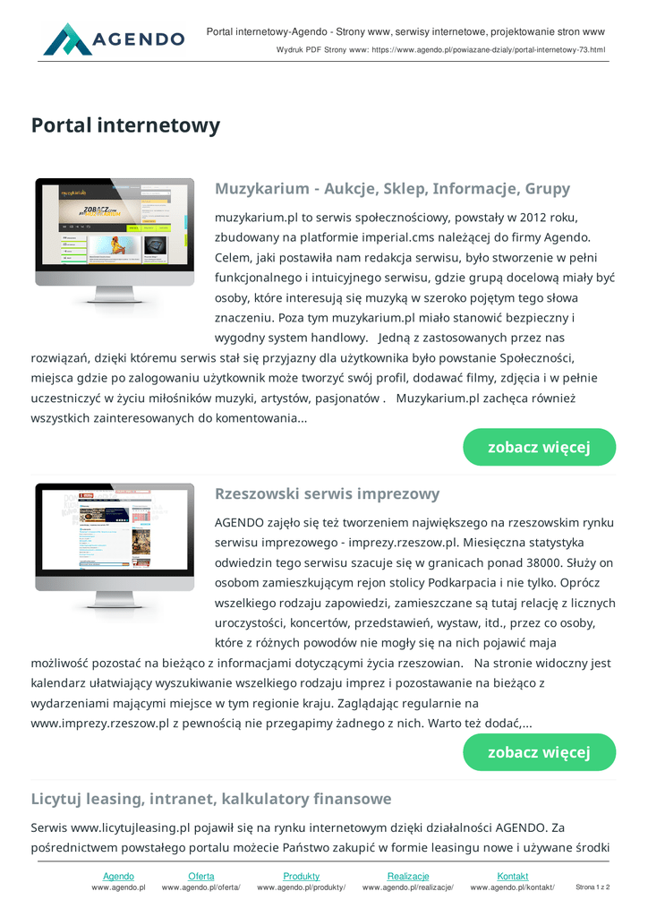 Portal internetowy-Agendo - Strony www, serwisy internetowe, projektowanie stron www Wydruk PDF Strony www: https://www.agendo.pl/powiazane-dzialy/portal-internetowy-73.html Portal internetowy Muzykarium - Aukcje, Sklep, Informacje, Grupy muzykarium.pl to serwis społecznościowy, powstały w 2012 roku, zbudowany na platformie imperial.cms należącej do firmy Agendo. Celem, jaki postawiła nam redakcja serwisu, było stworzenie w pełni funkcjonalnego i intuicyjnego serwisu, gdzie grupą docelową miały być osoby, które interesują się muzyką w szeroko pojętym tego słowa znaczeniu. Poza tym muzykarium.pl miało stanowić bezpieczny i wygodny system handlowy. Jedną z zastosowanych przez nas rozwiązań, dzięki któremu serwis stał się przyjazny dla użytkownika było powstanie Społeczności, miejsca gdzie po zalogowaniu użytkownik może tworzyć swój profil, dodawać filmy, zdjęcia i w pełnie uczestniczyć w życiu miłośników muzyki, artystów, pasjonatów . Muzykarium.pl zachęca również wszystkich zainteresowanych do komentowania... zobacz więcej Rzeszowski serwis imprezowy AGENDO zajęło się też tworzeniem największego na rzeszowskim rynku serwisu imprezowego - imprezy.rzeszow.pl. Miesięczna statystyka odwiedzin tego serwisu szacuje się w granicach ponad 38000. Służy on osobom zamieszkującym rejon stolicy Podkarpacia i nie tylko. Oprócz wszelkiego rodzaju zapowiedzi, zamieszczane są tutaj relację z licznych uroczystości, koncertów, przedstawień, wystaw, itd., przez co osoby, które z różnych powodów nie mogły się na nich pojawić maja możliwość pozostać na bieżąco z informacjami dotyczącymi życia rzeszowian. Na stronie widoczny jest kalendarz ułatwiający wyszukiwanie wszelkiego rodzaju imprez i pozostawanie na bieżąco z wydarzeniami mającymi miejsce w tym regionie kraju. Zaglądając regularnie na www.imprezy.rzeszow.pl z pewnością nie przegapimy żadnego z nich. Warto też dodać,... zobacz więcej Licytuj leasing, intranet, kalkulatory finansowe Serwis www.licytujleasing.pl pojawił się na rynku internetowym dzięki działalności AGENDO. Za pośrednictwem powstałego portalu możecie Państwo zakupić w formie leasingu nowe i używane środki Agendo Oferta Produkty Realizacje Kontakt www.agendo.pl www.agendo.pl/oferta/ www.agendo.pl/produkty/ www.agendo.pl/realizacje/ www.agendo.pl/kontakt/ Strona 1 z 2 Portal internetowy-Agendo - Strony www, serwisy internetowe, projektowanie stron www Wydruk PDF Strony www: https://www.agendo.pl/powiazane-dzialy/portal-internetowy-73.html trwałe renomowanych producentów, a także dostawców mniej znanych zarówno z terenu Kraju jaki i z zagranicy. Cała platforma składa się z dwóch odsłon, jedna została stworzona dla osób fizycznych prowadzących działalność gospodarczą, dużych czy małych przedsiębiorstw poszukujących dedykowanej formy finansowania na różnych etapach swojej działalności. Druga natomiast to innowacyjny i unikalny system umożliwiający współpracę między partnerami biznesowymi (platforma B2B). System został wykonany niezwykle intuicyjnie w obsłudze, posiada wiele poziomów uprawnień dlaserwisu swoich redaktorów jak...cookies by umożliwić Ci wygodne korzystanie z W ramach stosujemy pliki Akceptuję serwisu. Jeśli nie zmienisz ustawień dotyczących cookies w Twojej przeglądarce, zobacz więcej będą one umieszczane na Twoim komputerze. W każdej chwili możesz zmienić swoje ustawienia. Dowiedz się więcej w naszej Polityce Prywatności Agendo Oferta Produkty Realizacje Kontakt www.agendo.pl www.agendo.pl/oferta/ www.agendo.pl/produkty/ www.agendo.pl/realizacje/ www.agendo.pl/kontakt/ Strona 2 z 2