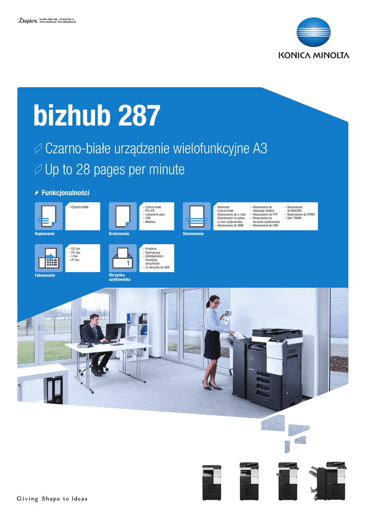 bizhub 287 Czarno-białe urządzenie wielofunkcyjne A3 Up to 28 pages per minute Funkcjonalności –Czarno-białe Kopiowanie Drukowanie –G3 Fax –PC-Fax –i-Fax –IP-Fax Faksowanie –Czarno-białe –PCL/PS –Lokalne/w sieci –USB –Mobilna 1 Skrzynka użytkownika –Kolorowe –Czarno-białe –Skanowanie do e-mail –Skanowanie na adres e-mail użytkownika –Skanowanie do SMB Skanowanie –Przedruk –Dystrybucja –Udostępnianie Pomiędzy skrzynkami –Ze skrzynki do USB –Skanowanie do własnego folderu –Skanowanie do FTP –Skanowanie do skrzynki użytkownika –Skanowanie do USB –Skanowanie do WebDAV –Skanowanie do DPWS –Sieć TWAIN BROSZURA bizhub 287 SPECYFIKACJE DRUKARKI Funkcje faksu Rozdzielczość drukowania Język opisu strony Systemy operacyjne SPECYFIKACJE SKRZYNKI UŻYTKOWNIKA Drukowanie mobilne PCL6 (PCL 5 + XL 3.0); PostScript 3 (CPSI 3016); XPS Windows VISTA (32/64) Windows 7 (32/64) Windows 8 (32/64) Windows 8,1 (32/64) Serwer Windows 2003/2003 R2 Serwer Windows 2008/2008 R2 (32/64) Serwer Windows 2012/2012 R2 (64) Macintosh OS X 10.x Unix; Linux; Citrix 80 PCL Latin, 137 PostScript 3 Emulation Latin Bezpośredni wydruk plików PCL; PS; TIFF; XPS; PDF (v1.7) szyfrowanych plików PDF i OOXML (DOCX; XLSX; PPTX); Mixmedia i Mixplex; programowanie zadań “Easy Set”; nakładka; znak wodny; tryb "carbon copy" AirPrint (iOS); Mopria (Android); Google Cloud Print (opcjonalnie); WiFi Direct (opcjonalnie); Konica Minolta Print Service (Android); PageScope Mobile (iOS i Android); NFC Authentication and Pairing (Android) Szybkość skanowania (z dodatkowym podajnikiem dokumentów) (mono/kolor) Rozdzielczość skanowania Tryby skanowania Formaty plików Miejsca przeznaczenia skanowanych dokumentów Funkcje skanowania Rozdzielczość faksu Kompresja faksu Modem faksu Miejsca przeznaczenia dokumentów przesyłanych faksem Typ skrzynek systemo- Bezpieczny druk wych Druk szyfrowanych PDF Odbiór faksu Odpytywanie faksu Funkcje skrzynek użyt- Przedruk; kombinacja kownika Pobieranie Wysyłanie (e-mail/FTP/SMB i faks) Kopiowanie ze skrzynki do skrzynki FUNKCJE SYSTEMU Do 45 obrazów/min. Maks. 600 x 600 dpi Skanowanie do e-mail (Scan-to-Me) Skanowanie do SMB (Scan-to-Home) Skanowanie do FTP Skanowanie do skrzynki użytkownika Skanowanie do USB Skanowanie do WebDAV Skanowanie do DPWS Skanowanie sieciowe Twain TIFF; PDF; Kompaktowy PDF; JPEG; XPS; Kompaktowy XPS; DOCX; XLSX; przeszukiwalny PDF; PDF/A; lineraryzowany PDF 2 100 (pojedynczo i grupami); obsługa LDAP Komentarze (tekst/godzina/data) dla PDF; do 400 programów prac; Podgląd skanowania w czasie rzeczywistym SPECYFIKACJA FAKSU Standard faksu Transmisja faksu Maks. liczba dokumen- Do 3 000 dokumentów lub 10 000 stron tów w pamięci Typ skrzynek użytkow- Publiczny nika Prywatny (z hasłem lub uwierzytelnieniem) Grupowy (z uwierzytelnieniem) Bezpieczeństwo SPECYFIKACJA SKANERA G3 Analogowa i-Fax Kolorowy i-Fax (RFC3949-C) IP-Fax Maks.: 600 x 600 dpi (ultra-fine) MH; MR; MMR; JBIG Do 33,6 Kbps 2 100 (pojedynczo i grupami) Odpytywanie; przesunięcie czasowe; PC-Faks; odbiór do skrzynki poufnej; Odbiór do e-mail/FTP/SMBB; do 400 programów zadań Rozliczanie Oprogramowanie ISO 15408 EAL3 (w trakcie oceny); filtrowanie IP i blokowanie portów; komunikacja sieciowa SSL2; SSL3 i TSL1.0; obsługa IPsec; obsługa IEEE 802.1x; uwierzytelnianie użytkowników; rejestr uwierzytelniania; bezpieczne drukowanie; nadpisywanie dysku twardego (8 metod); szyfrowanie danych na dysku twardym (AES 246); automatyczne usuwanie danych z pamięci; odbiór poufnych faksów; szyfrowanie danych druku użytkownika Do 1000 kont użytkowników; Obsługa Active Directory (nazwa użytkownika + hasło + e-mail + folder smb) Definiowanie dostępu do funkcji użytkownika Uwierzytelnianie biometryczne (skaner naczyń krwionośnych w palcu) opcjonalnie Uwierzytelnianie kart ID (czytnik kart ID) opcjonalnie PageScope Net Care Device Manager PageScope Data Administrator PageScope Box Operator PageScope Direct Print Print Status Notifier Driver Packaging Utility Log Management Utility –– Wszystkie specyfikacje dotyczą papieru o rozmiarze A4 i gramaturze 80 g/m2. –– Obsługa i dostępność wymienionych specyfikacji i opcji może różnić się w zależności od systemów operacyjnych, aplikacji, protokołów sieciowych oraz konfiguracji sieci i systemu. –– Deklarowana trwałość materiałów eksploatacyjnych zależy od warunków eksploatacji takich jak pokrycie strony w danym formacie (5% pokrycia A4). Rzeczywista wydajność użytkowa materiału eksploatacyjnego zmienia się w zależności od sposobu użytkowania oraz pod wpływem takich zmiennych jak pokrycie papieru, format strony, rodzaj nośnika, praca ciągła lub przerywana, temperatura otoczenia i wilgotność. –– Na niektórych ilustracjach widoczne jest wyposażenie dodatkowe. –– Specyfikacja i dane wyposażenia dodatkowego oparte są na informacjach dostępnych w momencie wydruku i mogą zostać zmienione bez uprzedniego powiadomienia. –– Firma Konica Minolta nie gwarantuje bezbłędności podawanych specyfikacji. –– Wszystkie inne nazwy marek i produktów mogą być zastrzeżonymi znakami handlowymi lub znakami handlowymi, które należą do odpowiednich właścicieli, co niniejszym zostaje uznane. Duplexinfolinia 801 000 169tel 33 816 06 11 , 33 816 59 [email protected] Zapraszamy do odwiedzenia naszej strony z produktami Konica Minolta Business Solutions Polska Sp. z o.o. ul. Muszkieterów 15 02-273 Warszawa Polska www.konicaminolta.pl 05/2015 Czcionki drukarki Funkcje drukowania 1 800 (odpowiednik) x 600 dpi