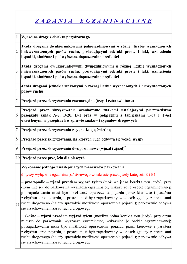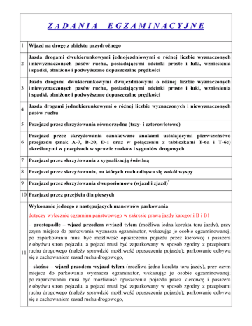 ZADANIA EGZAMINACYJNE 1 Wjazd na drogę z obiektu przydrożnego Jazda drogami dwukierunkowymi jednojezdniowymi o różnej liczbie wyznaczonych 2 i niewyznaczonych pasów ruchu, posiadającymi odcinki proste i łuki, wzniesienia i spadki, obniżone i podwyższone dopuszczalne prędkości Jazda drogami dwukierunkowymi dwujezdniowymi o różnej liczbie wyznaczonych 3 i niewyznaczonych pasów ruchu, posiadającymi odcinki proste i łuki, wzniesienia i spadki, obniżone i podwyższone dopuszczalne prędkości 4 Jazda drogami jednokierunkowymi o różnej liczbie wyznaczonych i niewyznaczonych pasów ruchu 5 Przejazd przez skrzyżowania równorzędne (trzy- i czterowlotowe) Przejazd przez skrzyżowania oznakowane znakami ustalającymi pierwszeństwo 6 przejazdu (znak A-7, B-20, D-1 oraz w połączeniu z tabliczkami T-6a i T-6c) określonymi w przepisach w sprawie znaków i sygnałów drogowych 7 Przejazd przez skrzyżowania z sygnalizacją świetlną 8 Przejazd przez skrzyżowania, na których ruch odbywa się wokół wyspy 9 Przejazd przez skrzyżowania dwupoziomowe (wjazd i zjazd)* 10 Przejazd przez przejścia dla pieszych Wykonanie jednego z następujących manewrów parkowania dotyczy wyłącznie egzaminu państwowego w zakresie prawa jazdy kategorii B i B1 – prostopadłe – wjazd przodem wyjazd tyłem (możliwa jedna korekta toru jazdy), przy czym miejsce do parkowania wyznacza egzaminator, wskazując je osobie egzaminowanej; po zaparkowaniu musi być możliwość opuszczenia pojazdu przez kierowcę i pasażera z obydwu stron pojazdu, a pojazd musi być zaparkowany w sposób zgodny z przepisami 11 ruchu drogowego (należy sprawdzić możliwość opuszczenia pojazdu); parkowanie odbywa się z zachowaniem zasad ruchu drogowego, – skośne – wjazd przodem wyjazd tyłem (możliwa jedna korekta toru jazdy), przy czym miejsce do parkowania wyznacza egzaminator, wskazując je osobie egzaminowanej; po zaparkowaniu musi być możliwość opuszczenia pojazdu przez kierowcę i pasażera z obydwu stron pojazdu, a pojazd musi być zaparkowany w sposób zgodny z przepisami ruchu drogowego (należy sprawdzić możliwość opuszczenia pojazdu); parkowanie odbywa się z zachowaniem zasad ruchu drogowego, – równoległe pomiędzy dwoma pojazdami (manewr jest wykonywany, jeżeli jest możliwe wyznaczenie miejsca do parkowania – możliwa jedna korekta toru jazdy) – wjazd tyłem wyjazd przodem, przy czym miejsce do parkowania wyznacza egzaminator, wskazując je osobie egzaminowanej; długość miejsca do parkowania pomiędzy pojazdami powinna stanowić około 2-krotność długości pojazdu egzaminacyjnego; w trakcie wykonywania manewru możliwa jedna korekta toru jazdy; po zaparkowaniu pojazd nie może stwarzać zagrożenia dla bezpieczeństwa ruchu drogowego; w przypadku gdy pojazd parkuje równolegle do krawężnika, w trakcie wykonywania manewru nie może najechać na krawężnik. W przypadku błędnego wykonania manewru parkowania możliwe jest wykonanie manewru w innym miejscu wskazanym przez egzaminatora, a w razie braku możliwości znalezienia miejsca do wykonania manewru dopuszcza się zamiennie wykonanie innego manewru parkowania. Wykonanie, z zachowaniem zasad ruchu drogowego, manewru zawracania na drodze jednojezdniowej dwukierunkowej dotyczy wyłącznie egzaminu państwowego w zakresie prawa jazdy kategorii B1 i B 12 – możliwość wykonania manewru przy wykorzystaniu infrastruktury drogowej (bramy, wjazdy, podjazdy, zatoczki itp.), – zawracanie musi odbyć się przy użyciu biegu wstecznego, – miejsce do zawracania wyznacza egzaminator 13 Przejazd przez torowisko tramwajowe** i kolejowe* 14 Przejazd przez tunel* 15 Przejazd obok przystanku tramwajowego** i autobusowego 16 Wykonanie manewru wyprzedzania 17 Wykonanie manewru omijania 18 Wykonanie manewru wymijania (dla kategorii A1, A2, A przy prędkości co najmniej 50 km/h) 19 Wykonanie manewru zmiany pasa ruchu 20 Wykonanie manewru zmiany kierunku jazdy w prawo 21 Wykonanie manewru zmiany kierunku jazdy w lewo 22 Wykonanie manewru zawracania na skrzyżowaniu Hamowanie od prędkości co najmniej 50 km/h do zatrzymania we wskazanym przez 23 egzaminatora miejscu (manewr może być wykonany na placu manewrowym ośrodka egzaminowania) manewr nie dotyczy kategorii AM i T prawa jazdy Hamowanie wykonywane w sytuacjach awaryjnych - obowiązkowo w zakresie prawa jazdy kategorii AM, A1, A2 i A, 24 - w przypadku pozostałych kategorii nieobowiązkowe - w przypadku prawa jazdy kategorii A1, A2 i A hamowanie awaryjne musi być wykonane przy prędkości minimum 50 km/h przy użyciu przedniego i tylnego hamulca motocykla, - manewr może być wykonany na placu manewrowym ośrodka egzaminowania Rozprzęganie pojazdu z przyczepą – zadanie realizowane po powrocie na plac manewrowy ośrodka egzaminowania lub po wykonaniu zadań na placu manewrowym – na wykonanie zadania osoba egzaminowana ma nie więcej niż 10 minut. Sposób wykonania zadania: – zaciągnięcie hamulca postojowego pojazdu silnikowego i unieruchomienie silnika, 25 – zabezpieczenie pojazdu silnikowego i przyczepy przed samoczynnym przemieszczeniem się (użycie klinów lub hamulca postojowego przyczepy), – odłączenie przewodów elektrycznych i hamulcowych we właściwej kolejności (zabezpieczenie ich przed zabrudzeniem poprzez umieszczenie ich we właściwym miejscu), – wysunięcie podpory, jeżeli zaczep przyczepy jest wyposażony w podporę, – rozłączenie pojazdu z przyczepą (odjechanie pojazdem), – ustawienie pojazdu obok przyczepy Zmiana biegów właściwa dla energooszczędnej jazdy - dotyczy wyłącznie egzaminu państwowego przeprowadzanego w zakresie prawa jazdy kategorii B, B+E, C1, C1+E, C, C+E, D1, D1+E, D i D+E; - w zakresie prawa jazdy kategorii B i B+E osoba egzaminowana powinna dokonywać 26 zmiany biegu na wyższy w momencie, kiedy silnik osiągnie od 1800 do 2600 obrotów na minutę, a pierwsze cztery biegi powinny być włączone zanim pojazd